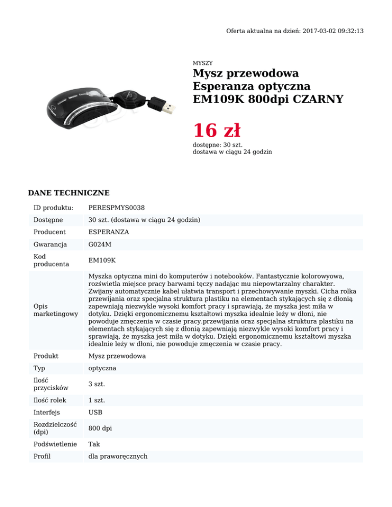 Oferta aktualna na dzień: 2017-03-02 09:32:13 MYSZY Mysz przewodowa Esperanza optyczna EM109K 800dpi CZARNY 16 zł dostępne: 30 szt. dostawa w ciągu 24 godzin DANE TECHNICZNE ID produktu: PERESPMYS0038 Dostępne 30 szt. (dostawa w ciągu 24 godzin) Producent ESPERANZA Gwarancja G024M Kod producenta EM109K Opis marketingowy Myszka optyczna mini do komputerów i notebooków. Fantastycznie kolorowyowa, rozświetla miejsce pracy barwami tęczy nadając mu niepowtarzalny charakter. Zwijany automatycznie kabel ułatwia transport i przechowywanie myszki. Cicha rolka przewijania oraz specjalna struktura plastiku na elementach stykających się z dłonią zapewniają niezwykle wysoki komfort pracy i sprawiają, że myszka jest miła w dotyku. Dzięki ergonomicznemu kształtowi myszka idealnie leży w dłoni, nie powoduje zmęczenia w czasie pracy.przewijania oraz specjalna struktura plastiku na elementach stykających się z dłonią zapewniają niezwykle wysoki komfort pracy i sprawiają, że myszka jest miła w dotyku. Dzięki ergonomicznemu kształtowi myszka idealnie leży w dłoni, nie powoduje zmęczenia w czasie pracy. Produkt Mysz przewodowa Typ optyczna Ilość przycisków 3 szt. Ilość rolek 1 szt. Interfejs USB Rozdzielczość (dpi) 800 dpi Podświetlenie Tak Profil dla praworęcznych Długość przewodu 0,7 m Sposób zasilania port USB Kolor czarny Strona www produktu http://esperanza.pl/esperanza-mysz-em109k-celaneo-mini-opt--usb-czarna,201,59.html Podane ceny są cenami brutto. ** Mimo dołożenia wszelkich starań nie gwarantujemy, że publikowane dane techniczne nie zawierają uchybień lub błędów. Ewentualne błędne opisy nie mogą być podstawą do roszczeń, dlatego w przypadku jakichkolwiek wątpliwości prosimy przed podjęciem decyzji o zakupie o kontakt z handlowcem. * GALERIA