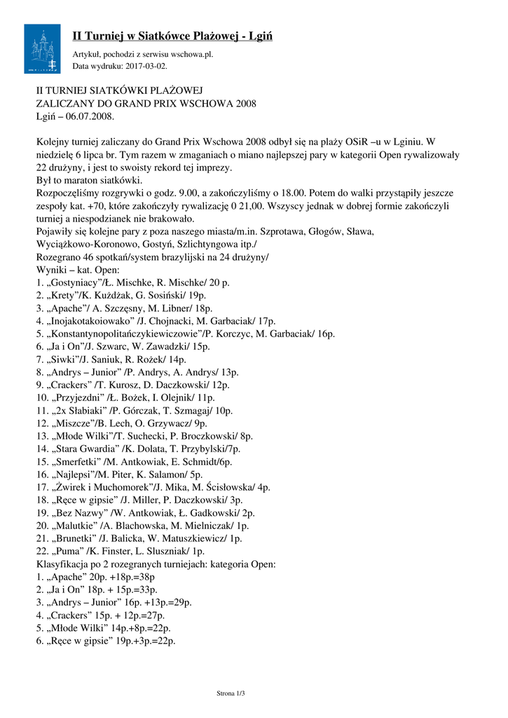 II Turniej w Siatkówce Plażowej - Lgiń Artykuł‚ pochodzi z serwisu wschowa.pl. Data wydruku: 2017-03-02. II TURNIEJ SIATKÓWKI PLAŻOWEJ ZALICZANY DO GRAND PRIX WSCHOWA 2008 Lgiń – 06.07.2008. Kolejny turniej zaliczany do Grand Prix Wschowa 2008 odbył się na plaży OSiR –u w Lginiu. W niedzielę 6 lipca br. Tym razem w zmaganiach o miano najlepszej pary w kategorii Open rywalizowały 22 drużyny, i jest to swoisty rekord tej imprezy. Był to maraton siatkówki. Rozpoczęliśmy rozgrywki o godz. 9.00, a zakończyliśmy o 18.00. Potem do walki przystąpiły jeszcze zespoły kat. +70, które zakończyły rywalizację 0 21,00. Wszyscy jednak w dobrej formie zakończyli turniej a niespodzianek nie brakowało. Pojawiły się kolejne pary z poza naszego miasta/m.in. Szprotawa, Głogów, Sława, Wyciążkowo-Koronowo, Gostyń, Szlichtyngowa itp./ Rozegrano 46 spotkań/system brazylijski na 24 drużyny/ Wyniki – kat. Open: 1. „Gostyniacy”/Ł. Mischke, R. Mischke/ 20 p. 2. „Krety”/K. Kużdżak, G. Sosiński/ 19p. 3. „Apache”/ A. Szczęsny, M. Libner/ 18p. 4. „Inojakotakoiowako” /J. Chojnacki, M. Garbaciak/ 17p. 5. „Konstantynopolitańczykiewiczowie”/P. Korczyc, M. Garbaciak/ 16p. 6. „Ja i On”/J. Szwarc, W. Zawadzki/ 15p. 7. „Siwki”/J. Saniuk, R. Rożek/ 14p. 8. „Andrys – Junior” /P. Andrys, A. Andrys/ 13p. 9. „Crackers” /T. Kurosz, D. Daczkowski/ 12p. 10. „Przyjezdni” /Ł. Bożek, I. Olejnik/ 11p. 11. „2x Słabiaki” /P. Górczak, T. Szmagaj/ 10p. 12. „Miszcze”/B. Lech, O. Grzywacz/ 9p. 13. „Młode Wilki”/T. Suchecki, P. Broczkowski/ 8p. 14. „Stara Gwardia” /K. Dolata, T. Przybylski/7p. 15. „Smerfetki” /M. Antkowiak, E. Schmidt/6p. 16. „Najlepsi”/M. Piter, K. Salamon/ 5p. 17. „Żwirek i Muchomorek”/J. Mika, M. Ścisłowska/ 4p. 18. „Ręce w gipsie” /J. Miller, P. Daczkowski/ 3p. 19. „Bez Nazwy” /W. Antkowiak, Ł. Gadkowski/ 2p. 20. „Malutkie” /A. Blachowska, M. Mielniczak/ 1p. 21. „Brunetki” /J. Balicka, W. Matuszkiewicz/ 1p. 22. „Puma” /K. Finster, L. Sluszniak/ 1p. Klasyfikacja po 2 rozegranych turniejach: kategoria Open: 1. „Apache” 20p. +18p.=38p 2. „Ja i On” 18p. + 15p.=33p. 3. „Andrys – Junior” 16p. +13p.=29p. 4. „Crackers” 15p. + 12p.=27p. 5. „Młode Wilki” 14p.+8p.=22p. 6. „Ręce w gipsie” 19p.+3p.=22p. Strona 1/3 II Turniej w Siatkówce Plażowej - Lgiń Artykuł‚ pochodzi z serwisu wschowa.pl. Data wydruku: 2017-03-02. 7. „Gostyniacy” 0p. + 20p.= 20p. 8. „Stara Gwardia” 13p. + 7p. =20p. 9. „Krety” 0 + 19p. =19p. 10. „Miszcze” 10p. + 9p. = 19p. 11. „2x Słabiaki” 8p. + 10p. =18p. 12. „Inojakotakoiowako” 0p. + 17p. =17p. 13. „Najlepsi” 12p. + 5p. =17p. 14. „Errors 403” 17p. + 0p.=17p. 15. „Konstantynopolitańczykiewiczowie” 0p. + 16p. 16p. 16. „Żwirek i Muchomorek” 11p. + 4p. =15p. 17. „Siwki” 0p. + 14p. = 14p. 18. „Smerfetki” 7p. + 6p. = 13p. 19. „Przyjezdni” 0p. + 11p. =11p. 20. „A-Team” 10p. + 0p.=10p. 21. „Malutkie” 7p. + 1p. =8p. 22. „Po prostu Blondynki” 7p. + 0p.=7p. 23. „Brunetki” 4p. + 1p. = 5p. 24. „Bez Nazwy” 0p. + 2p.=2p. 25. „Puma” 0p. +1p. = 1p. Wyniki – kategoria +70 1. „Andrys – Senior”/ T. Andrys, E. Andrys/ 20p. 2. „Kuzyni” /P. Sadłoń, S. Juryta/ 19p. 3. „Brachole”/Z. Gadkowski, R. Gadkowski/ 18p. 4. „Bax – Mix” 17p. 5. „Pawły – Team” /P. Antkowiak, G. Bachorski/ 16p. 6. „Młodziaki”/ H. Cieślak, P. Sikora/ 15p. 7. „Domki +”/P. Chałupka, D. Janowicz/ 14p. Klasyfikacja po 2 rozegranych Turniejach – kategoria +70 1. „Andrys – Senior” 20p.+20p.=40p. 2. „Brachole” 19p.+18p. =37p. 3. „Pawły – Team” 18p. + 16p. = 34p. 4. „Kuzyni” 0p. + 19p. = 19p. 5. „Bax – Mix” 0p. + 17p.= 17p. 6. „Młodziaki” 0p. + 15p. = 15p. 7. „Domki +” 0p. +14p. = 14p. Klasyfikacja dziewcząt po 2 turniejach 1. „Miszcze” 18p. + 20p. = 38p. 2. „Smerfetki” 18p. + 19p. = 37p. 3. „Żwirek i Muchomorek” 19p. + 18p. = 37p. 4. „Malutkie” 18p. + 17p. =35p. 5. „Brunetki” 17p. + 16p. = 33p. 6. „Najlepsze” 20p. + 0p. = 20p. 7. „Po Prostu Blondynki” 18p. + 0p. = 18p. Drużyny, które zajmą w klasyfikacji dziewcząt miejsca 1-3 zagrają w mini- turnieju finałowym o miano Strona 2/3 II Turniej w Siatkówce Plażowej - Lgiń Artykuł‚ pochodzi z serwisu wschowa.pl. Data wydruku: 2017-03-02. najlepszej pary tej kategorii. Zapraszamy na kolejne turnieje: 12 lipca 2008 /sobota/ Turniej o „Nagrodę Lgina” niezaliczany do GP 2008 /II Dni Jeziora Lgińskiego/ godz. 11.00, plaża główna OSiR – Lgiń 13 lipca 2008 /niedziela/ II Turniej Trójek Siatkarskich – zaliczany do GP Wschowa 2008, godz. 12.00, plaża główna OSiR Lgiń. Strona 3/3 Powered by TCPDF (www.tcpdf.org)