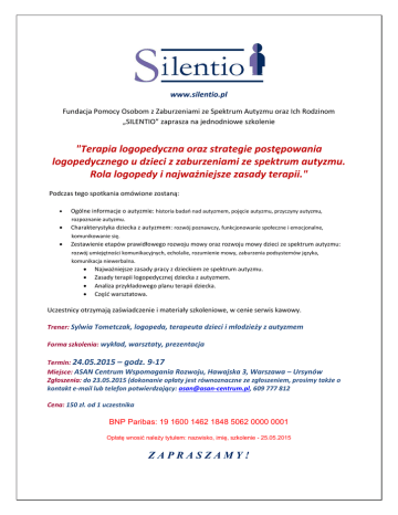 www.silentio.pl Fundacja Pomocy Osobom z Zaburzeniami ze Spektrum Autyzmu oraz Ich Rodzinom „SILENTIO” zaprasza na jednodniowe szkolenie "Terapia logopedyczna oraz strategie postępowania logopedycznego u dzieci z zaburzeniami ze spektrum autyzmu. Rola logopedy i najważniejsze zasady terapii." Podczas tego spotkania omówione zostaną: Ogólne informacje o autyzmie: historia badań nad autyzmem, pojęcie autyzmu, przyczyny autyzmu, Charakterystyka dziecka z autyzmem: rozwój poznawczy, funkcjonowanie społeczne i emocjonalne, Zestawienie etapów prawidłowego rozwoju mowy oraz rozwoju mowy dzieci ze spektrum autyzmu: rozpoznanie autyzmu. komunikowanie się. rozwój umiejętności komunikacyjnych, echolalie, rozumienie mowy, zaburzenia podsystemów języka, komunikacja niewerbalna. Najważniejsze zasady pracy z dzieckiem ze spektrum autyzmu. Zasady terapii logopedycznej dziecka z autyzmem. Analiza przykładowego planu terapii dziecka. Część warsztatowa. Uczestnicy otrzymają zaświadczenie i materiały szkoleniowe, w cenie serwis kawowy. Trener: Sylwia Tometczak, logopeda, terapeuta dzieci i młodzieży z autyzmem Forma szkolenia: wykład, warsztaty, prezentacja Termin: 24.05.2015 – godz. 9-17 Miejsce: ASAN Centrum Wspomagania Rozwoju, Hawajska 3, Warszawa – Ursynów Zgłoszenia: do 23.05.2015 (dokonanie opłaty jest równoznaczne ze zgłoszeniem, prosimy także o kontakt e-mail lub telefon potwierdzający: [email protected], 609 777 812 Cena: 150 zł. od 1 uczestnika BNP Paribas: 19 1600 1462 1848 5062 0000 0001 Opłatę wnosić należy tytułem: nazwisko, imię, szkolenie - 25.05.2015 ZAPRASZAMY!