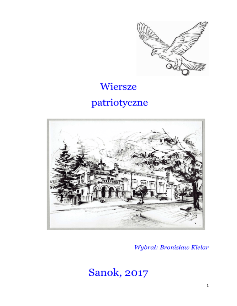 Wiersze patriotyczne Wybrał: Bronisław Kielar Sanok, 2017 1 Rozkaz na pierwszą rocznicę wojny – wydany przez J. Piłsudskiego w Ożarowie pod Lubartowem 5.08.1915 r. Żołnierze! Rok temu z garścią małą ludzi, źle uzbrojonych i źle wyposażonych, rozpocząłem wojnę. Cały świat stanął wtedy do boju. Nie chciałem pozwolić, by w czasie, gdy na żywym ciele naszej Ojczyzny miano wyrąbać mieczami nowe granice państw i narodów, samych tylko Polaków przy tym brakowało. Nie chciałem dopuścić, by na szalach losów ważących się nad naszymi głowami, na szalach, na które miecze rzucano - zabrakło szabli polskiej. Że szabla nasza była mała, że nie była godna wielkiego dwudziestomilionowego narodu. Nie nasza w tym wina. Żołnierze! Poszliście za moim rozkazem bez wahania, bez chwili namysłu, czy los Wasz nie będzie podobny do losu tylu poprzedzających nas pokoleń żołnierzy Polskich. Poszliście by stanąć w obronie jeśli już nie szczęścia Ojczyzny to przynajmniej jej honoru. Wyrobił się z nas ten typ żołnierza jakiego nie znała dotąd Polska. Z młodego chłopaka w naszej atmosferze wyrabia się szybko, spokojny, równy, stary żołnierz. Przygotowany na długą żmudną pracę, nie spalający się jak słoma w pierwszym drobnym ogniu. Żołnierze i towarzysze broni, i teraz jak na początku jesteśmy tylko awangardą wojenną Polski, a także jej awangardą moralną z umiejętnością zaryzykowania wszystkiem gdy ryzyko jest konieczne. Żołnierze! Smutno mi, że powinszować wam olbrzymich triumfów nie mogę, lecz dumny jestem, że dzisiaj z większym spokojem mogę do Was jak ongi zawołać. Chłopcy naprzód, na śmierć czy na życie, na zwycięstwo czy na klęski. Idźcie czynem wojennym budzić Polskę do zmartwychwstania. ============== PRZYSIĘGA ARMII KRAJOWEJ - „W obliczu Boga Wszechmogącego i Najświętszej Marii panny Królowej Korony Polskiej, kładę swe ręce na ten święty Krzyż, znak Męki i Zbawienia, przysięgam być wiernym Ojczyźnie mej, Rzeczypospolitej Polskiej, stać nieugięcie na straży Jej honoru o i wyzwolenie jej z niewoli walczyć ze wszystkich sił aż do ofiary mego życia. Prezydentowi Rzeczypospolitej Polskiej i rozkazom naczelnego Wodza oraz wyznaczonemu przezeń Dowódcy Armii Krajowej będę bezwzględnie posłuszny, a tajemnicy niezłomnie dochowam, cokolwiek by mnie spotkać miało". - „Przyjmuję Cię w szeregi żołnierzy Armii Polskiej, walczącej z wrogiem w konspiracji o wyzwolenie Ojczyzny. Twym obowiązkiem będzie walczyć z bronią w ręku. Zwycięstwo będzie Twoją nagrodą, zdrada karana jest śmiercią". ===================== 2 Jan Lechoń, Polonia Resurrecta Da Bóg nam kiedyś zasiąść w Polsce wolnej, Od żyta złotej, od lasów szumiącej, Da Bóg, a przyjdzie dzień nieustający Dla srebrnych pługów udręki mozolnej. Jeszcze oddźwiękną kamienie na młoty I z twardym ziemia pogada lemieszem, I z wszystkich jeszcze kamieni wykrzeszem Iskier snop złoty. Więc gdy wiosennym oglądam wieczorem W mgły otuloną zagonów szarzyznę, Ktoś w moim sercu wykuwa toporem Moją ojczyznę. ========== Józef Relidzyński, „Naprzód" Pójdziemy naprzód, nigdy wstecz. Ze starem hasłem naszem: z krwi pospolitą tworząc Rzecz bagnetem i pałaszem, rosnącą szlakiem naszych dróg. Tak nam dopomóż Bóg! Jako lawina śnieżna z gór, na łeb spadniemy wroga; o piersi naszych żywy mur rozbije się czerń sroga, by fale mórz o skalny próg. Tak nam dopomóż Bóg! Na kresach pełniąc czujna straż, Wytrwamy, Polsko, wiernie, czy laur uwieńczy sztandar nasz, czy go oplotą ciernie, Wolności Twej my krwawy pług. Tak nam dopomóż Bóg! Zbrój się, Narodzie, zbrój się, zbrój! Zygmuntów dzwon Ci dzwoni! O wojsku śpiącym sen się Twój dziś jawi... hej! Do broni! Pierzchnie śmiertelny przed nim wróg. Tak nam dopomóż Bóg! Zbudź się! Kajdany rdzawe rwij! Na polska glebę żyzną upadnie krew a wiosną z krwi rozkwitniesz nam, ojczyzną, w słońcu, co legnie Ci u nóg. Tak nam dopomóż Bóg! ==================== 3 Jan Lechoń, „Piłsudski" – fragment Otworzyć wszystkie okna! Niech ludzie zobaczą!! Wielkimi ulicami morze głów urasta I czujesz, że rozpękną ulice się miasta, Że Bogu się jak groźba położą pod tronem I krzykną wielką ciszą... lub głosów milionem. A teraz tylko czasem kobieta zapłacze. Aż nagle na katedrze zagrali trębacze!! Mariackim zrazu cicho śpiewają kurantem, A później, później bielą, później amarantem, Później dzielą się bielą i krwią, i szaleństwem, Wyrzucają z trąb radość i miłość z przekleństwem, I dławią się wzruszeniem, i płakać nie mogą, I nie chrypią, lecz sypią w tłum radosną trwogą A ranek, mroźny ranek sypie w oczy świtem. A konie? Konie walą o ziemię kopytem Konnica ma rabaty pełne galanterii Lansjery-bohatery! Czołem kawalerii! Hej, kwiaty na armaty! Żołnierzom do dłoni! Katedra oszalała! Ze wszystkich sił dzwoni. Księża idą z katedry w czerwieni i złocie. Białe kwiaty padają pod stopy piechocie. Szeregi za szeregiem, Sztandary, Sztandary. A On mówić nie może, Mundur na nim szary ============ Do broni!, Fragmenty – autor anonimowy – 1794 Do broni, żywo do broni! Żyje Polska, żyje sława, Chwytaj zbroję, siodłaj koni, Dobra nasza z Bogiem sprawa! Hej, bracia, żywo i śmiele, W kim dusza gore cnotliwa, Dzielny Kościuszko na czele I ojczyzna nas wzywa! (...) Ojczyzno droga i luba, Krew to twoja, co w nas płynie, Nie upadnie twoja chluba, Aż ostatni z nas nie zginie. Żyjem, póki twego bycia, Bóg twoim synom pomoże, Niewart ciebie, niewart życia, Kto w niewoli żyć może! ============== 4 „Póki my żyjemy" – Julian Przyboś – wrzesień 1939 Huk armat na wysokość łun wzrósł, niebo wali się z trzaskiem. Bezbronny, wbity pociskami w grunt, błagam o karabin jak skazaniec o łaskę i tylko krzyczę - niecelnie, z rannych i z martwych wstaw