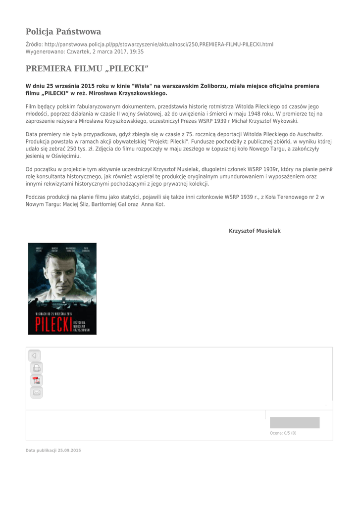 Policja Państwowa Źródło: http://panstwowa.policja.pl/pp/stowarzyszenie/aktualnosci/250,PREMIERA-FILMU-PILECKI.html Wygenerowano: Czwartek, 2 marca 2017, 19:35 PREMIERA FILMU „PILECKI” W dniu 25 września 2015 roku w kinie "Wisła" na warszawskim Żoliborzu, miała miejsce oficjalna premiera filmu „PILECKI” w reż. Mirosława Krzyszkowskiego. Film będący polskim fabularyzowanym dokumentem, przedstawia historię rotmistrza Witolda Pileckiego od czasów jego młodości, poprzez działania w czasie II wojny światowej, aż do uwięzienia i śmierci w maju 1948 roku. W premierze tej na zaproszenie reżysera Mirosława Krzyszkowskiego, uczestniczył Prezes WSRP 1939 r Michał Krzysztof Wykowski. Data premiery nie była przypadkowa, gdyż zbiegła się w czasie z 75. rocznicą deportacji Witolda Pileckiego do Auschwitz. Produkcja powstała w ramach akcji obywatelskiej "Projekt: Pilecki". Fundusze pochodziły z publicznej zbiórki, w wyniku której udało się zebrać 250 tys. zł. Zdjęcia do filmu rozpoczęły w maju zeszłego w Łopusznej koło Nowego Targu, a zakończyły jesienią w Oświęcimiu. Od początku w projekcie tym aktywnie uczestniczył Krzysztof Musielak, długoletni członek WSRP 1939r, który na planie pełnił rolę konsultanta historycznego, jak również wspierał tę produkcję oryginalnym umundurowaniem i wyposażeniem oraz innymi rekwizytami historycznymi pochodzącymi z jego prywatnej kolekcji. Podczas produkcji na planie filmu jako statyści, pojawili się także inni członkowie WSRP 1939 r., z Koła Terenowego nr 2 w Nowym Targu: Maciej Śliz, Bartłomiej Gal oraz Anna Kot. Krzysztof Musielak Ocena: 0/5 (0) Data publikacji 25.09.2015