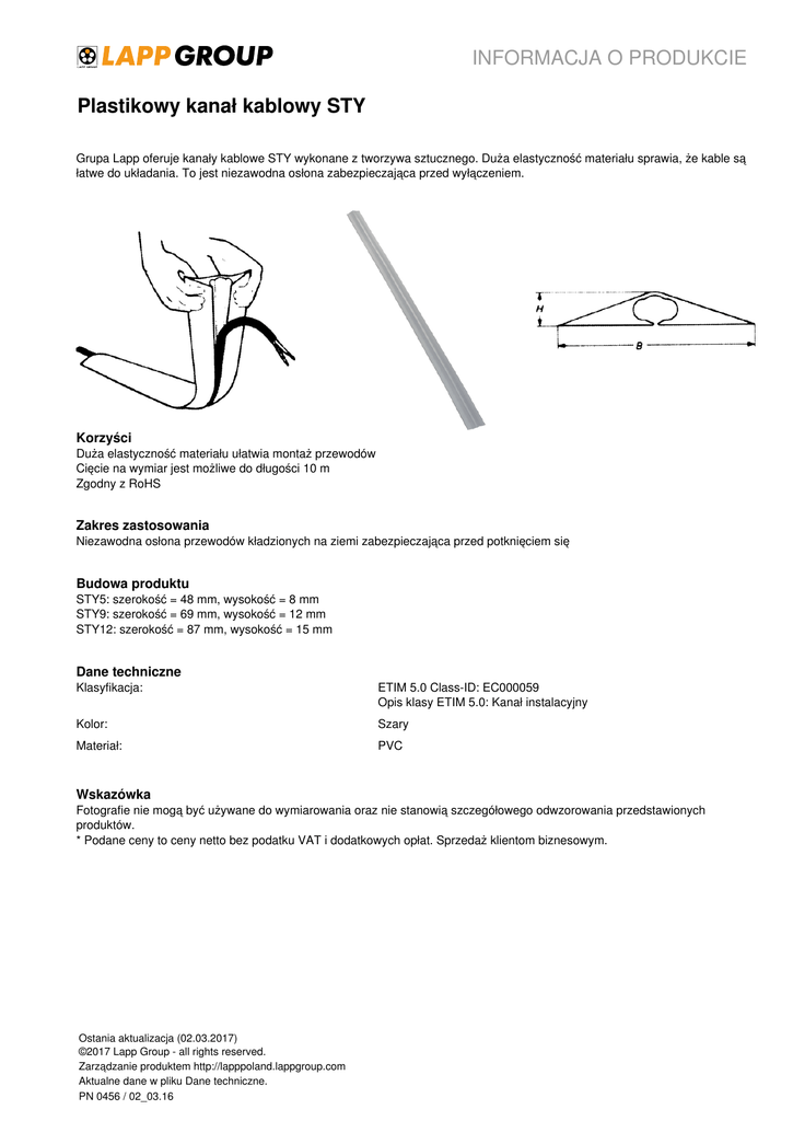 INFORMACJA O PRODUKCIE Plastikowy kanał kablowy STY Grupa Lapp oferuje kanały kablowe STY wykonane z tworzywa sztucznego. Duża elastyczność materiału sprawia, że kable są łatwe do układania. To jest niezawodna osłona zabezpieczająca przed wyłączeniem. Korzyści Duża elastyczność materiału ułatwia montaż przewodów Cięcie na wymiar jest możliwe do długości 10 m Zgodny z RoHS Zakres zastosowania Niezawodna osłona przewodów kładzionych na ziemi zabezpieczająca przed potknięciem się Budowa produktu STY5: szerokość = 48 mm, wysokość = 8 mm STY9: szerokość = 69 mm, wysokość = 12 mm STY12: szerokość = 87 mm, wysokość = 15 mm Dane techniczne Klasyfikacja: ETIM 5.0 Class-ID: EC000059 Opis klasy ETIM 5.0: Kanał instalacyjny Kolor: Szary Materiał: PVC Wskazówka Fotografie nie mogą być używane do wymiarowania oraz nie stanowią szczegółowego odwzorowania przedstawionych produktów. * Podane ceny to ceny netto bez podatku VAT i dodatkowych opłat. Sprzedaż klientom biznesowym. Ostania aktualizacja (02.03.2017) ©2017 Lapp Group - all rights reserved. Zarządzanie produktem http://lapppoland.lappgroup.com Aktualne dane w pliku Dane techniczne. PN 0456 / 02_03.16 Powered by TCPDF (www.tcpdf.org) Szerokość x wysokość [mm] Liczba kabli x średnica zewnętrzna 61746870 STY 5 48 x 8 1x5-2x4 61746880 STY 9 69 x 12 1x9-2x7 61746890 STY 12 87 x 15 1 x 12 - 2 x 9 Plastikowy kanał kablowy STY Opis produktu Ostania aktualizacja (02.03.2017) ©2017 Lapp Group - all rights reserved. Zarządzanie produktem http://lapppoland.lappgroup.com Aktualne dane w pliku Dane techniczne. PN 0456 / 02_03.16 INFORMACJA O PRODUKCIE Powered by TCPDF (www.tcpdf.org) Numer katalogowy