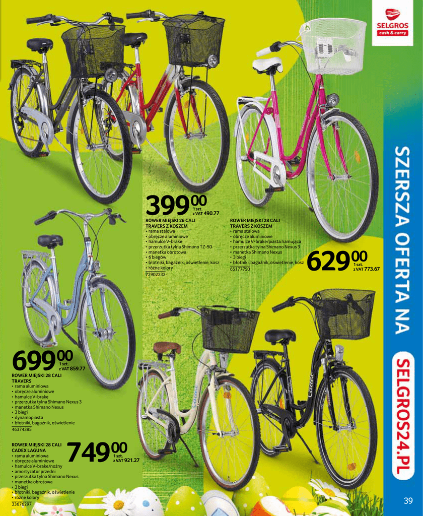 39900 1 szt. z VAT 490.77 ROWER MIEJSKI 26 CALI TRAVERS Z KOSZEM • rama stalowa • obręcze aluminiowe • hamulce V-brake • przerzutka tylna Shimano TZ-50 • manetka obrotowa • 6 biegów • błotniki, bagażnik, oświetlenie, kosz • różne kolory 72902232 699 ROWER MIEJSKI 28 CALI TRAVERS Z KOSZEM • rama stalowa • obręcze aluminiowe • hamulce V-brake/piasta hamująca • przerzutka tylna Shimano Nexus 3 • manetka Shimano Nexus • 3 biegi • błotniki, bagażnik, oświetlenie, kosz 65177750 62900 1 szt. z VAT 773.67 00 1 szt. z VAT 859.77 ROWER MIEJSKI 28 CALI TRAVERS • rama aluminiowa • obręcze aluminiowe • hamulce V-brake • przerzutka tylna Shimano Nexus 3 • manetka Shimano Nexus • 3 biegi • dynamopiasta • błotniki, bagażnik, oświetlenie 46374385 74900 ROWER MIEJSKI 28 CALI CADEX LAGUNA • rama aluminiowa • obręcze aluminiowe • hamulce V-brake/nożny • amortyzator przedni • przerzutka tylna Shimano Nexus • manetka obrotowa • 3 biegi • błotniki, bagażnik, oświetlenie • różne kolory 33676297 1 szt. z VAT 921.27 39