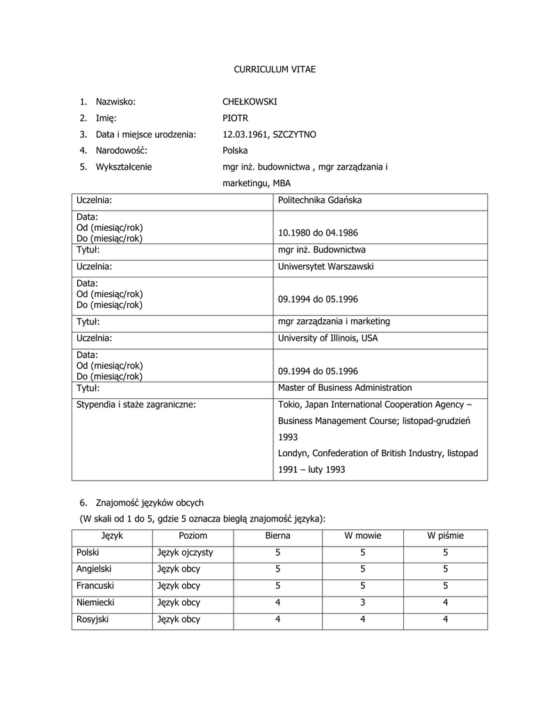 CURRICULUM VITAE 1. Nazwisko: CHEŁKOWSKI 2. Imię: PIOTR 3. Data i miejsce urodzenia: 12.03.1961, SZCZYTNO 4. Narodowość: Polska 5. Wykształcenie mgr inż. budownictwa , mgr zarządzania i marketingu, MBA Uczelnia: Politechnika Gdańska Data: Od (miesiąc/rok) Do (miesiąc/rok) Tytuł: 10.1980 do 04.1986 mgr inż. Budownictwa Uczelnia: Uniwersytet Warszawski Data: Od (miesiąc/rok) Do (miesiąc/rok) 09.1994 do 05.1996 Tytuł: mgr zarządzania i marketing Uczelnia: University of Illinois, USA Data: Od (miesiąc/rok) Do (miesiąc/rok) Tytuł: 09.1994 do 05.1996 Master of Business Administration Stypendia i staże zagraniczne: Tokio, Japan International Cooperation Agency – Business Management Course; listopad-grudzień 1993 Londyn, Confederation of British Industry, listopad 1991 – luty 1993 6. Znajomość języków obcych (W skali od 1 do 5, gdzie 5 oznacza biegłą znajomość języka): Język Poziom Bierna W mowie W piśmie Polski Język ojczysty 5 5 5 Angielski Język obcy 5 5 5 Francuski Język obcy 5 5 5 Niemiecki Język obcy 4 3 4 Rosyjski Język obcy 4 4 4 7. Członkowstwo w organizacjach zawodowych: Pomorska Okręgowa Izba Inżynierów Budownictwa ; Japan International Cooperation Agency Alumni Association, MBA Illinois Alumni Association 8. Obecnie zajmowane stanowisko: Dyrektor Techniczny Oddziału 9. Ilość lat doświadczenia zawodowego: 21 10. Posiadane uprawnienia budowlane: Konstrukcyjno-budowlane wykonawcze nr UAN 8346/987/90 Sanitarne w zakresie sieci wod-kan wykonawcze i projektowe nr UAN 8346/306/90 11. Członkowstwo w Radach Nadzorczych: sekretarz Rady Nadzorczej PA Wyroby Betonowe Sp. z o.o. z siedzibą w Elblągu od dnia 20.07.2007 do dzisiaj 12. Doświadczenie zawodowe: Data: od (miesiąc/rok) do (miesiąc/rok) 06.2007 Miejsce Gdańsk Firma Pol-Aqua SA Stanowisko Dyrektor Oddziału Generalnego Wykonawstwa Doświadczenie Zarządzanie Oddziałem Generalnego Wykonawstwa – generalne wykonawstwo inwestycji w budownictwie ogólnym – pozyskiwanie i realizacja zleceń, aktualnie prowadzone kontrakty – Galeria ”Biała” w Białymstoku – wartość 145 milionów złotych, hipermarket Tesco w Gdańsku Chełmie – wartość 92 miliony złotych, hipermarket Auchan w Szczecinie – wartość 63 miliony złotych, hala przemysłowa dla firmy Alstom w Elblągu – wartość 40 milionów złotych Data: od (miesiąc/rok) do (miesiąc/rok) 01.2003 do 05.2007 Miejsce Gdańsk Firma HYDROBUDOWA S.A. (kapitał szwedzki) Stanowisko Dyrektor Oddziału Inżynierii Środowiska Doświadczenie Zarządzanie Oddziałem Inżynierii Środowiska – generalne wykonawstwo inwestycji w gospodarce wodno-ściekowej – pozyskiwanie i realizacja zleceń Data: od (miesiąc/rok) do (miesiąc/rok) 09.2001 – 07.2002 Miejsce Gdańsk Firma Sunley Polska S.A. (kapitał angielski) Stanowisko Dyrektor Regionalny Doświadczenie Zarządzanie Oddziałem firmy Sunley Polska S.A., a generalnego wykonawcy należącego do międzynarodowego koncernu Sunley Turriff Group Data: od (miesiąc/rok) do (miesiąc/rok) 12.1997 – 08.2001 Miejsce Gdańsk Firma Hydrobudowa – 6 S.A. Stanowisko Dyrektor Oddziału Północ Doświadczenie Zarządzanie Oddziałem generalnego wykonawcy, pozyskiwanie i realizacja różnorodnych projektów inwestycyjnych pod klucz Data: od (miesiąc/rok) do (miesiąc/rok) 12.1996 - 06.1997 Miejsce Gdańsk Firma Bongs Sp. Z o.o. (kapitał szwedzki) Stanowisko Dyrektor Naczelny Doświadczenie Zarządzanie firmą produkcyjną w branży poligraficznej Data: od (miesiąc/rok) do (miesiąc/rok) 12.1995 - 11.1996 Miejsce Gdańsk Firma Polskie Stowarzyszenie Budowniczych Domów Stanowisko Dyrektor Doświadczenie Zarządzanie stowarzyszeniem, ścisła współpraca ze stowarzyszeniem National Association of Home Builders w USA Data: od (miesiąc/rok) do (miesiąc/rok) 10.1994 - 11.1995 Miejsce Łeba Firma Port Jachtowy w Łebie (w budowie) Stanowisko Dyrektor Doswiadczenie Zarządzanie firmą odpowiedzialną za zaprojektowanie i budowę portu jachtowego i mariny w Łebie, projekt finansowany z funduszy europejskich PHARE, Crossborder Programme 1994, kontrakt FIDIC Data: od (miesiąc/rok) do (miesiąc/rok) 05. 1993 – 10.1994 Miejsce Łeba Firma Urząd Miejski w Łebie Stanowisko Burmistrz Doświadczenie Zarządzanie gminą miejską Łeba, współpraca z miastami członkowskimi w ramach Związku Miast Bałtyckich, pozyskiwanie środków finansowych na inwestycje z funduszy UE – w tym na budowę mariny w Łebie Data: od (miesiąc/rok) do (miesiąc/rok) 11.1991 – 02.1993 Miejsce Londyn Firma Maunsell Consultancy Services Ltd Stanowisko Konsultant Doświadczenie Stypendium przyznane przez Confederation of British Industry; praca w jednej z największych inżynierskich firm doradczych w Wielkiej Brytanii; projektowanie sieci wodociągowych i kanalizacyjnych przy wykorzystaniu najnowszych metod komputerowych Data: od (miesiąc/rok) do (miesiąc/rok) 12.1985 – 11.1991 Miejsce: Łeba Firma Spółka Wodna “Łeba” Stanowisko Kierownik Działu Kanalizacji Doświadczenie Budowa oczyszczalni ścieków dla 40.000 RLM i sieci kanalizacyjnej o średnicach od fi 200 do fi 1000 mm wraz z przepompowniami w Łebie (prace ziemne, odwodnieniowe, budowlane, technologiczne, drogowe, elektryczne, rozruch technologiczny)