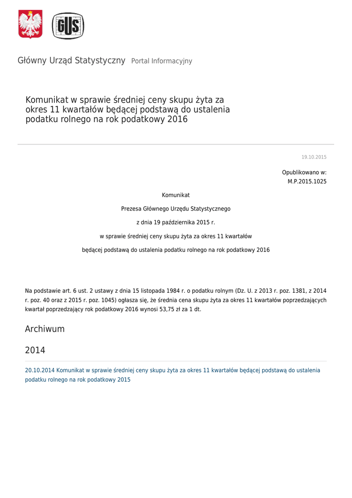 Główny Urząd Statystyczny Portal Informacyjny Komunikat w sprawie średniej ceny skupu żyta za okres 11 kwartałów będącej podstawą do ustalenia podatku rolnego na rok podatkowy 2016 19.10.2015 Opublikowano w: M.P.2015.1025 Komunikat Prezesa Głównego Urzędu Statystycznego z dnia 19 października 2015 r. w sprawie średniej ceny skupu żyta za okres 11 kwartałów będącej podstawą do ustalenia podatku rolnego na rok podatkowy 2016 Na podstawie art. 6 ust. 2 ustawy z dnia 15 listopada 1984 r. o podatku rolnym (Dz. U. z 2013 r. poz. 1381, z 2014 r. poz. 40 oraz z 2015 r. poz. 1045) ogłasza się, że średnia cena skupu żyta za okres 11 kwartałów poprzedzających kwartał poprzedzający rok podatkowy 2016 wynosi 53,75 zł za 1 dt. Archiwum 2014 20.10.2014 Komunikat w sprawie średniej ceny skupu żyta za okres 11 kwartałów będącej podstawą do ustalenia podatku rolnego na rok podatkowy 2015