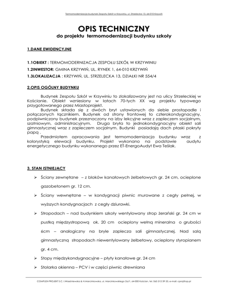 Termomodernizacja budynek Zespołu Szkół w Krzywiniu, ul. Strzelecka 13, 64-010 Krzywiń OPIS TECHNICZNY do projektu termomodernizacji budynku szkoły 1.DANE EWIDENCYJNE 1.1OBIEKT : TERMOMODERNIZACJA ZESPOŁU SZKÓŁ W KRZYWINIU 1.2INWESTOR: GMINA KRZYWIŃ, UL. RYNEK 1, 64-010 KRZYWIŃ 1.3LOKALIZACJA : KRZYWIŃ, UL. STRZELECKA 13, DZIAŁKI NR 554/4 2.OPIS OGÓLNY BUDYNKU Budynek Zespołu Szkół w Krzywiniu to zlokalizowany jest na ulicy Strzeleckiej w Kościanie. Obiekt wzniesiony w latach 70-tych XX wg projektu typowego przygotowanego przez Miastoprojekt. Budynek składa się z dwóch brył ustawionych do siebie prostopadle i połączonych łącznikiem. Budynek od strony frontowej to czterokondygnacyjny, podpiwniczony budynek przeznaczony na izby lekcyjne wraz z zapleczem socjalnym, szatniowym, administracyjnym. Druga bryła to jednokondygnacyjny obiekt sali gimnastycznej wraz z zapleczem socjalnym. Budynki posiadają dach płaski pokryty papą . Przedmiotem opracowania jest termomodernizacja budynku wraz z kolorystyką elewacji budynku. Projekt wykonano na podstawie audytu energetycznego budynku wykonanego przez ET-EnergoAudyt Ewa Teślak. 3. STAN ISTNIEJĄCY Ściany zewnętrzne – z bloków kanałowych żelbetowych gr. 24 cm, ocieplone gazobetonem gr. 12 cm. Ściany wewnętrzne – w kondygnacji piwnic murowane z cegły pełnej, w wyższych kondygnacjach z cegły dziurawki. Stropodach – nad budynkiem szkoły wentylowany strop żerański gr. 24 cm w pustką międzystropową ok. 20 cm ocieplony wełną mineralna o grubości 6cm – analogiczny na bryle zaplecza sali gimnastycznej. Nad salą gimnastyczną stropodach niewentylowany żelbetowy, ocieplony styropianem gr. 4 cm. Stopy międzykondygnacyjne – płyty kanałowe gr. 24 cm Stolarka okienna – PCV i w części piwnic drewniana COMPLEX-PROJEKT S.C. I.Wrześniewska & H.Marcinkowska, ul. Marcinkowskiego 2a/1, 64-000 Kościan, tel. 065 512 39 53, e-mail: [email protected] Termomodernizacja budynek Zespołu Szkół w Krzywiniu, ul. Strzelecka 13, 64-010 Krzywiń Stolarka drzwiowa zewnętrza – wejściowe PCV oraz drewniane i stalowe do pomieszczeń pomocniczych. Instalacje – wentylacja grawitacyjna, instalacja c.o. z rur stalowych typu zamkniętego, ciepła woda z podgrzewaczy elektrycznych, 4.0 CEL OPRACOWANIA : Celem opracowania jest wykonanie termomodernizacji budynku zgodnie z audytem energetycznym oraz kolorystyka elewacji. 5.0 OPIS PRAC DO WYKONANIA : Zakres prac do wykonania obejmuje termomodernizację ścian i stropodachów oraz szereg prac będących konsekwencją zmiany grubości przegrody zewnętrznej i kolorystyki obiektu. Prace termomodernizacyjne zgodne z opracowanym audytem energetycznym budynku. • Ocieplenie cokołu i ścian piwnic do głębokości 50 cm poniżej powierzchni terenu – styropian ekstrudowanym gr. 14 cm o współczynniku nie większym niż λ=0,036 W/m2K • Ocieplenie ścian styropianem metodą BSO z użyciem styropianu o współczynniku max. λ=0,031W/m2K- grubość ocieplenia 12 cm • Stropodach wentylowany (szkoła oraz zaplecze sali gimnastycznej) ocieplenie wełną mineralną wdmuchiwaną w przestrzeń międzystropową o współczynniku max. λ=0,039 W/m2K o grubości 21cm. • Wykonanie nowych otworów wentylacyjnych na wysokości stropodachu o wym. zgodnie z rysunkami – na osiach okien z kratkami wentylacyjnymi, w COMPLEX-PROJEKT S.C. I.Wrześniewska & H.Marcinkowska, ul. Marcinkowskiego 2a/1, 64-000 Kościan, tel. 065 512 39 53, e-mail: [email protected] Termomodernizacja budynek Zespołu Szkół w Krzywiniu, ul. Strzelecka 13, 64-010 Krzywiń przypadku braku możliwości wykonania otworów w ścianach należy wykonać kominki w dachu • Stropodach niewentylowany (sala gimnastyczna) ocieplenie styropapą styropianu o współczynniku max.λ=0,038W/m2K - gr. 22 cm. • Wymiana stolarki okiennej – zarówno PCV i drewnianej na PCV o współczynniku max. 0,9 W/m2K. • Przebicie otworów w ścianach zewnętrznych i montaż nawiewników sterowanych ciśnieniowo • Wymiana istniejących parapetów zewnętrznych na parapety ocynkowane gr. 0,55 mm powlekanych w kolorze szarym • Wymiana istniejących parapetów wewnętrznych na parapety PCV w kolorze białym • Wymiana stolarki drzwiowej – zarówno PCV i drewnianej na PCV o współczynniku max. 1,3 W/m2K – wg rysunku zestawienia stolarki drzwiowej • Tynkowanie elewacji tynkiem mineralnym na siatce systemowej, a następnie pomalowanie dwa razy tynków nakrapianych o uziarnieniu 1,5mm farbą akrylową (- cokół, fragmenty tynku na elewacji w tynku malowany w kolorze brązowym - elewacja w tynku mineralnym gruboziarnistym malowanym farbą w kolorze białym, szarym i brązowym. - ściany cokołów powyżej terenu pomalować farbą cokołową elewacyjną w kolorze brązowym • Obłożenie fragmentów elewacji sali gimnastycznej oraz na ścianach wiatrołapu płytkami klinkierowym w kolorze brązowym. COMPLEX-PROJEKT S.C. I.Wrześniewska & H.Marcinkowska, ul. Marcinkowskiego 2a/1, 64-000 Kościan, tel. 065 512 39 53, e-mail: [email protected] Termomodernizacja budynek Zespołu Szkół w Krzywiniu, ul. Strzelecka 13, 64-010 Krzywiń • Rozebranie istniejących rynien i rur spustowych, a następnie ponowny montaż nowych rynien i rur spustowych z blachy tytan.-cynk o przekrojach podanych na rysunku – rzut dachu • Rozebranie istniejącej instalacji odgromowej i montaż nowej wraz z uziomem – wg projektu branży instalacji elektrycznej. • Modernizacja i nowa technologia kotłowni, wymiana przewodów rozprowadzających wraz z ich izolacja, wymiana grzejników wraz z zaworami termostatycznymi - wg projektu branży sanitarnej. 6.0 KOLORYSTYKA ELEWACJI pokrycie dachu: papa w kolorze czarno-szarym pas cokołowy w kolorze ciemnobrązowym – tynk gładki pomalować farbą cokołową w kolorze jasnobrązowym, elewacja w tynku mineralnym drobnoziarnistym malowanym farbą kolorze białym, szarym oraz w kolorze brązowym z fragmentami g