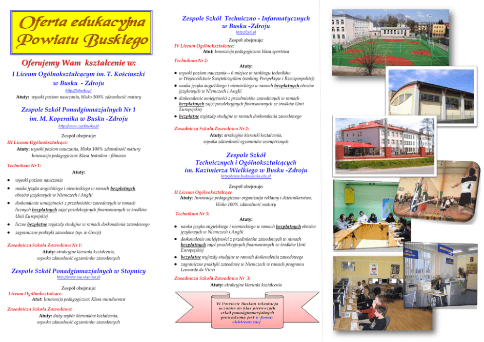 Zespole Szkół Techniczno - Informatycznych w Busku -Zdroju http://zsti.pl Zespół obejmuje: IV Liceum Ogólnokształcące: Atut: Innowacja pedagogiczna: klasa sportowa Oferujemy Wam kształcenie w: I Liceum Ogólnokształcącym im. T. Kościuszki w Busku - Zdroju http://lobusko.pl Atuty: wysoki poziom nauczania, blisko 100% zdawalność matury Zespole Szkół Ponadgimnazjalnych Nr 1 im. M. Kopernika w Busku -Zdroju http://www.zsp1busko.pl Zespół obejmuje: III Liceum Ogólnokształcące: Atuty: wysoki poziom nauczania, blisko 100% zdawalność matury Innowacja pedagogiczna: Klasa teatralno - filmowa Technikum Nr 1: Atuty: Technikum Nr 2: nauka języka angielskiego i niemieckiego w ramach bezpłatnych obozów językowych w Niemczech i Anglii doskonalenie umiejętności z przedmiotów zawodowych w ramach bezpłatnych zajęć pozalekcyjnych finansowanych ze środków Unii Europejskiej bezpłatne wyjazdy studyjne w ramach doskonalenia zawodowego Zasadnicza Szkoła Zawodowa Nr 2: Atuty: atrakcyjne kierunki kształcenia, wysoka zdawalność egzaminów zewnętrznych Zespole Szkół Technicznych i Ogólnokształcących im. Kazimierza Wielkiego w Busku -Zdroju http://www.budowlanka.edu.pl wysoki poziom nauczania nauka języka angielskiego i niemieckiego w ramach bezpłatnych obozów językowych w Niemczech i Anglii doskonalenie umiejętności z przedmiotów zawodowych w ramach licznych bezpłatnych zajęć pozalekcyjnych finansowanych ze środków Unii Europejskiej liczne bezpłatne wyjazdy studyjne w ramach doskonalenia zawodowego zagraniczne praktyki zawodowe (np. w Grecji) Zasadnicza Szkoła Zawodowa Nr 1: Atuty: atrakcyjne kierunki kształcenia, wysoka zdawalność egzaminów zawodowych Zespole Szkół Ponadgimnazjalnych w Stopnicy http://www.zsp.stopnica.pl Zespół obejmuje: Liceum Ogólnokształcące: Atut: Innowacja pedagogiczna: Klasa mundurowa Zasadnicza Szkoła Zawodowa: Atuty: duży wybór kierunków kształcenia, wysoka zdawalność egzaminów zawodowych Atuty: wysoki poziom nauczania—6 miejsce w rankingu techników w Województwie Świętokrzyskim (ranking Perspektyw i Rzeczpospolitej) Zespół obejmuje: II Liceum Ogólnokształcące Atuty: Innowacja pedagogiczna: organizacja reklamy i dziennikarstwo, blisko 100% zdawalność matury Technikum Nr 3: Atuty: nauka języka angielskiego i niemieckiego w ramach bezpłatnych obozów językowych w Niemczech i Anglii doskonalenie umiejętności z przedmiotów zawodowych w ramach bezpłatnych zajęć pozalekcyjnych finansowanych ze środków Unii Europejskiej bezpłatne wyjazdy studyjne w ramach doskonalenia zawodowego zagraniczne praktyki zawodowe w Niemczech w ramach programu Leonardo da Vinci Zasadnicza Szkoła Zawodowa Nr 3: Atuty: atrakcyjne kierunki kształcenia