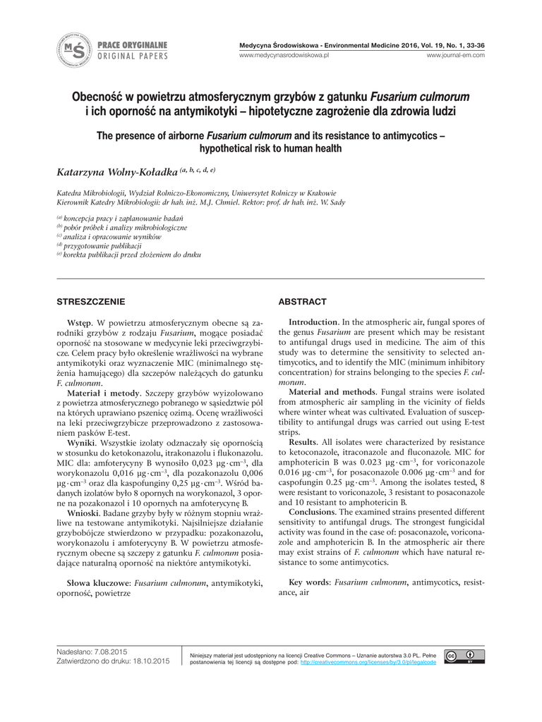 Medycyna Środowiskowa - Environmental Medicine 2016, Vol. 19, No. 1, 33-36 www.journal-em.com www.medycynasrodowiskowa.pl Obecność w powietrzu atmosferycznym grzybów z gatunku Fusarium culmorum i ich oporność na antymikotyki – hipotetyczne zagrożenie dla zdrowia ludzi The presence of airborne Fusarium culmorum and its resistance to antimycotics – hypothetical risk to human health Katarzyna Wolny-Koładka (a, b, c, d, e) Katedra Mikrobiologii, Wydział Rolniczo-Ekonomiczny, Uniwersytet Rolniczy w Krakowie Kierownik Katedry Mikrobiologii: dr hab. inż. M.J. Chmiel. Rektor: prof. dr hab. inż. W. Sady koncepcja pracy i zaplanowanie badań pobór próbek i analizy mikrobiologiczne (c) analiza i opracowanie wyników (d) przygotowanie publikacji (e) korekta publikacji przed złożeniem do druku (a) (b) STRESZCZENIE ABSTRACT Wstęp. W powietrzu atmosferycznym obecne są zarodniki grzybów z rodzaju Fusarium, mogące posiadać oporność na stosowane w medycynie leki przeciwgrzybicze. Celem pracy było określenie wrażliwości na wybrane antymikotyki oraz wyznaczenie MIC (minimalnego stężenia hamującego) dla szczepów należących do gatunku F. culmorum. Materiał i metody. Szczepy grzybów wyizolowano z powietrza atmosferycznego pobranego w sąsiedztwie pól na których uprawiano pszenicę ozimą. Ocenę wrażliwości na leki przeciwgrzybicze przeprowadzono z zastosowaniem pasków E-test. Wyniki. Wszystkie izolaty odznaczały się opornością w stosunku do ketokonazolu, itrakonazolu i flukonazolu. MIC dla: amfoterycyny B wynosiło 0,023 µg · cm–3, dla worykonazolu 0,016 µg · cm–3, dla pozakonazolu 0,006 µg · cm–3 oraz dla kaspofunginy 0,25 µg · cm–3. Wśród badanych izolatów było 8 opornych na worykonazol, 3 oporne na pozakonazol i 10 opornych na amfoterycynę B. Wnioski. Badane grzyby były w różnym stopniu wrażliwe na testowane antymikotyki. Najsilniejsze działanie grzybobójcze stwierdzono w przypadku: pozakonazolu, worykonazolu i amfoterycyny B. W powietrzu atmosferycznym obecne są szczepy z gatunku F. culmorum posiadające naturalną oporność na niektóre antymikotyki. Słowa kluczowe: Fusarium culmorum, antymikotyki, oporność, powietrze Nadesłano: 7.08.2015 Zatwierdzono do druku: 18.10.2015 Introduction. In the atmospheric air, fungal spores of the genus Fusarium are present which may be resistant to antifungal drugs used in medicine. The aim of this study was to determine the sensitivity to selected antimycotics, and to identify the MIC (minimum inhibitory concentration) for strains belonging to the species F. culmorum. Material and methods. Fungal strains were isolated from atmospheric air sampling in the vicinity of fields where winter wheat was cultivated. Evaluation of susceptibility to antifungal drugs was carried out using E-test strips. Results. All isolates were characterized by resistance to ketoconazole, itraconazole and fluconazole. MIC for amphotericin B was 0.023 µg · cm–3, for voriconazole 0.016 µg · cm–3, for posaconazole 0.006 µg · cm–3 and for caspofungin 0.25 µg · cm–3. Among the isolates tested, 8 were resistant to voriconazole, 3 resistant to posaconazole and 10 resistant to amphotericin B. Conclusions. The examined strains presented different sensitivity to antifungal drugs. The strongest fungicidal activity was found in the case of: posaconazole, voriconazole and amphotericin B. In the atmospheric air there may exist strains of F. culmorum which have natural resistance to some antimycotics. Key words: Fusarium culmorum, antimycotics, resistance, air Niniejszy materiał jest udostępniony na licencji Creative Commons – Uznanie autorstwa 3.0 PL. Pełne postanowienia tej licencji są dostępne pod: http://creativecommons.org/licenses/by/3.0/pl/legalcode 34 Medycyna Środowiskowa - Environmental Medicine 2016, Vol. 19, No. 1 Katarzyna Wolny-Koładka: Obecność w powietrzu atmosferycznym Fusarium culmorum i ich oporność na antymikotyki – zagrożenie dla zdrowia ludzi WSTĘP Mykotoksynotwórcze grzyby fitopatogeniczne z rodzaju Fusarium są jednymi z najczęściej izolowanych patogenów roślin uprawnych tj. pszenica, żyto, kukurydza, jęczmień i ziemniaki [1, 2]. Stanowią także duże zagrożenie dla ludzi, wywołując zakażenia grzybicze oraz produkując mykotoksyny [3, 4]. Zarodniki Fusarium spp. są także izolowane z powietrza atmosferycznego, za pośrednictwem którego mogą przemieszczać się na dalekie odległości [5, 6]. Mimo, że powietrze atmosferyczne nie jest środowiskiem przyjaznym dla rozwoju grzybów, to bytując w nim, w dalszym ciągu zachowują swój potencjał infekcyjny [5, 7]. Źródłem zarodników grzybów z rodzaju Fusarium znajdujących się w powietrzu atmosferycznym jest grzybnia, która rozwija się min. na porażonych roślinach, magazynowanych płodach rolnych, czy też w glebie [1]. Osoby oddychające powietrzem zawierającym zarodniki grzybów narażone są na różnego rodzaju choroby [8, 9]. Grzyby z rodzaju Fusarium są jednymi z najczęściej izolowanych patogenów pszenicy ozimej, której areał upraw z roku na rok rośnie. Dlatego można założyć, że powietrze znajdujące się w sąsiedztwie upraw pszenicy będzie silnie zanieczyszczone zarodnikami grzybów z rodzaju Fusarium [10, 11]. W dalszym ciągu nie mamy dostatecznych informacji na temat lekooporności szczepów izolowanych ze środowiska, które mogą wywoływać zakażenia u ludzi [12]. Dlatego niezwykle istotne jest określenie profilu lekooporności szczepów Fusarium spp. izolowanych z powietrza znajdującego się w sąsiedztwie upraw pszenicy ozimej. Celem przedstawionej pracy było określenie, czy środowiskowe szczepy F. culmorum, izolowane z powietrza atmosferycznego posiadają oporność na wybrane antymikotyki. Ponadto, celem analiz było wyznaczenie MIC (minimalne stężenie hamujące) dla wszystkich analizowanych szczepów F. culmorum. MATERIAŁ I METODY W analizie wykorzystano szczepy 