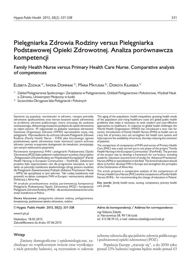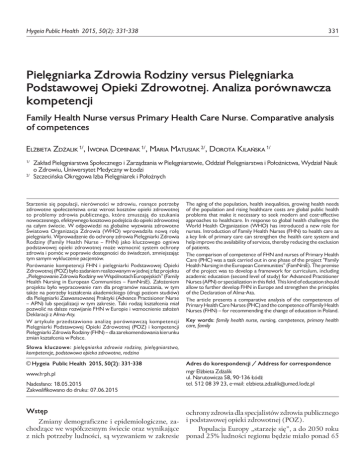 Zdżalik Public Hygeia E i wsp. Health Pielęgniarka 2015, 50(2): Zdrowia 331-338 Rodziny versus Pielęgniarka Podstawowej Opieki Zdrowotnej. Analiza ... 331 Pielęgniarka Zdrowia Rodziny versus Pielęgniarka Podstawowej Opieki Zdrowotnej. Analiza porównawcza kompetencji Family Health Nurse versus Primary Health Care Nurse. Comparative analysis of competences Elżbieta Zdżalik 1/, Iwona Dominiak 1/, Maria Matusiak 2/, Dorota Kilańska 1/ Zakład Pielęgniarstwa Społecznego i Zarządzania w Pielęgniarstwie, Oddział Pielęgniarstwa i Położnictwa, Wydział Nauk o Zdrowiu, Uniwersytet Medyczny w Łodzi 2/ Szczecińska Okręgowa Izba Pielęgniarek i Położnych 1/ Starzenie się populacji, nierówności w zdrowiu, rosnące potrzeby zdrowotne społeczeństwa oraz wzrost kosztów opieki zdrowotnej to problemy zdrowia publicznego, które zmuszają do szukania nowoczesnego, efektywnego kosztowo podejścia do opieki zdrowotnej na całym świecie. W odpowiedzi na globalne wyzwania zdrowotne Światowa Organizacja Zdrowia (WHO) wprowadziła nową rolę pielęgniarki. Wprowadzenie do ochrony zdrowia Pielęgniarki Zdrowia Rodziny (Family Health Nurse – FHN) jako kluczowego ogniwa podstawowej opieki zdrowotnej może wzmocnić system ochrony zdrowia i pomóc w poprawie dostępności do świadczeń, zmniejszając tym samym wykluczenie pacjentów. Porównanie kompetencji FHN i pielęgniarki Podstawowej Opieki Zdrowotnej (POZ) było zadaniem realizowanym w jednej z faz projektu „Pielęgnowanie Zdrowia Rodziny we Wspólnotach Europejskich” (Family Health Nursing in European Communities – FamNrsE). Założeniem projektu było wypracowanie ram dla programów nauczania, w tym także na potrzeby kształcenia akademickiego (drugi poziom studiów) dla Pielęgniarki Zaawansowanej Praktyki (Advance Practisioner Nurse – APN) lub specjalizacji w tym zakresie. Taki rodzaj kształcenia miał pozwolić na dalsze rozwijanie FHN w Europie i wzmocnienie założeń Deklaracji z Ałma-Aty. W artykule przedstawiono analizę porównawczą kompetencji Pielęgniarki Podstawowej Opieki Zdrowotnej (POZ) i kompetencji Pielęgniarki Zdrowia Rodziny (FHN) – dla zarekomendowania kierunku zmian kształcenia w Polsce. The aging of the population, health inequalities, growing health needs of the population and rising healthcare costs are global public health problems that make it necessary to seek modern and cost-effective approaches to healthcare. In response to global health challenges the World Health Organization (WHO) has introduced a new role for nurses. Introduction of Family Health Nurses (FHN) to health care as a key link of primary care can strengthen the health care system and help improve the availability of services, thereby reducing the exclusion of patients. The comparison of competence of FHN and nurses of Primary Health Care (PHC) was a task carried out in one phase of the project “Family Health Nursing in the European Communities” (FamNrsE). The premise of the project was to develop a framework for curriculum, including academic education (second level of study) for Advanced Practitioner Nurses (APN) or specialization in this field. This kind of education should allow to further develop FHN in Europe and strengthen the principles of the Declaration of Alma-Ata. The article presents a comparative analysis of the competences of Primary Health Care Nurses (PHC) and the competence of Family Health Nurses (FHN) – for recommending the change of education in Poland. Key words: family health nurse, nursing, competence, primary health care, family Słowa kluczowe: pielęgniarka zdrowia rodziny, pielęgniarstwo, kompetencje, podstawowa opieka zdrowotna, rodzina © Hygeia Public Health 2015, 50(2): 331-338 Adres do korespondencji / Address for correspondence www.h-ph.pl mgr Elżbieta Zdżalik ul. Narutowicza 58, 90-136 Łódź tel. 512 08 39 23, e-mail: [email protected] Nadesłano: 18.05.2015 Zakwalifikowano do druku: 07.06.2015 Wstęp Zmiany demograficzne i epidemiologiczne, zachodzące we współczesnym świecie oraz wynikające z nich potrzeby ludności, są wyzwaniem w zakresie ochrony zdrowia dla specjalistów zdrowia publicznego i podstawowej opieki zdrowotnej (POZ). Populacja Europy „starzeje się”, a do 2050 roku ponad 25% ludności regionu będzie miało ponad 65 332 lat [1]. Badania bazujące na prognozie demograficznej GUS wskazują, że starzenie się społeczeństwa przyczyni się do pogorszenia statusu zdrowotnego populacji, wzrostu odsetka osób z chorobami przewlekłymi i osób niesamodzielnych. Według niektórych autorów wpłynie to na wzrost zapotrzebowania i zwiększenie wydatków na świadczenia zdrowotne oraz usługi opiekuńcze [2]. Rozwiązywaniu problemów zdrowotnych jednostek i grup społecznych powinno towarzyszyć szerokie, ogólnospołeczne podejście do tych problemów oraz poprawa jakości świadczonych usług w ramach POZ. Wzmocnienie potencjału zdrowotnego oraz poprawa opieki nad chorymi przewlekle w opiece środowiskowej zmniejszy poziom hospitalizacji i zapotrzebowania na opiekę specjalistyczną. Współczesne pielęgniarstwo rozszerza zakres kompetencji i samodzielności pielęgniarki zmierzając do wielokierunkowej aktywności skoncentrowanej na podmiocie opieki. Najważniejszym środkiem służącym poprawie stanu zdrowia społeczeństwa jest promocja zdrowia, w której edukacja zdrowotna stanowi integralną część opieki nad jednostką i rodziną. Pielęgniarka pracująca w środowisku ma bezpośredni kontakt z członkami rodziny i może dostosować edukację do potrzeb i możliwości każdego z domowników. Zadania wyznaczone dla Pielęgniarki Zdrowia Rodziny (FHN) mają stanowić wsparcie dla społeczności lokalnych. Uważane są one za niezbędne do realizacji kompleksowej opieki w POZ. Kompetencje FHN pozwolą na promowanie, ochronę i przywracanie zdrowia jednostki, rodziny w środowisku, w ciągu całego życia. Pielęgnowanie zdrowia rodziny mogłoby