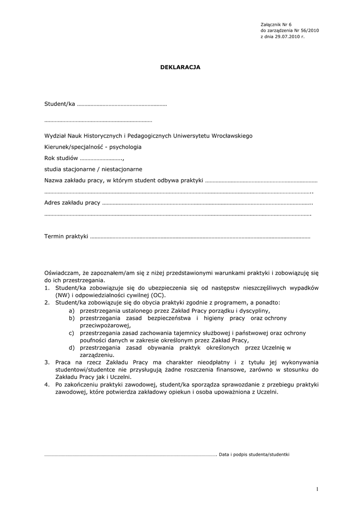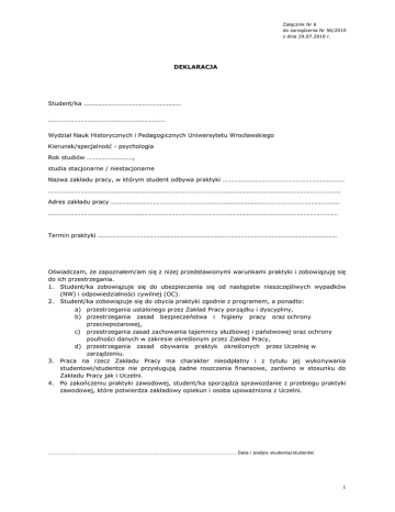 Załącznik Nr 6 do zarządzenia Nr 56/2010 z dnia 29.07.2010 r. DEKLARACJA Student/ka …………………………………………………… ……………………………………………………………… Wydział Nauk Historycznych i Pedagogicznych Uniwersytetu Wrocławskiego Kierunek/specjalność - psychologia Rok studiów ………………………., studia stacjonarne / niestacjonarne Nazwa zakładu pracy, w którym student odbywa praktyki ………………………………………………………………… …………………………………………………………………………………………………………………………………………………………….. Adres zakładu pracy ………………………………………………………………………………………………………………………….. ……………………………………………………………………………………………………………………………………………………………. Termin praktyki ………………………………………………………………………………………………………………………………… Oświadczam, że zapoznałem/am się z niżej przedstawionymi warunkami praktyki i zobowiązuję się do ich przestrzegania. 1. Student/ka zobowiązuje się do ubezpieczenia się od następstw nieszczęśliwych wypadków (NW) i odpowiedzialności cywilnej (OC). 2. Student/ka zobowiązuje się do obycia praktyki zgodnie z programem, a ponadto: a) przestrzegania ustalonego przez Zakład Pracy porządku i dyscypliny, b) przestrzegania zasad bezpieczeństwa i higieny pracy oraz ochrony przeciwpożarowej, c) przestrzegania zasad zachowania tajemnicy służbowej i państwowej oraz ochrony poufności danych w zakresie określonym przez Zakład Pracy, d) przestrzegania zasad obywania praktyk określonych przez Uczelnię w zarządzeniu. 3. Praca na rzecz Zakładu Pracy ma charakter nieodpłatny i z tytułu jej wykonywania studentowi/studentce nie przysługują żadne roszczenia finansowe, zarówno w stosunku do Zakładu Pracy jak i Uczelni. 4. Po zakończeniu praktyki zawodowej, student/ka sporządza sprawozdanie z przebiegu praktyki zawodowej, które potwierdza zakładowy opiekun i osoba upoważniona z Uczelni. …………………………………………………………………………………………………………………………………. Data i podpis studenta/studentki 1 Załącznik Nr 6 do zarządzenia Nr 56/2010 z dnia 29.07.2010 r. ZAŚWIADCZENIE O ODBYCIU PRAKTYKI ZAWODOWEJ Pan/i Student/ka Wydziału kierunku studiów obył/a praktykę w ................................................................................. (nazwa Zakładu Pracy) zgodnie z ustalonym programem w terminie od ..................................... do ............................ Krótka charakterystyka przebiegu praktyki Zakład Pracy podpis osoby upoważnionej pieczęć wydziału podpis opiekuna praktyk Szczegółowe zasady odbywania praktyk pedagogicznych w Uniwersytecie Wrocławskim 1. Instrukcja w sprawie organizacji i przebiegu praktyk pedagogicznych przewidzianych standardem kształcenia nauczycieli na studiach wyższych zawodowych, dwuprzedmiotowych w zakresie dwóch specjalności/ specjalizacji nauczycielskich (głównej i dodatkowej), jednolitych studiach magisterskich oraz studiach podyplomowych (Rozporządzenie Ministerstwa Edukacji Narodowej i Sportu z dnia 7 września 2004 r. w sprawie standardów kształcenia nauczycieli - Dz. U. Nr 207, poz. 2110) 2 Załącznik Nr 6 do zarządzenia Nr 56/2010 z dnia 29.07.2010 r. I. CELE PRAKTYKI 1. Praktyczne zapoznanie się z pracą i życiem szkoły. 2. Poznanie ogólnych zasad organizowania pracy. 3. Pogłębienie znajomości metod i form nauczania w zakresie studiowanego przedmiotu. 4. Rozwijanie kompetencji psychologiczno-pedagogicznych. 5. Gromadzenie przez studenta materiału obserwacyjnego i doświadczalnego o szkole i jej środowisku. II. 1. 2. 3. 4. 5. Student jest zobowiązany do zgłoszenia się do dyrekcji Szkoły w dniu rozpoczęcia praktyki, przed godziną ósmą, celem skierowania do nauczyciela-opiekuna, który jest jego bezpośrednim przełożonym w czasie odbywania praktyki. Obowiązkiem studenta jest powiadomienie dyrekcji Szkoły oraz opiekuna dydaktycznego praktyki z ramienia Uczelni o niemożności stawienia się w Szkole w oznaczonym terminie (np.: zwolnienie lekarskie). Nauczyciel-opiekun ustala ze studentem szczegółowy plan zajęć zgodnie ze wskazaniami instrukcji. Plan, po zatwierdzeniu przez dyrektora Szkoły, należy dostarczyć opiekunowi dydaktycznemu z ramienia Uczelni w pierwszym tygodniu praktyki (za wyjątkiem praktyki jednotygodniowej). Po zajęciach nauczyciel-opiekun omawia ze studentem przebieg i wyniki jego całodziennej pracy. Tematem omówienia powinna być przede wszystkim każda obserwowana lub przeprowadzona przez studenta lekcja (patrz: arkusz obserwacji Kompetencje nauczycielskie praktykanta w zakresie sprawnego prowadzenia lekcji). W wypadku obserwowania przez studenta lekcji u innego nauczyciela w jej omówieniu uczestniczy również ten nauczyciel. Po odbytej lekcji student wpisuje pod konspektem tej lekcji uwagi i zalecenia nauczycielaopiekuna, dotyczące jej prowadzenia. Uwagi te powinny być przedyskutowane w czasie omawiania lekcji. Następnie student wpisuje pod konspektem/scenariuszem własny komentarz do samodzielnie przeprowadzonej lekcji. Podczas praktyki ciągłej w Szkole (po II roku studiów i odbyciu zajęć z Psychologii i Pedagogiki), student wykonuje zadania związane z realizacją bloku psychologicznopedagogicznego (opisane w ABC Praktykanta, dostępnym na stronie internetowej: www.cen.uni.wroc.pl/praktyki pedagogiczne.htm. W czasie odbywania praktyki student podlega obowiązującej w szkole dyscyplinie pracy. Cechować go powinna solidność i sumienność w wykonywaniu swoic