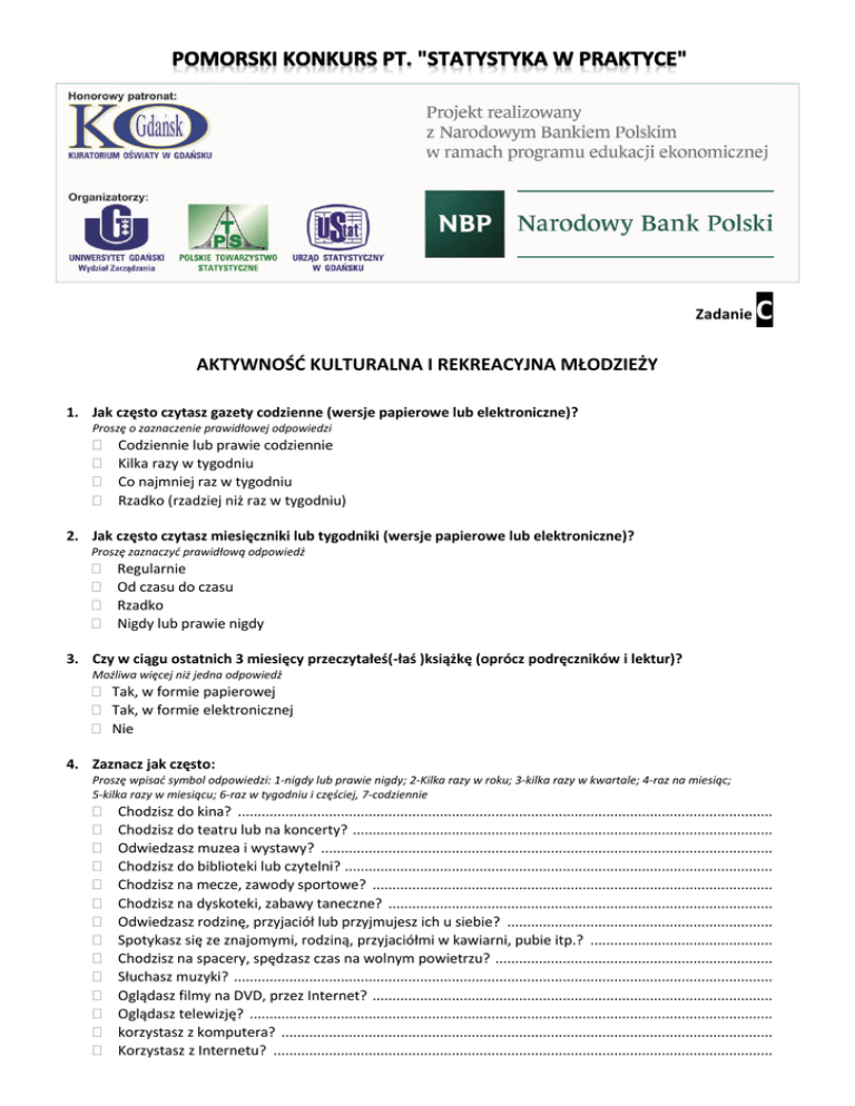 Zadanie C AKTYWNOŚĆ KULTURALNA I REKREACYJNA MŁODZIEŻY 1. Jak często czytasz gazety codzienne (wersje papierowe lub elektroniczne)? Proszę o zaznaczenie prawidłowej odpowiedzi Codziennie lub prawie codziennie Kilka razy w tygodniu Co najmniej raz w tygodniu Rzadko (rzadziej niż raz w tygodniu) 2. Jak często czytasz miesięczniki lub tygodniki (wersje papierowe lub elektroniczne)? Proszę zaznaczyć prawidłową odpowiedź Regularnie Od czasu do czasu Rzadko Nigdy lub prawie nigdy 3. Czy w ciągu ostatnich 3 miesięcy przeczytałeś(-łaś )książkę (oprócz podręczników i lektur)? Możliwa więcej niż jedna odpowiedź Tak, w formie papierowej Tak, w formie elektronicznej Nie 4. Zaznacz jak często: Proszę wpisać symbol odpowiedzi: 1-nigdy lub prawie nigdy; 2-Kilka razy w roku; 3-kilka razy w kwartale; 4-raz na miesiąc; 5-kilka razy w miesiącu; 6-raz w tygodniu i częściej, 7-codziennie Chodzisz do kina? ....................................................................................................................................... Chodzisz do teatru lub na koncerty? .......................................................................................................... Odwiedzasz muzea i wystawy? .................................................................................................................. Chodzisz do biblioteki lub czytelni? ............................................................................................................ Chodzisz na mecze, zawody sportowe? ..................................................................................................... Chodzisz na dyskoteki, zabawy taneczne? ................................................................................................. Odwiedzasz rodzinę, przyjaciół lub przyjmujesz ich u siebie? ................................................................... Spotykasz się ze znajomymi, rodziną, przyjaciółmi w kawiarni, pubie itp.? .............................................. Chodzisz na spacery, spędzasz czas na wolnym powietrzu? ...................................................................... Słuchasz muzyki? ........................................................................................................................................ Oglądasz filmy na DVD, przez Internet? ..................................................................................................... Oglądasz telewizję? .................................................................................................................................... korzystasz z komputera? ............................................................................................................................ Korzystasz z Internetu? .............................................................................................................................. 5. Czy w ciągu ostatnich 12 miesięcy wyjeżdżałeś(-łaś) na co najmniej 5 dni w celach turystycznych, wypoczynkowych? Proszę zaznaczyć właściwą odpowiedź Tak Nie Osoby, które zaznaczyły nie przechodzą do pytania nr. 7 6. Dokąd wówczas wyjeżdżałeś(-łaś)? Możliwa więcej niż jedna odpowiedź Na działkę – własną lub znajomych Do rodziny, krewnych, przyjaciół w innej miejscowości Do rodziny, krewnych, przyjaciół za granicą Na wczasy, wycieczkę, obóz, rajd itp. w kraju Na wczasy, wycieczkę, obóz, rajd itp. za granicą 7. Czy masz jakieś zainteresowania, hobby? Proszę zaznaczyć właściwą odpowiedź Tak Nie Osoby, które w pytaniu 7 zaznaczyły Nie przechodzą do pytania 9 8. Którą z wyżej wymienionych form aktywności jesteś szczególnie zainteresowany(-na), traktując ją jako hobby, któremu indywidualnie lub w grupie poświęcasz swój wolny czas? Możliwa więcej niż jedna odpowiedź Fotografia amatorska Film amatorski Zajęcia plastyczne (malarstwo, rzeźba, tkactwo itp.) Zajęcia muzyczne np. gra na instrumencie, śpiew Taniec Działalność w amatorskim zespole teatralnym, folklorystycznym, chórze itp. Kolekcjonerstwo np. numizmatyka, filatelistyka Majsterkowanie np. budowanie modeli, mechanika Inna forma (jaka?) 9. Czy uprawiasz jakiś sport lub podejmujesz inną aktywność fizyczną w swoim czasie wolnym? Proszę zaznaczyć właściwą odpowiedź Tak Nie Osoby, które w pytaniu 9 udzieliły odpowiedzi Nie przechodzą do pytania 11 10. Która z niżej wymienionych form sportu, ćwiczeń fizycznych jesteś szczególnie zainteresowany(-na)? Możliwa więcej niż jedna odpowiedź Fitness Joga Bieganie Nordic Walking Siłownia Jazda na rowerze, rolkach i deskorolkach Jazda na nartach, sporty zimowe Pływanie Gra w piłkę nożną/koszykówkę/siatkówkę lub inne gry zespołowe Sztuki walki Inne formy 11. Które z wymienionych określeń najlepiej charakteryzuje sposób wykorzystania przez Ciebie czasu w ciągu dnia powszedniego? Proszę zaznaczyć właściwą odpowiedź Czasu nie wystarcza mi nawet na wykonanie koniecznych zajęć Czasu wystarcza mi tylko na to, co muszę zrobić, ale nie mam czasu wolnego dla siebie Robię wszystko, co musze zrobić i mam jeszcze trochę czasu wolnego dla siebie Czasu wystarcza mi na wszystko, bez specjalnego pośpiechu Mam za dużo czasu wolnego 12. Płeć respondenta Proszę zaznaczyć prawidłową odpowiedź Kobieta Mężczyzna Realizacja wywiadu Wywiad Proszę zaznaczyć właściwą odpowiedź Zrealizowany przez ankietera Zrealizowany przez respondenta Uwagi ankietera/respondenta: ........................................................................................................................................................................... ........................................................................................................................................................................... ..........................................................................................................................