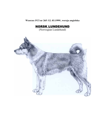 Wzorzec FCI nr 265 /12. 03.1999/, wersja angielska NORSK LUNDEHUND (Norwegian Lundehund) 2 TŁUMACZENIE : Olga Jakubiel. POCHODZENIE: Norwegia. DATA PUBLIKACJI OBOWIĄZUJĄCEGO WZORCA: 12.03.1999. UŻYTKOWOŚĆ: Ze względu na swe osobliwe cechy anatomiczne, pies ten przeznaczony jest do polowania na maskonury na stromych skałach, otaczających fiordy oraz ciągnących się wzdłuż wybrzeża. KLASYFIKACJA F.C.I. : Grupa 5 Szpice i psy ras pierwotnych. Sekcja 2 Nordyckie psy myśliwskie. Bez prób pracy. WRAŻENIE OGÓLNE : Pies w typie szpica, mały, prostokątny, gibki, dosyć lekkiej budowy. Cechy morfologiczne uzależnione od płci. USPOSOBIENIE/TEMPERAMENT : Czujny, energiczny, żywy. GŁOWA : Kształtna, średniej szerokości, klinowata. OKOLICA MÓZGOCZASZKI : Czaszka: Nieco zaokrąglona, z wydatnymi łukami brwiowymi. Stop: Zaznaczony, ale nie przesadnie. OKOLICA TWARZOCZASZKI: Kufa: Klinowata, średniej długości. Grzbiet nosa nieco wypukły. Szczęka i żuchwa oraz uzębienie : Preferowany zgryz nożycowy, ale zgryz cęgowy lub umiarkowany prognatyzm żuchwy – dozwolony. Brak przedtrzonowców po obu stronach, zarówno w szczęce, jak i w żuchwie, jest dopuszczalny. Oko: Nieco ukośne; nie wyłupiaste; tęczówka żółtawo-brązowa. Źrenica otoczona jest ciemną obwódką. Uszy: Trójkątne, średniej wielkości, szerokie u nasady, noszone prosto, bardzo ruchome. Chrząstka płatu ucha posiada zdolność FCI St.N° 265 3 zwijania się tak, iż ucho składa się i odchyla w specyficzny sposób, do tyłu lub w prawo ku górze, zamykając tym samym kanał słuchowy. SZYJA: Kształtna, średniej długości, dosyć silna, ze stosunkowo obfitym kołnierzem. TUŁÓW: Prostokątny. Górna linia: Prosta. Grzbiet: Mocny. Zad: Nieco opadający. Klatka piersiowa: Długa, średniej szerokości, stosunkowo głęboka i pojemna; nie beczkowata. Brzuch: Nieco podciągnięty. OGON: Wysoko osadzony, średniej długości, dobrze okryty włosem, ale bez pióra. Noszony zwinięty w pierścień, nieznacznie zawinięty nad grzbietem lub zwisający. Koniuszek ogona nie może przesadnie przechylać się, ani opadać na jeden bok. KOŃCZYNY: KOŃCZYNY PRZEDNIE : Wrażenie ogólne: Umiarkowanie kątowane. Przedramię: Proste. Przednie łapy: Owalne, odchylone nieco na zewnątrz, z przynajmniej sześcioma palcami, z których pięć musi dotykać podłoża. Osiem opuszek na każdej łapie. Dwa wewnętrzne palce, składające się odpowiednio z 3 i 2 paliczków, wyposażone w układ więzadeł i mięśni, sprawiają, iż łapa wygląda solidnie. KOŃCZYNY TYLNE : Wrażenie ogólne: Kończyny tylne usytuowane są dosyć blisko siebie. Udo: Silne i umięśnione. Kolana: Umiarkowanie kątowane. Podudzie: Silne i umięśnione. Tylne łapy: Owalne, ustawione nieco na zewnątrz, z przynajmniej sześcioma palcami, z których cztery muszą dotykać podłoża. Siedem FCI St.N° 265 4 opuszek na każdej łapie; środkowa, najważniejsza ze względu na swój rozmiar, połączona jest z wewnętrznymi opuszkami, odpowiadającymi dwóm wewnętrznym palcom. Gdy pies stoi na płaskiej powierzchni, ciężar ciała musi być równomiernie rozłożony na opuszki łap. CHÓD/RUCH : Lekki i elastyczny. Obrotowa zewnętrzna akcja kończyn przednich i nieco zbieżna akcja kończyn tylnych jest charakterystyczna dla rasy. SZATA: WŁOS: Gęsty i twardy; miękkie podszycie. Włos krótki na głowie i przedzie kończyn; bardziej obfity na poziomie szyi, tyle ud oraz na ogonie, ale nie tworzy pióra. MAŚĆ: Zawsze połączona z bielą: u psów maści od rudej do płowej, szata mniej lub bardziej przesiana włosami o czarnych koniuszkach; czarna; szara; biała z ciemnymi łatami. U psów dorosłych, zwykle wyraźniej, niż u psów młodszych, zaznaczone są czarne koniuszki włosów. WIELKOŚĆ I CIĘŻAR CIAŁA: Psy: 35 - 38 cm. Wysokość w kłębie: Suki: 32 - 35 cm. Psy: ok. 7 kg. Waga: Suki: ok. 6 kg. WADY: Wszelkie odstępstwa od wyżej wymienionych cech należy uznać za wady, których ocena powinna być proporcjonalna względem ich stopnia i zasięgu. WADA DYSKWALIFIKUJĄCA: • Agresja. Każdy pies, przejawiający fizyczne lub psychiczne nieprawidłowości, powinien zostać zdyskwalifikowany. FCI St.N° 265 5 Uwaga: Samce powinny mieć dwa normalnie wykształcone jądra, całkowicie opuszczone do moszny. FCI St.N° 265