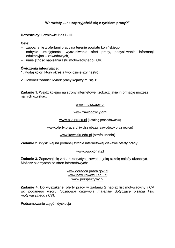 Warsztaty „Jak zaprzyjaźnić się z rynkiem pracy?” Uczestnicy: uczniowie klas I - III Cele: − zapoznanie z ofertami pracy na terenie powiatu konińskiego, − nabycie umiejętności: wyszukiwania ofert pracy, pozyskiwania informacji edukacyjno – zawodowych, − umiejętność napisania listu motywacyjnego i CV. Ćwiczenia integrujące: 1. Podaj kolor, który określa twój dzisiejszy nastrój 2. Dokończ zdanie: Rynek pracy kojarzy mi się z …….. Zadanie 1. Wejdź kolejno na strony internetowe i zobacz jakie informacje możesz na nich uzyskać. www.mpips.gov.pl www.zawodowcy.org www.psz.praca.pl (katalog pracodawców) www.oferty.praca.pl (wpisz obszar zawodowy oraz region) www.koweziu.edu.pl (strefa ucznia) Zadanie 2. Wyszukaj na podanej stronie internetowej ciekawe oferty pracy: www.pup.konin.pl Zadanie 3. Zapoznaj się z charakterystyką zawodu, jaką szkołę należy ukończyć. Możesz skorzystać ze stron internetowych: www.doradca.praca.gov.pl www.new.koweziu.edu.pl www.perspektywy.pl Zadanie 4. Do wyszukanej oferty pracy w zadaniu 2 napisz list motywacyjny i CV wg podanego wzoru (uczniowie otrzymują materiały dotyczące pisania listu motywacyjnego i CV). Podsumowanie zajęć - dyskusja