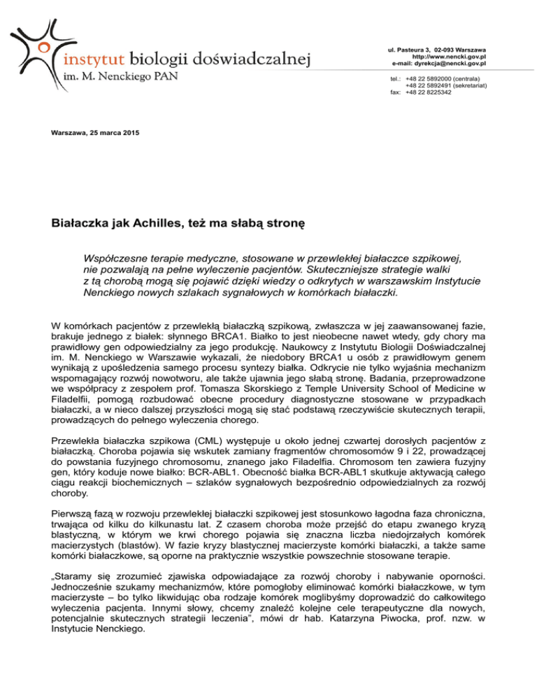 ul. Pasteura 3, 02-093 Warszawa http://www.nencki.gov.pl e-mail: [email protected] tel.: +48 22 5892000 (centrala) +48 22 5892491 (sekretariat) fax: +48 22 8225342 Warszawa, 25 marca 2015 Białaczka jak Achilles, też ma słabą stronę Współczesne terapie medyczne, stosowane w przewlekłej białaczce szpikowej, nie pozwalają na pełne wyleczenie pacjentów. Skuteczniejsze strategie walki z tą chorobą mogą się pojawić dzięki wiedzy o odkrytych w warszawskim Instytucie Nenckiego nowych szlakach sygnałowych w komórkach białaczki. W komórkach pacjentów z przewlekłą białaczką szpikową, zwłaszcza w jej zaawansowanej fazie, brakuje jednego z białek: słynnego BRCA1. Białko to jest nieobecne nawet wtedy, gdy chory ma prawidłowy gen odpowiedzialny za jego produkcję. Naukowcy z Instytutu Biologii Doświadczalnej im. M. Nenckiego w Warszawie wykazali, że niedobory BRCA1 u osób z prawidłowym genem wynikają z upośledzenia samego procesu syntezy białka. Odkrycie nie tylko wyjaśnia mechanizm wspomagający rozwój nowotworu, ale także ujawnia jego słabą stronę. Badania, przeprowadzone we współpracy z zespołem prof. Tomasza Skorskiego z Temple University School of Medicine w Filadelfii, pomogą rozbudować obecne procedury diagnostyczne stosowane w przypadkach białaczki, a w nieco dalszej przyszłości mogą się stać podstawą rzeczywiście skutecznych terapii, prowadzących do pełnego wyleczenia chorego. Przewlekła białaczka szpikowa (CML) występuje u około jednej czwartej dorosłych pacjentów z białaczką. Choroba pojawia się wskutek zamiany fragmentów chromosomów 9 i 22, prowadzącej do powstania fuzyjnego chromosomu, znanego jako Filadelfia. Chromosom ten zawiera fuzyjny gen, który koduje nowe białko: BCR-ABL1. Obecność białka BCR-ABL1 skutkuje aktywacją całego ciągu reakcji biochemicznych – szlaków sygnałowych bezpośrednio odpowiedzialnych za rozwój choroby. Pierwszą fazą w rozwoju przewlekłej białaczki szpikowej jest stosunkowo łagodna faza chroniczna, trwająca od kilku do kilkunastu lat. Z czasem choroba może przejść do etapu zwanego kryzą blastyczną, w którym we krwi chorego pojawia się znaczna liczba niedojrzałych komórek macierzystych (blastów). W fazie kryzy blastycznej macierzyste komórki białaczki, a także same komórki białaczkowe, są oporne na praktycznie wszystkie powszechnie stosowane terapie. „Staramy się zrozumieć zjawiska odpowiadające za rozwój choroby i nabywanie oporności. Jednocześnie szukamy mechanizmów, które pomogłoby eliminować komórki białaczkowe, w tym macierzyste – bo tylko likwidując oba rodzaje komórek moglibyśmy doprowadzić do całkowitego wyleczenia pacjenta. Innymi słowy, chcemy znaleźć kolejne cele terapeutyczne dla nowych, potencjalnie skutecznych strategii leczenia”, mówi dr hab. Katarzyna Piwocka, prof. nzw. w Instytucie Nenckiego. Łańcuchy DNA w komórkach nowotworowych mają liczne uszkodzenia. Jednym z najważniejszych białek kontrolujących naprawę tych łańcuchów – a także stabilność genetyczną komórek podczas podziałów – jest białko BRCA1 (mutacje w genie kodującym BRCA1 są powszechnie kojarzone ze zwiększonym ryzykiem zachorowania na raka piersi i jajnika). Gdyby komórki nowotworowe wytwarzały białko BRCA1, byłyby w stanie bezbłędnie naprawiać uszkodzenia DNA lub aktywować proces eliminowania komórek ze zbyt dużą liczbą uszkodzeń – a to byłoby niekorzystne dla rozwijającego się nowotworu. Dzięki wcześniejszym badaniom zespołu K. Piwockiej i innych grup naukowych wiadomo, że w zaawansowanej fazie przewlekłej białaczki szpikowej w komórkach pacjentów występują niedobory białka BRCA1. Niedobory te dotychczas wiązano jednak z mutacjami, czyli nieprawidłową budową samego genu BRCA1. Badacze z Instytutu Nenckiego wykazali, że w przypadku białaczki ważny jest jeszcze inny czynnik. Mikrośrodowisko organizmu, w którym rozwijają się komórki nowotworowe, jest dla nich skrajnie nieprzyjazne. Aby przetrwać, komórki nowotworu muszą zmienić przebieg wielu szlaków sygnałowych i uruchomić szereg mechanizmów adaptacyjnych. Okazuje się, że jeden z takich mechanizmów – szlak sygnałowy znany jako prożyciowa adaptacyjna odpowiedź na stres – może blokować produkcję białka BRCA1. „Nasze badania wykazały, że w zaawansowanej fazie przewlekłej białaczki szpikowej dochodzi do zaburzenia samej syntezy białka BRCA1. Chory ma prawidłowy gen kodujący to białko, ale cząsteczki informacyjnego kwasu mRNA, niezbędne do jego produkcji, są zwinięte i opakowane w kompleksy białkowe. Tak 'schowane', po prostu nie mogą uczestniczyć w procesie syntezy białka”, opisuje dr Paulina Podszywałow-Bartnicka, główna autorka publikacji, która ukazała się w znanym czasopiśmie biologicznym „Cell Cycle”. W obecnych procedurach diagnostycznych chorych bada się wyłącznie pod kątem występowania nieprawidłowości genu BRCA1. Wyniki prac naukowców z Instytut Nenckiego sugerują jednak, że brak białka produkowanego przez ten gen może być znacznie powszechniejszy niż się obecnie wydaje. Odkrycie ma znaczenie nie tylko poznawcze. Przede wszystkim otwiera drogę do nowych terapii przeciwbiałaczkowych. Już dziś wiadomo, że deficyt białka BRCA1, który służy komórkom nowotworowym, może zostać wykorzystany przeciw nim. Strategie terapeutyczne oparte na zjawisku syntetycznej letalności wykorzystują fakt, że pewne szlaki sygnałowe lub geny są w komórkach nowotworowych nieaktywne lub zmutowane. „Gdy komórka ma uszkodzony jeden szlak sygnałowy lub gen, zwykle może funkcjonować dalej, ponieważ najprawdopodobniej wciąż działa inny szlak, alternatywny. Dopiero gdy i on zostanie zahamowany, komórka traci zdolność funkcjonowania”, wyjaśnia prof. Skorski i kontynuuje: „Skoro wiemy, że jeden szlak naprawy DNA, zależny od BRCA1, nie działa w komórce białaczkow
