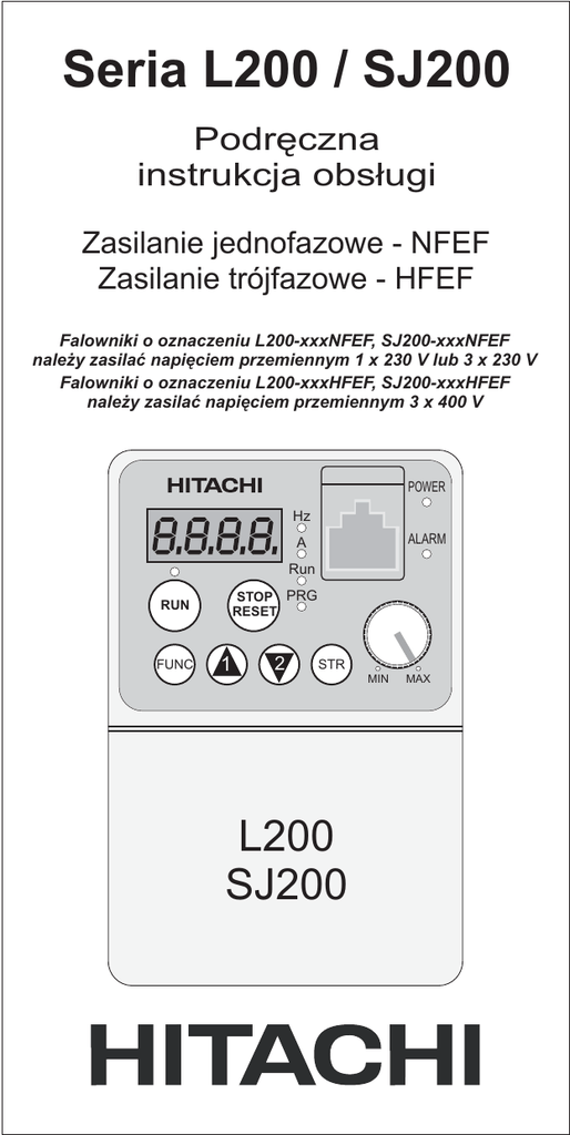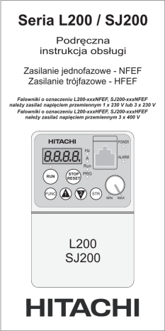 Seria L200 / SJ200 Podręczna instrukcja obsługi Zasilanie jednofazowe - NFEF Zasilanie trójfazowe - HFEF Falowniki o oznaczeniu L200-xxxNFEF, SJ200-xxxNFEF należy zasilać napięciem przemiennym 1 x 230 V lub 3 x 230 V Falowniki o oznaczeniu L200-xxxHFEF, SJ200-xxxHFEF należy zasilać napięciem przemiennym 3 x 400 V POWER Hz ALARM A Run STOP PRG RUN FUNC RESET 1 2 STR L200 SJ200 MIN MAX Uwaga! Niebezpieczeństwo dla życia. Układ pod napięciem. Przed zainstalowaniem należy: - sprawdzić, czy podczas transportu nie nastąpiło uszkodzenie falownika. - sprawdzając tabliczkę znamionową upewnić się, czy jednostka jest tym urządzeniem, które zostało zamówione. Symbol modelu MODEL: L200-004HFEF/SJ200-004HFEF Dopuszczalna moc silnika. HP/KW:1/2 / 0,4 Znamionowe parametry zasilania: częstotliwość, napięcie, liczba faz, prąd. Input/Entree: 50,60Hz Znamionowe parametry wyjściowe: częstotliwość, napięcie, prąd. Output/Sortie: 0÷400 Hz MFG No. 761T1234570001 Date:05/ 06 Numer fabryczny i data produkcji. HITACHI, Ltd. MADE IN JAPAN NE16452-9 V 1Ph 50,60Hz 380-460 V 3Ph 2.6 380-460 V 3Ph 1.5 Treść tabliczki znamionowej Opis symbolu modelu: L200 SJ200 004 H F E F Oznaczenie serii 002 : 0.2kW 004 : 0.4kW 005 : 0.55kW 007 : 0.75kW Filtr EMC Wersja dla: (E: Europa, U: USA, R: Japonia) Typ budowy: (F: z pulpitem sterowania cyfrowego) Napięcie wejściowe: (N: 1 lub trójfazowe kl. 200V) (H: 3-fazowe kl. 400V) (L: Wyłącznie 3-fazowe kl. 200V) Dopuszcalna moc zastosowanego silnika (czterobiegunowego): 037 : 3.7kW 011 : 1.1kW 040 : 4.0kW 015 : 1,5kW 055 : 5.5kW 022 : 2.2kW 075 : 7.5kW 030 : 3.0kW Wymiary do zachowania przy instalowaniu Uwaga! Powierzchnią ściany musi być materiał niepalny np. blacha stalowa. Przepływ powietrza min. 10 cm min. 5 cm L200 SJ200 min. 5 cm min. 10 cm UWAGA: falownik należy instalować pionowo. Nie instaluj falownika np. na podłodze. -2- A A A Przymocowanie FUNC STR L200 SJ200 Ostrzeżenie! Otwierać tylko, gdy falownik nie jest zasilany. Podłączenie 1. Przyciśnij jednoczenie po obydwu stronach. 2. Wysuń do góry po odblokowaniu zaczepów. UWAGA! 1. Jeżeli używasz falownika o zasilaniu jednofazowym 1 x 230 V pamiętaj, że na jego wyjściu, maksymalne napięcie wynosi 3 x 230 V. Zatem silnik o parametrach zasilania 230 /400 należy połączyć w . 2. Napięcie zasilania podłączaj tylko i wyłącznie do zacisków L1, L2 i L3/N. 3. Nie podłączaj żadnych przewodów do nieopisanych zacisków górnej listwy. 4. W przypadku przyłączenia kilku silników, każdy z nich powinien mieć przekaźnik termiczny. 5. W zależności od liczby faz napięcie zasilania podłącz w następujący sposób: zasilanie jednofazowe .......................... zaciski L1, L3/N (typ NFEF) 1 x 230 V zasilanie trójfazowe .............................. zaciski L1, L2, L3 (typ HFEF) 3 x 400 V 6. Nie zdejmuj zwory pomiędzy zaciskami (+1) i (+). -3- Podłączenie obwodów mocy Zasilanie * Uziemienie Silnik * Przykład zasilania dla falowników o oznaczeniu - HFEF 3 x 400 V Moc falownika Przekrój przewodu Model falownika KW KM Obwody mocy 0,2 1/4 L200/SJ200-002NFEF/NFU 0,4 1/2 L200/SJ200-004NFEF/NFU 0,55 3/4 L200/SJ200-005NFEF Obwody sterownicze Zabezpieczenie Bezpiecznik (600 V) 1,3 mm2 10 A 2,1 mm2 15 A 0,75 1 1,1 1 1/2 1,5 2 L200/SJ200-015NFEF/NFU 3,3 mm2 20 A (jednofazowe) 15 A (trójfazowe) 2,2 3 L200/SJ200-022NFEF/NFU 5,3 mm2 30 A (jednofazowe) 20 A (trójfazowe) 3,7 5 L200/SJ200-037LFU 3,3 mm2 2 L200/SJ200-007NFEF/NFU L200/SJ200-011NFEF 5,5 7 1/2 L200/SJ200-055LFU 5,3 mm 7,5 10 L200/SJ200-075LFU 8,4 mm2 0,4 1/2 L200/SJ200-004HFEF/HFU 0,75 1 L200/SJ200-007HFEF/HFU 1,5 2 L200/SJ200-015HFEF/HFU 2,2 3 L200/SJ200-022HFEF/HFU 3,0 4 L200/SJ200-030HFEF 4,0 5 L200/SJ200-040HFEF/HFU 5,5 7 1/2 L200/SJ200-055HFEF/HFU 7,5 10 L200/SJ200-075HFEF/HFU 0,14 do 0,75 mm2 przewody ekranowane 30 A 40 A 50 A 3A 6A 1,3 mm2 10 A 2 2,1 mm 15 A 20 A 2 3,3 mm 25 A -4- Zaciski mocy Listwa zaciskowa falownika L200 w zależności od modelu. Modele falowników L200-002NFEF/NFU, - 004NFEF/NFU, -005NFEF zwora L1 +1 + - L2 N/L3 U/T1 V/T2 W/T3 uziemienie Modele falowników L200-007NFEF do, - 022NFEF, -037LFU, -004HFEF/HFU do -040HFEF/HFU zwora NFEF, NFU LFU, HFEF, HFU +1 + - L1 L2 N/L3 U/T1 V/T2 W/T3 L1 L2 L3 U/T1 V/T2 W/T3 uziemienie Modele falowników L200-055LFU, -075LFU, -055HFEF/HFU, -075HFEF/HFU L1 L2 +1 + L3 U/T1 V/T2 W/T3 zwora uziemienie Listwa zaciskowa falownika SJ200 w zależności od modelu. Modele falowników SJ200-002NFEF/NFU do -005NFEF/NFU zwora L1 zwora L2 RB +1 + - N/L3 U/T1 V/T2 W/T3 uziemienie Modele falowników SJ200-007NFEF do, - 022NFEF, -007NFU do -037LFU, -004HFEF/HFU do -040HFEF/HFU zwora NFEF, NFU LFU, HFEF, HFU +1 + - L1 L2 N/L3 U/T1 V/T2 W/T3 L1 L2 L3 U/T1 V/T2 W/T3 RB uziemienie Modele falowników SJ200-055HFEF/HFU, -075HFEF/HFU L1 L2 +1 + L3 U/T1 - RB zwora -5- V/T2 W/T3 uziemienie Wymiary listw zaciskowych. Modele 002NF, 004NF, 005NF Liczba zacisków na listwie Zacisk śruby Modele 007NF, 022NF, 037LF, 004HF ÷ 040HF H [mm] śruby 7,1 Modele 055LF, 075LF, 055HF, 075HF H [mm] M4 śruby Obwód mocy 12 M3,5 Obwód sterowniczy 16 M2 M2 9 Obwód sygnalizacji alarmu 3 M3 M3 M3 Uziemienie 2 M4 M4 M5 H [mm] 13 M5 M2 Śruby dokręcaj z momentem dokręcającym takim jak w tabeli poniżej. Śruba Moment dokręcający Śruba Moment dokręcający Śruba Moment dokręcający M2 0,2 Nm (max. 0,25 Nm) M3,5 0,8 Nm (max. 0,9 Nm) M5 2,0 Nm (max. 2,2 Nm) M3 0,5 Nm (max. 0,6 Nm) M4 1,2 Nm (max. 1,3 Nm) Funkcje zacisków obwodu głównego. Symbol zacisku Opis Funkcja L1,L2,L3 (L1) (N/L3) Zasilanie Przyłączenie zasilania (T1), (T2), (T3) U, V, W Wyjście falownika Przyłączenie silnika Zewnętrzny dławik DC Zazwyczaj pomiędzy tymi zaciskami założona jest zwora. Jeżeli chcesz zastosować dławik DC, zdejmij zworę. L1 L2 +1, + +, RB* Zewnętrzny rezystor Przyłączenie rezystora hamującego. (opcja)* hamujący Jednostka hamująca Przyłączenie jednostki hamującej. (czoper