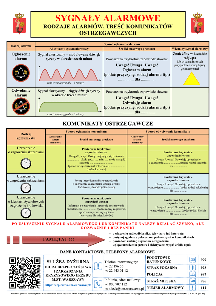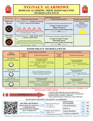 SYGNAŁY ALARMOWE RODZAJE ALARMÓW, TREŚĆ KOMUNIKATÓW OSTRZEGAWCZYCH Sposób ogłaszania alarmów Rodzaj alarmu Środki masowego przekazu Wizualny sygnał alarmowy Powtarzana trzykrotnie zapowiedź słowna: Znak żółty w kształcie trójkąta Akustyczny system alarmowy Ogłoszenie alarmu Sygnał akustyczny – modulowany dźwięk syreny w okresie trzech minut Uwaga! Uwaga! Uwaga! Ogłaszam alarm (podać przyczynę, rodzaj alarmu itp.) ............... dla .............. lub w uzasadnionych przypadkach innej figury geometrycznej czas trwania sygnału – 3 minuty Odwołanie alarmu Sygnał akustyczny – ciągły dźwięk syreny w okresie trzech minut czas trwania sygnału – 3 minuty Powtarzana trzykrotnie zapowiedź słowna: Uwaga! Uwaga! Uwaga! Odwołuję alarm (podać przyczynę, rodzaj alarmu itp.) ............... dla .............. KOMUNIKATY OSTRZEGAWCZE Sposób ogłaszania komunikatu Rodzaj komunikatu Akustyczny system alarmowy Uprzedzenie o zagrożeniu skażeniami Uprzedzenie o zagrożeniu zakażeniami Uprzedzenie o klęskach żywiołowych i zagrożeniu środowiska Sposób odwoływania komunikatu Środki masowego przekazu Akustyczny system alarmowy Środki masowego przekazu Powtarzana trzykrotnie zapowiedź słowna: Uwaga! Uwaga! Osoby znajdujące się na terenie .................. około godz. ..... min. ..... może nastąpić skażenie ................................. (podać rodzaj skażenia) w kierunku ...................... (podać kierunek) Powtarzana trzykrotnie zapowiedź słowna: Uwaga! Uwaga! Odwołuję uprzedzenie o zagrożeniu ...................... (podać rodzaj skażenia) dla .................. Formę i treść komunikatu uprzedzenia o zagrożeniu zakażeniami ustalają organy Państwowej Inspekcji Sanitarnej Powtarzana trzykrotnie zapowiedź słowna: Uwaga! Uwaga! Odwołuję uprzedzenie o zagrożeniu ...................... (podać rodzaj zakażenia) dla .................. Powtarzana trzykrotnie zapowiedź słowna: Informacja o zagrożeniu i sposobie postępowania mieszkańców ................... (podać rodzaj zagrożenia, spodziewany czas wystąpienia i wytyczne dla mieszkańców) Powtarzana trzykrotnie zapowiedź słowna: Uwaga! Uwaga! Odwołuję uprzedzenie o zagrożeniu ...................... (podać rodzaj klęski) dla .................. PO USŁYSZENIU SYGNAŁU ALARMOWEGO LUB KOMUNIKATU NALEŻY DZIAŁAĆ SZYBKO, ALE ROZWAŻNIE I BEZ PANIKI PAMIĘTAJ ! ! ! − − − − o włączeniu radioodbiornika, telewizora lub Internetu postępuj zgodnie z poleceniami podawanymi w komunikatach powiadom rodzinę i sąsiadów o zagrożeniu wyłącz urządzenia gazowe i elektryczne, wygaś źródła ognia DANE KONTAKTOWE, TELEFONY ALARMOWE SŁUŻBA DYŻURNA BIURA BEZPIECZEŃSTWA I ZARZĄDZANIA KRYZYSOWEGO URZĘDU M.ST. WARSZAWY http://bezpieczna.um.warszawa.pl/ Telefon interwencyjny: • 22 196 56 • 22 443 01 12 POGOTOWIE RATUNKOWE 999 STRAŻ POŻARNA 998 POLICJA 997 Infolinia, adres mailowy: STRAŻ MIEJSKA • 800 707 112 • [email protected] NUMER ALARMOWY 986 112 Podstawa prawna: rozporządzenia Rady Ministrów z dnia 7 stycznia 2013 r. w sprawie systemów wykrywania skażeń i powiadamiania o ich wystąpieniu oraz właściwości organów w tych sprawach (Dz. U. z 2013 r. poz. 96)