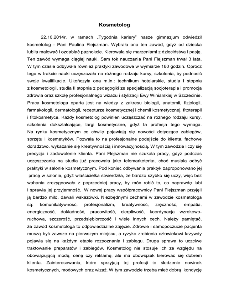 Kosmetolog 22.10.2014r. w ramach „Tygodnia kariery” nasze gimnazjum odwiedził kosmetolog - Pani Paulina Flejszman. Wybrała ona ten zawód, gdyż od dziecka lubiła malować i ozdabiać paznokcie. Kierowała się marzeniami z dzieciństwa i pasją. Ten zawód wymaga ciągłej nauki. Sam tok nauczania Pani Flejszman trwał 3 lata. W tym czasie odbywała również praktyki zawodowe w wymiarze 160 godzin. Oprócz tego w trakcie nauki uczęszczała na różnego rodzaju kursy, szkolenia, by podnosić swoje kwalifikacje. Ukończyła ona m.in.: technikum hotelarskie, studia I stopnia z kosmetologii, studia II stopnia z pedagogiki ze specjalizacją socjoterapia i promocja zdrowia oraz szkołę profesjonalnego wizażu i stylizacji Ewy Winiarskiej w Szczecinie. Praca kosmetologa oparta jest na wiedzy z zakresu biologii, anatomii, fizjologii, farmakologii, dermatologii, recepturze kosmetycznej i chemii kosmetycznej, fitoterapii i fitokosmetyce. Każdy kosmetolog powinien uczęszczać na różnego rodzaju kursy, szkolenia dokształcające, targi kosmetyczne, gdyż ta profesja tego wymaga. Na rynku kosmetycznym co chwilę pojawiają się nowości dotyczące zabiegów, sprzętu i kosmetyków. Pozwala to na profesjonalne podejście do klienta, fachowe doradztwo, wykazanie się kreatywnością i innowacyjnością. W tym zawodzie liczy się precyzja i zadowolenie klienta. Pani Flejszman nie szukała pracy, gdyż podczas uczęszczania na studia już pracowała jako telemarketerka, choć musiała odbyć praktyki w salonie kosmetycznym. Pod koniec odbywania praktyk zaproponowano jej pracę w salonie, gdyż właścicielka stwierdziła, że bardzo szybko się uczy, więc bez wahania zrezygnowała z poprzedniej pracy, by móc robić to, co naprawdę lubi i sprawia jej przyjemność. W nowej pracy współpracownicy Pani Flejszman przyjęli ją bardzo miło, dawali wskazówki. Niezbędnymi cechami w zawodzie kosmetologa są: komunikatywność, energiczność, profesjonalizm, dokładność, pracowitość, kreatywność, cierpliwość, zręczność, koordynacja empatia, wzrokowo- ruchowa, szczerość, przedsiębiorczość i wiele innych cech. Należy pamiętać, że zawód kosmetologa to odpowiedzialne zajęcie. Zdrowie i samopoczucie pacjenta muszą być zawsze na pierwszym miejscu, a ryzyko zrobienia człowiekowi krzywdy pojawia się na każdym etapie rozpoznania i zabiegu. Druga sprawa to uczciwe traktowanie preparatów i zabiegów. Kosmetolog nie stosuje ich ze względu na obowiązującą modę, cenę czy reklamę, ale ma obowiązek kierować się dobrem klienta. Zainteresowania, które sprzyjają tej profesji to śledzenie nowinek kosmetycznych, modowych oraz wizaż. W tym zawodzie trzeba mieć dobrą kondycję fizyczną. Jest to praca stojąca jak i siedząca, wymagająca użycie większej siły lub mniejszej, to wszystko jest uzależnione od tego, co robi się w danym momencie, np.: wykonując masaż ciała – musimy użyć znacznie większej siły, a robiąc masaż twarzy wykazujemy się delikatnością. Zapewne trzeba mieć w pełni sprawne ręce oraz sokoli wzrok. Po ukończeniu szkoły kosmetycznej można pracować w gabinecie kosmetyczny jako pracownik lub można być szefem samym dla siebie, gdy zdecydujemy się założyć własną działalność gospodarczą. Po ukończeniu studiów można znaleźć pracę w instytutach medycyny estetycznej oraz jako pomoc dermatologa. Swoją pracę Pani Flejszman zaczęła już będąc w gimnazjum, w czasie trwania wakacji uczestniczyła z ciocią w targach i pomagała jej w sprzedaży i pilnowaniu towaru – jest z tego dumna, gdyż sama zarabiała na swoje wydatki i co najważniejsze, nauczyła się szanować każdy grosz. W trzeciej klasie gimnazjum została konsultantką AVON, którą jest aż do dziś. Potem pracowała jako telemarketerka w Słupcy. Po zdaniu matury na chwilę zatrzymała się w hotelu na stanowisku kelnerki, a dalej pracowała w Koninie jako telemarketerka i pracownik biurowy wystawiając faktury. Po ukończeniu studiów I stopnia pracowała już jako kosmetolog w dwóch różnych gabinetach. W trakcie rozpoczęcia studiów II stopnia zaczęła pracę jako wykładowca w szkole oraz jako instruktor prowadząc różne szkolenia oraz jako wolontariuszka w M-GOPS w Kleczewie, to zajęcie trwa do dziś. Od roku prowadzi własną działalność gospodarczą oraz prowadzi szkolenie w różnych instytucjach. Kobiecie marzy się własna sieć gabinetów kosmetycznych oraz założenie własnej szkoły. Chciałaby mieć pod sobą wyszkoloną kadrę profesjonalistów. Największą satysfakcję daje jej zadowolenie klienta i uśmiech na jego twarzy oraz to, że w życiu robi to co lubi. Znalezienie pracy w tym zawodzie zależy przede wszystkim od umiejętności w tym zawodzie w dużej mierze liczy się praktyka i doświadczenie, gdyż jest to praca wbrew pozorom bardzo odpowiedzialna. Po prostu trzeba mieć to coś, ten dryg do pracy. Zawód kosmetologa jest zawodem z przyszłością, ponieważ dziś raczej wiele osób już nie wyobraża sobie życia bez wizyt u kosmetyczki. Chcesz wiedzieć więcej, zajrzyj na strony: http://www.perspektywy.pl/index.php?option=com_content&task=view&id=1734&Itemid=5 72 http://maturana6.pl/zawody/kosmetolog http://www.swsm.pl/studia-i-stopnia/kosmetologia/zawod-kosmetolog