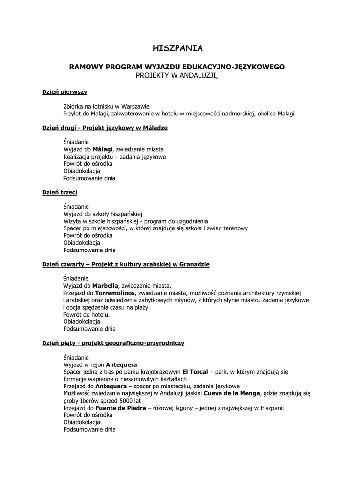 HISZPANIA RAMOWY PROGRAM WYJAZDU EDUKACYJNO-JĘZYKOWEGO PROJEKTY W ANDALUZJI, Dzień pierwszy Zbiórka na lotnisku w Warszawie Przylot do Malagi, zakwaterowanie w hotelu w miejscowości nadmorskiej, okolice Malagi Dzień drugi - Projekt językowy w Máladze Śniadanie Wyjazd do Málagi, zwiedzanie miasta Realizacja projektu – zadania językowe Powrót do ośrodka Obiadokolacja Podsumowanie dnia Dzień trzeci Śniadanie Wyjazd do szkoły hiszpańskiej Wizyta w szkole hiszpańskiej - program do uzgodnienia Spacer po miejscowości, w której znajduje się szkoła i zwiad terenowy Powrót do ośrodka Obiadokolacja Podsumowanie dnia Dzień czwarty – Projekt z kultury arabskiej w Granadzie Śniadanie Wyjazd do Marbella, zwiedzanie miasta. Przejazd do Torremolinos, zwiedzanie miasta, moŜliwość poznania architektury rzymskiej i arabskiej oraz odwiedzenia zabytkowych młynów, z których słynie miasto. Zadania językowe i opcja spędzenia czasu na plaŜy. Powrót do hotelu. Obiadokolacja Podsumowanie dnia Dzień piąty - projekt geograficzno-przyrodniczy Śniadanie Wyjazd w rejon Antequera Spacer jedną z tras po parku krajobrazowym El Torcal – park, w którym znajdują się formacje wapienne o niesamowitych kształtach Przejazd do Antequera – spacer po miasteczku, zadania językowe MoŜliwość zwiedzania największej w Andaluzji jaskini Cueva de la Menga, gdzie znajdują się groby Iberów sprzed 5000 lat Przejazd do Fuente de Piedra – róŜowej laguny – jednej z największej w Hiszpanii Powrót do ośrodka Obiadokolacja Podsumowanie dnia Dzień szósty Śniadanie, Wyjazd do Granady Realizacja projektu – zadania językowe Powrót do ośrodka Obiadokolacja Podsumowanie dnia Dzień siódmy Śniadanie Konkurs wiedzy o Hiszpanii i Andaluzji – zajęcia jezykowe Podsumowanie programu – wypełnianie ankiety ewaluacyjnej Obiadokolacja Dzień ósmy Śniadanie Pakowanie bagaŜy, wykwaterowanie z hotelu Wylot do Polski Przylot do Polski Organizatorzy roszczą sobie prawo do zmiany kolejności poszczególnych dni i zmian programowych – szkoła hiszpańska. Cena wyjazdu edukacyjno-językowego do Andaluzji wynosi 1769zł i obejmuje transport samolotem-tanie linie oraz przewóz na miejscu luksusowym autokarem lub komunikacją lokalną, zakwaterowanie w hotelu 2-gwiazdkowym, wyŜywienie (2 posiłki dziennie), pilotprzewodnik, koszt przygotowanych materiałów i zeszytów edukacyjnych. Wszyscy uczestnicy zabierają aktualny paszport. Opcjonalne wejścia dodatkowo płatne, (stan na 10.10.2006r.) Ostateczne ceny zostaną podane na miesiąc przed realizacją programu: Alhambra y Generalife w Granadzie – 10 EURO/os. Katedra w Granadzie - 3 EURO/os., Capilla Real - 3 EURO/os. Monasterio de la Cartuja – 2,50 EURO/os. Muzeum Picassa w Maladze – 6 EURO/os. (ekspozycja stała) Wycieczka na Gibraltar – 18 EURO/os. (transport+przewodnik) Dopłata do 3 posiłku- 29 Euro Projekt w Gibraltarze – 35 EURO/os. ZAŁĄCZNIK DO RAMOWEGO PROGRAMU DO HISZPANII ANDALUZJA Przesyłam informacje dotyczące wyjazdów w strefie hiszpańskojęzycznej uwzględnieniem projektu edukacyjno-językowego do Hiszpanii - Andaluzja. Transport: Samolot i na miejscu autokar lub transport komunikacją lokalną. Zakwaterowanie: ze szczególnym Grupa będzie zakwaterowana w hotelu dwugwiazdkowym na Costa del Sol. Pokoje są 2, 3 i 4osobowe z łazienkami. WyŜywienie – kuchnia hiszpańska: WyŜywienie to dwa posiłki dziennie – śniadanie i obiadokolacja, kuchnia hiszpańska. Posiłki serwowane są w formie tzw. stołu szwedzkiego”. Hospitacja w szkole hiszpańskiej: Hospitacja w szkole hiszpańskiej trwa 1 dzień. Hospitacja polega na zwiedzaniu szkoły i uczestniczeniu w zajęciach lekcyjnych lub specjalnie przygotowanych warsztatach. Zajęcia w ośrodku: Istnieje moŜliwość zorganizowania warsztatów z języka angielskiego lub hiszpańskiego i kultury hiszpańskiej w oparciu o wcześniejszą konsultację z nauczycielem. Zeszyty edukacyjne i zadania językowe dostosowane są do poziomu językowego uczniów, który nauczyciele określają w ankiecie uszczegóławiającej. DłuŜszy program: Istnieje moŜliwość wydłuŜenia programu o jeden lub kilka dni. Chęć taką szkoła musi zgłosić przed podpisaniem umowy. Koszt dodatkowego dnia projektu edukacyjno-językowego w Hiszpanii w czasie roku szkolnego wynosi 100 zł. (zakwaterowanie i wyŜywienie). Lista szkół: Na Ŝyczenie szkoły ECM moŜe przesłać listę ponad 100 szkół z całej Polski, które regularnie uczestniczą w naszych projektach.