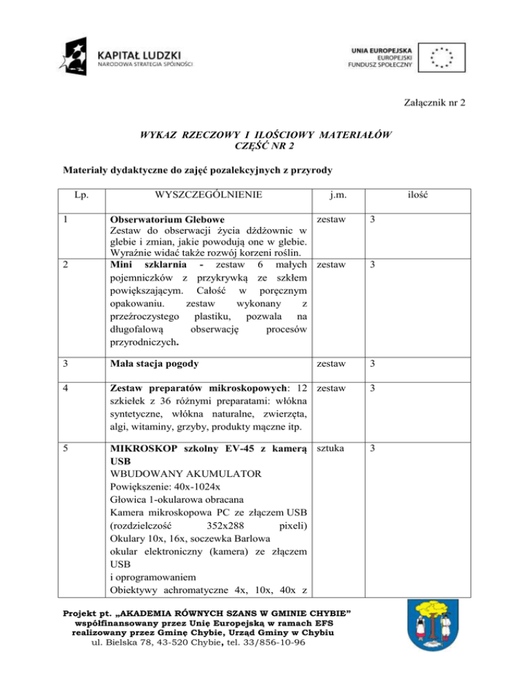 Załącznik nr 2 WYKAZ RZECZOWY I ILOŚCIOWY MATERIAŁÓW CZĘŚĆ NR 2 Materiały dydaktyczne do zajęć pozalekcyjnych z przyrody Lp. 1 WYSZCZEGÓLNIENIE ilość j.m. zestaw Obserwatorium Glebowe Zestaw do obserwacji życia dżdżownic w glebie i zmian, jakie powodują one w glebie. Wyraźnie widać także rozwój korzeni roślin. Mini szklarnia - zestaw 6 małych zestaw pojemniczków z przykrywką ze szkłem powiększającym. Całość w poręcznym opakowaniu. zestaw wykonany z przeźroczystego plastiku, pozwala na długofalową obserwację procesów przyrodniczych. 3 3 Mała stacja pogody zestaw 3 4 Zestaw preparatów mikroskopowych: 12 zestaw szkiełek z 36 różnymi preparatami: włókna syntetyczne, włókna naturalne, zwierzęta, algi, witaminy, grzyby, produkty mączne itp. 3 5 MIKROSKOP szkolny EV-45 z kamerą sztuka USB WBUDOWANY AKUMULATOR Powiększenie: 40x-1024x Głowica 1-okularowa obracana Kamera mikroskopowa PC ze złączem USB (rozdzielczość 352x288 pixeli) Okulary 10x, 16x, soczewka Barlowa okular elektroniczny (kamera) ze złączem USB i oprogramowaniem Obiektywy achromatyczne 4x, 10x, 40x z 3 2 Projekt pt. „AKADEMIA RÓWNYCH SZANS W GMINIE CHYBIE” współfinansowany przez Unię Europejską w ramach EFS realizowany przez Gminę Chybie, Urząd Gminy w Chybiu ul. Bielska 78, 43-520 Chybie, tel. 33/856-10-96 3 teleskopem Kondensor N.A. 0,65 z przesłoną 6pozycyjną Blokada przed zgnieceniem preparatu Stabilny metalowy korpus pokryty utwardzaną emalią odporna na zarysowania i odczynniki Stolik z mechanizmem krzyżowym przemieszczania preparatu (zdjęcie) Płynna regulacja ostrości współosiowymi pokrętłami mikro/makro Oświetlenie diodowe LED (przechodzące i odbite) z regulacją jasności (odpowiednik 20W), zasilacz zewnętrzny sztuka Globus fizyczny Średnica 32 cm Atlas – Nowy Atlas – Przyroda. Świat sztuka wokół nas. – wyd. Nowa Era 6 7 3 40 Materiały dydaktyczne do zajęć pozalekcyjnych z informatyki Lp. WYSZCZEGÓLNIENIE ilość j.m. 1 Oprogramowanie komputerowe do nauki sztuka programowania i rysowania LOGOMOCJA–polska edycja IMAGINE (Logo Komeniusz) Edukacyjny program do tworzenia figur geometrycznych 3 2 Oprogramowanie komputerowe do nauki sztuka programowania stron WWW – 3 PAJĄCZEK 5 NxG Professional 3 PENDRIVE Pojemność 8 GB, złącze USB, szybkość zapisu 9MB/s, szybkość odczytu 18 MB/s sztuka Projekt pt. „AKADEMIA RÓWNYCH SZANS W GMINIE CHYBIE” współfinansowany przez Unię Europejską w ramach EFS realizowany przez Gminę Chybie, Urząd Gminy w Chybiu ul. Bielska 78, 43-520 Chybie, tel. 33/856-10-96 40 Materiały dydaktyczne do zajęć pozalekcyjnych z matematyki Lp. 1 2 3 4 5 WYSZCZEGÓLNIENIE Koło magnetyczne-ułamki- ułamkowe koła magnetyczne ( 9 kół o średnicy 20 cm łącznie 51 elementów wykonane z foli magnetycznej) Ułamkowa pizza – magnetyczna – 6 pizz (łącznie 24 kawałki, śr. 20,3 cm) Zestaw plansz matematycznych dla uczniów szkół podstawowych Liczydło stojące wymiary:85x120 cm Domino matematyczne: Domino-badanie kątów – układanka dydaktyczna służąca utrwalaniu wiadomości o własnościach kątów w określonych figurach. Kostki domina wykonane są z grubego tworzywa.(24 kostki domina) Domino – działanie na ułamkach dziesiętnych – Domino umożliwia samodzielne ćwiczenia uczniów w zakresie wykonywania działań na ułamkach dziesiętnych. Komplet zawiera 10 różnych układanek, różniących się kolorem dla ułatwienia sortowania. 10 układanek po 15 tafelków każda, wymiary tafelka 6 x 2 cm, drewniane pudełko Domino – ułamki niewłaściwe i liczby – 24 kostki domina o wymiarze 4 x 8 cm Domino – dopełnianie do 100 – 24 kostki domina wykonane z grubego tworzywa (brzegi bezpiecznie zaokrąglone) wymiar kostki: 4 x 8 cm Zestaw brył – bryły porównawcze – 10 cm, 17 sztuk, pięć różnych zestawów, każda bryła posiada ruchomą podstawę, bryły można j.m. zestaw 2 zestaw 2 sztuka 2 zestaw 2 zestaw 2 Projekt pt. „AKADEMIA RÓWNYCH SZANS W GMINIE CHYBIE” współfinansowany przez Unię Europejską w ramach EFS realizowany przez Gminę Chybie, Urząd Gminy w Chybiu ul. Bielska 78, 43-520 Chybie, tel. 33/856-10-96 ilość napełniać kaszą lub wodą. budujemy szkielety brył – 180 kolorowych kulek o średnicy 1,6 cm, 180 patyczków o długości od 1,6 do 7,5 cm, wykonane z tworzywa Zestaw gier matematycznych/logicznych zestaw 32 dla uczniów - 6 Materiały dydaktyczne do zajęć z nauczania zintegrowanego Lp. 1 2 3 WYSZCZEGÓLNIENIE j.m Zestaw Zestaw plansz „Praca w różnych zawodach – zestaw ilustracji . „Instrumenty muzyczne plansza dydaktyczna” zestaw Gry edukacyjne: Moje laboratorium Fizyka: Zestaw „Moje Laboratorium - Fizyka" przeznaczony jest dla dzieci i młodzieży ciekawych świata, których fascynuje eksperymentowanie i samodzielne odkrywanie praw fizyki. Doświadczanie zjawisk i samodzielne dochodzenie do rozwiązań prowadzi do uzyskania bezcennej, praktycznej wiedzy, której nie da się porównać z wiedzą zdobytą teoretycznie. Zestaw zawiera sprzęt i szczegółowe opisy niezbędne do wykonania 256 bezpiecznych doświadczeń o zróżnicowanym stopniu trudności: od bardzo prostych do bardzo skomplikowanych. „Moje Laboratorium. Ekologia „Poznajemy godziny, „Poznajemy miesiące i pory roku „Junior – elektroniczna gra edukacyjna”, zestaw Zestaw Instrumentów muzycznych: Deszczowy kij –instrument w formie przezroczystej rury wypełnionej kolorowymi zastawkami i koralikami ilość 3 3 3 Projekt pt. „AKADEMIA RÓWNYCH SZANS W GMINIE CHYBIE” współfinansowany przez Unię Europejską w ramach EFS realizowany przez Gminę Chybie, Urząd Gminy w Chybiu ul. Bielska 78, 43-520 Chybie, tel. 33/856-10-96 4 Wywoływacz burzy – instrument do wytwarzania specjalnych efektów dźwiękowych podobnych do burzy Drewniany ksylofon Kolorowy metalofon – metalofon diatoniczny z 8 aluminiowymi rurkami w kolorach odpowiadających 