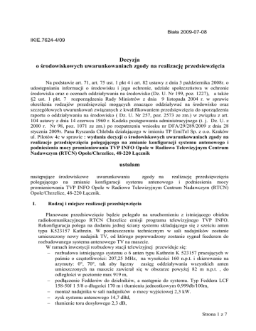 Biała 2009-07-08 IKIE.7624-4/09 Decyzja o środowiskowych uwarunkowaniach zgody na realizację przedsiewzięcia Na podstawie art. 71, art. 75 ust. 1 pkt 4 i art. 82 ustawy z dnia 3 października 2008r. o udostępnianiu informacji o środowisku i jego ochronie, udziale społeczeństwa w ochronie środowiska oraz o ocenach oddziaływania na środowisko (Dz. U. Nr 199, poz. 1227), a także §2 ust. 1 pkt. 7 rozporządzenia Rady Ministrów z dnia 9 listopada 2004 r. w sprawie określenia rodzajów przedsięwzięć mogących znacząco oddziaływać na środowisko oraz szczegółowych uwarunkowań związanych z kwalifikowaniem przedsięwzięcia do sporządzenia raportu o oddziaływaniu na środowisko ( Dz. U. Nr 257, poz. 2573 ze zm.) w związku z art. 104 ustawy z dnia 14 czerwca 1960 r. Kodeks postępowania administracyjnego (t. j. Dz. U. z 2000 r. Nr 98, poz. 1071 ze zm.) po rozpatrzeniu wniosku nr DFA/29/289/2009 z dnia 28 stycznia 2009r. Pana Ryszarda Chlebda działającego w imieniu TP EmiTel Sp. z o.o. Kraków ul. Pilotów 4c w sprawie : wydania decyzji o środowiskowych uwarunkowaniach zgody na realizacje przedsięwzięcia polegającego na zmianie konfiguracji systemu antenowego i podniesienia mocy promieniowania TVP INFO Opole w Radiowo Telewizyjnym Centrum Nadawczym (RTCN) Opole/Chrzelice, 48-220 Łącznik ustalam następujące środowiskowe uwarunkowania zgody na realizację przedsięwzięcia polegającego na zmianie konfiguracji systemu antenowego i podniesienia mocy promieniowania TVP INFO Opole w Radiowo Telewizyjnym Centrum Nadawczym (RTCN) Opole/Chrzelice, 48-220 Łącznik. I. Rodzaj i miejsce realizacji przedsięwzięcia Planowane przedsiewzięcie będzie polegało na uruchomieniu z istniejącego obiektu radiokomunikacyjnego RTCN Chrzelice emisji programu telewizyjnego TVP INFO. Rekonfiguracja polega na dodaniu jednej ściany systemu składającego się z sześciu anten typu K523157 Kathrein. W pomieszczeniu technicznym w sali nadajników zostanie umieszczony nowy nadajnik TV, od którego poprowadzony zostanie sygnał feederem do rozbudowanego systemu antenowego TV na maszcie. W ramach inwestycji rozbudowy stacji telewizyjnej przewiduje się: − rozbudowa istniejącego systemu o 6 anten typu Kathrein K 523157 pracujących w paśmie o częstotliwości: 207,25 MHz, na wysokości 160 n.p.t. i skierowanie na azymuty: 0°, 70°, tak aby łączny zasięg oddziaływania wszystkich anten umieszczonych na maszcie zawierał się w obszarze powyżej 82 m n.p.t. , do odległości w poziomie max 919 m, − podłączenie Fedderów do dzielników, a następnie do systemu. Typ Feddera LCF 158-50J 1 5/8 o długości 170 m i tłumieniu jednostkowym 0,999db/100m, − montaż nadajnika w sali nadajników o mocy wyjściowej 2,3 kW. − zysk systemu antenowego 14,7 dBd, − tłumienie toru dosyłowego 2,3 dB, Strona 1 z 7 − maksymalna moc promieniowania ERP – 40 kW, − wymagana moc koncesyjna 40 kW II. Warunki wykorzystania terenu w fazie realizacji i eksploatacji: 1. Planowane przedsiewzięcie będzie realizowane i eksploatowane z uwzględniniem następujacych warunków: − w celu ograniczenia uciążliwości hałasowej prace budowlane prowadzić w porze dziennej ( między 6.00 – 22.00), − powstające w trakcie przebudowy i eksploatacji odpady należy segregować i gromadzić w przeznaczonych do tego pojemnikach i sukcesywnie oddawać je specjalistycznym firmom w celu dalszego ich zagospodarowania, − sporządzić analizę porealizacyjną w zkresie pól elektromagnetycznych. Pomiary mają być prowadzone na obszarach zabudowy mieszkaniowej, bezpośredno po rozpoczęciu użytkowania instalacji (urządzenia) oraz każdorazowo w razie zmiany warunków pracy instalacji ( urządzenia) i przedstawienia jej w terminie 14 dni od dnia oddania instalacji (urządzenia) do użytkowania oraz 14 dni od zmiany warnków pracy instalacji (urzadzenia). 2. Wymagania dotyczące ochrony środowiska konieczne do uwzględnienia w projekcie budowlanych. moc EIRP dla projektowanego przedsiewzięcia nie będzie przekraczać 65,5 kW, maksymalny zasięg obszaru o ponadnormatywnym promieniowaniu PEM w cz.(E=7V/m) tylko dla uruchamianego programu nie będzie przekraczać ok. 191m na azymucie 350 na wysokości 160 m n.p.t., minimalna wysokość obszaru (E=7V/m) dla projektowanego przedsiewzięcia będzie wynosić 130m n.p.t. w odległości 14m od systemu, przy uwzględnieniu pozostałych pracujących urządzeń tj. istniejących systemów TV UKF, maksymalny zasięg obszaru W>1 będzie znajdować się na azymucie 450 i wnosić będzie nie więcej niż 919 m na wysokości 183 m n.p.t., minimalna wysokość występowania pól o wartościach ponadnormatywnych wynosić będzie nie mniej niż 82 m n.p.t w odległosci 110 m od masztu na azymucie 450 system antenowy zasilać feederem 1 5/8 z dielektrykiem piankowym, o długości 170 m . Feeder prowadzić po istniejącym trakcie kablowym, do sali nadajników, zaprojektować planowane przedsięwzięcie w optymalnym powiązaniu z istniejącymi instalacjami oraz obecnym zagospodarowaniem terenu, przewidzieć rozwiązania techniczne eliminujące, ewentualnie minimalizujące negatywny wpływ przedsięwzięcia na środowisko, zdrowie ludzi i obiekty budowlane, gospodarkę odpadami prowadzić zgodnie z ustawą o odpadach i aktami wykonawczymi do niej oraz posiadanymi i obowiązującymi umowami, zawartymi z uprawnionymi podmiotami, posiadającymi stosowane zezwolenia wymagane przepisami prawa. 3. Wymogi w zakresie przeciwdziałania skutkom awarii przemysłowych w odniesieniu do przedsiewzięc zaliczanych do zakładów stwarzajacych zagrożenie wystapienia poważnych awarii. Strona 2 z 7 Nie dotyczy przedmiotowego przedsięwzięcia 4. Wymogi w zakresie ograniczania transgranicznego oddziaływania na środowisko w odniesieniu do przedsięwzięć, dla których przeprowadzono postępowanie dotyczące transgranicznego oddziaływania na środowisko. Przedmiotowe przedsięwzięcie nie wym