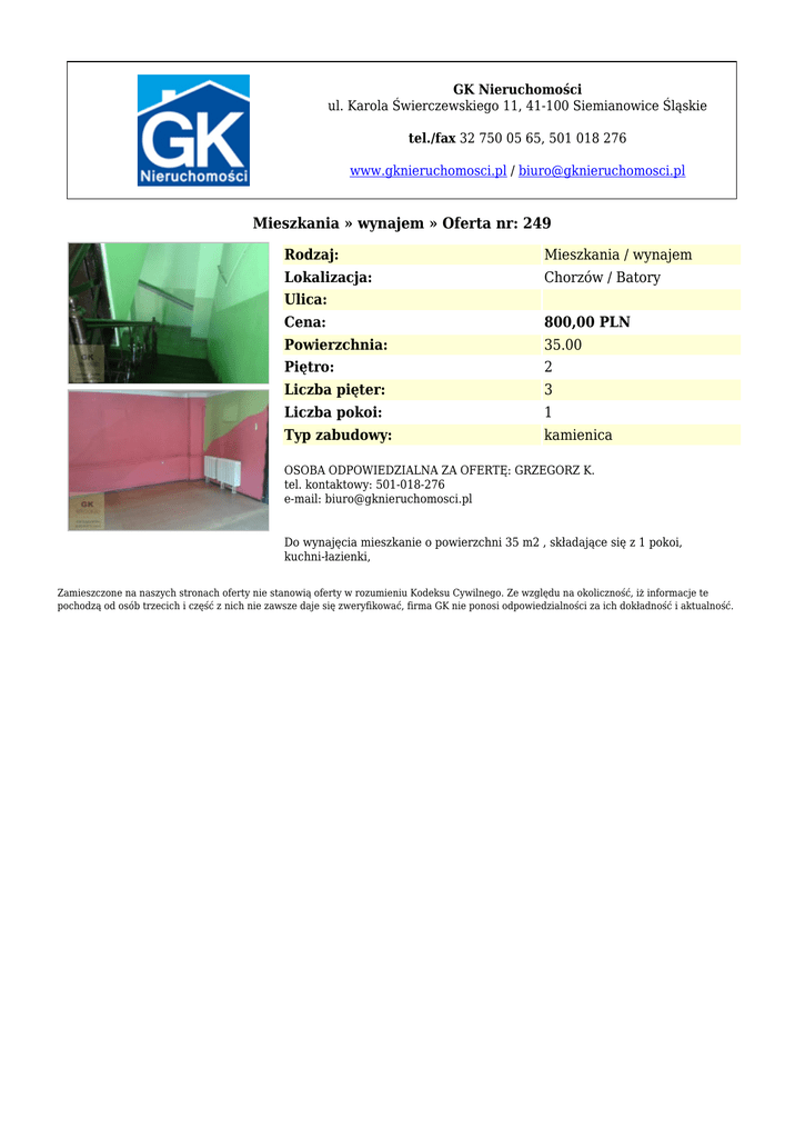 GK Nieruchomości ul. Karola Świerczewskiego 11, 41-100 Siemianowice Śląskie tel./fax 32 750 05 65, 501 018 276 www.gknieruchomosci.pl / [email protected] Mieszkania » wynajem » Oferta nr: 249 Rodzaj: Mieszkania / wynajem Lokalizacja: Chorzów / Batory Ulica: Cena: 800,00 PLN Powierzchnia: 35.00 Piętro: 2 Liczba pięter: 3 Liczba pokoi: 1 Typ zabudowy: kamienica OSOBA ODPOWIEDZIALNA ZA OFERTĘ: GRZEGORZ K. tel. kontaktowy: 501-018-276 e-mail: [email protected] Do wynajęcia mieszkanie o powierzchni 35 m2 , składające się z 1 pokoi, kuchni-łazienki, Zamieszczone na naszych stronach oferty nie stanowią oferty w rozumieniu Kodeksu Cywilnego. Ze względu na okoliczność, iż informacje te pochodzą od osób trzecich i część z nich nie zawsze daje się zweryfikować, firma GK nie ponosi odpowiedzialności za ich dokładność i aktualność.