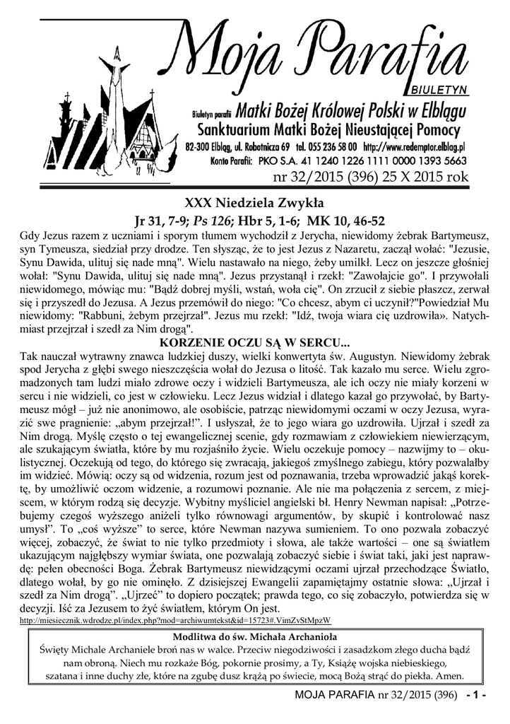 nr 32/2015 (396) 25 X 2015 rok I XXX Niedziela Zwykła Jr 31, 7-9; Ps 126; Hbr 5, 1-6; MK 10, 46-52 Gdy Jezus razem z uczniami i sporym tłumem wychodził z Jerycha, niewidomy żebrak Bartymeusz, syn Tymeusza, siedział przy drodze. Ten słysząc, że to jest Jezus z Nazaretu, zaczął wołać: "Jezusie, Synu Dawida, ulituj się nade mną". Wielu nastawało na niego, żeby umilkł. Lecz on jeszcze głośniej wołał: "Synu Dawida, ulituj się nade mną". Jezus przystanął i rzekł: "Zawołajcie go". I przywołali niewidomego, mówiąc mu: "Bądź dobrej myśli, wstań, woła cię". On zrzucił z siebie płaszcz, zerwał się i przyszedł do Jezusa. A Jezus przemówił do niego: "Co chcesz, abym ci uczynił?"Powiedział Mu niewidomy: "Rabbuni, żebym przejrzał". Jezus mu rzekł: "Idź, twoja wiara cię uzdrowiła». Natychmiast przejrzał i szedł za Nim drogą". KORZENIE OCZU SĄ W SERCU... Tak nauczał wytrawny znawca ludzkiej duszy, wielki konwertyta św. Augustyn. Niewidomy żebrak spod Jerycha z głębi swego nieszczęścia wołał do Jezusa o litość. Tak kazało mu serce. Wielu zgromadzonych tam ludzi miało zdrowe oczy i widzieli Bartymeusza, ale ich oczy nie miały korzeni w sercu i nie widzieli, co jest w człowieku. Lecz Jezus widział i dlatego kazał go przywołać, by Bartymeusz mógł – już nie anonimowo, ale osobiście, patrząc niewidomymi oczami w oczy Jezusa, wyrazić swe pragnienie: „abym przejrzał!”. I usłyszał, że to jego wiara go uzdrowiła. Ujrzał i szedł za Nim drogą. Myślę często o tej ewangelicznej scenie, gdy rozmawiam z człowiekiem niewierzącym, ale szukającym światła, które by mu rozjaśniło życie. Wielu oczekuje pomocy – nazwijmy to – okulistycznej. Oczekują od tego, do którego się zwracają, jakiegoś zmyślnego zabiegu, który pozwalałby im widzieć. Mówią: oczy są od widzenia, rozum jest od poznawania, trzeba wprowadzić jakąś korektę, by umożliwić oczom widzenie, a rozumowi poznanie. Ale nie ma połączenia z sercem, z miejscem, w którym rodzą się decyzje. Wybitny myśliciel angielski bł. Henry Newman napisał: „Potrzebujemy czegoś wyższego aniżeli tylko równowagi argumentów, by skupić i kontrolować nasz umysł”. To „coś wyższe” to serce, które Newman nazywa sumieniem. To ono pozwala zobaczyć więcej, zobaczyć, że świat to nie tylko przedmioty i słowa, ale także wartości – one są światłem ukazującym najgłębszy wymiar świata, one pozwalają zobaczyć siebie i świat taki, jaki jest naprawdę: pełen obecności Boga. Żebrak Bartymeusz niewidzącymi oczami ujrzał przechodzące Światło, dlatego wołał, by go nie ominęło. Z dzisiejszej Ewangelii zapamiętajmy ostatnie słowa: „Ujrzał i szedł za Nim drogą”. „Ujrzeć” to dopiero początek; prawda tego, co się zobaczyło, potwierdza się w decyzji. Iść za Jezusem to żyć światłem, którym On jest. http://miesiecznik.wdrodze.pl/index.php?mod=archiwumtekst&id=15723#.VimZvStMpzW Modlitwa do św. Michała Archanioła Święty Michale Archaniele broń nas w walce. Przeciw niegodziwości i zasadzkom złego ducha bądź nam obroną. Niech mu rozkaże Bóg, pokornie prosimy, a Ty, Książę wojska niebieskiego, szatana i inne duchy złe, które na zgubę dusz krążą po świecie, mocą Bożą strąć do piekła. Amen. MOJA PARAFIA nr 32/2015 (396) - 1 - ZAPRASZAMY W ROKU ŻYCIA KONSEKROWANEGO DO WSPÓLNEJ MODLITWY ZA WSZYSTKIE OSOBY ŻYCIA KONSEKROWANEGO DIECEZJI ELBLĄSKIEJ Poniedziałek 9 listopada 2015 ROKU SANKTUARIUM MATKI BOŻEJ NIEUSTAJĄCEJ POMOCY W ELBLĄGU PROGRAM UROCZYSTOŚCI godz. 17.30 - Rozpoczęcie transmisji w Radio Maryja i Telewizji TRWAM godz. 17.40 - Program muzyczno - słowny pt. “ Młodzi o życiu konsekrowanym” godz. 18.00 - Modlitwa Anioł Pański i spotkanie z Ojcem z Radia Maryja godz. 18.20 - Msza św. koncelebrowana. Przewodniczy i homilię wygłosi: J.E. Ks. Bp dr Jacek Jezierski, Biskup elbląski Zapraszają w imieniu Osób Życia konsekrowanego Diecezji elbląskiej O. Piotr Wiśniewski CSsR Referent Diecezjalny ds. Zakonów Męskich S. Justyna Józefko RM Referentka Diecezjalna ds Zakonów Żeńskich Różaniec – październik wtorek godz. 7:30, sobota godz. 11:30, w pozostałe dni o godz. 17:30 Dla dzieci: poniedziałek, środa, piątek – godz. 16:30 Dziękujemy wszystkim rodzinom i osobom indywidualnym za składane ofiary na wykonywane prace w naszej świątyni! Bóg zapłać! Kancelaria Parafialna czynna od wtorku do czwartku w godz. 1000 – 1200 i 1600 – 1730, w sobotę od godz. 900 do 1030 Sprawy związane z pogrzebem można zgłaszać w każdym dniu. MOJA PARAFIA nr 32/2015 (396) Do użytku wewnętrznego - 2 - Intencje mszalne 7:00 8:00 18:00 Karmel 7:00 8:00 18:00 Karmel 7:00 8:00 18:00 Karmel 7:00 8:00 18:00 Karmel 7:00 8:00 18:00 7:00 8:00 11:00 18:00 7:00 8:30 10:00 11:30 13:00 16:30 18:30 Karmel Poniedziałek26.10 1. + Salomea Krasnow gr.26 1. + Helena, Andrzej i zm. z rodziny Sarosiek 1. Rz 8, 12-17 Ps 68 Łk 13,10-17 Int. za wszystkie rodziny OCD Wtorek 27.10 Rz 8,18-25 Ps 126 Łk 13,18-21 1. + Salomea Krasnow gr.27 1. W int. Ryszarda w 70 r. urodzin; 2. + Maria Sokołowska 1. Int. zbiorowe W int. dobroczyńców Środa 28.10 Rz 8,18-25 Ps 126 Łk 13,18-21 1. + Salomea Krasnow gr.28 1. + Józef Zamaro 1. + z rodziny Górskich; 2. + Barbara Wejnert; 3. +Halina Psiuk, rodziców Barańskich, Teresa Utrata OCD Czwartek 29.10 Rz 8,18-25 Ps 126 Łk 13,18-21 1. + Salomea Krasnow gr.29 1. + Henryk Chmielowski 1. + Jan Garnek ; 2. + Ewa Kempińska; 3. + Józef i Władysława oraz Zofia i Stanisław. OCD Piątek 30.10 1. + Salomea Krasnow gr.30 1. + Ryta i Stanisław Koleśnik 1.+ Józef Szklarczuk; 2. + Jerzy Elżbieta i Stanisław Lewandowscy; 3. + Alicja Dudkowska m-c po śm. Sobota 31.10 Rz 9,1-5 Ps 147 Łk 14,1-6 1. + Zofia, Agnieszka, Jan, zm. z rodz. 1.+ Marianna, Wawrzyniec Dziarmaga, Stanisław Rej; 2. + Krystyna Krajewska i zm. Teresa i Józef 1. + Katarzyna Lud