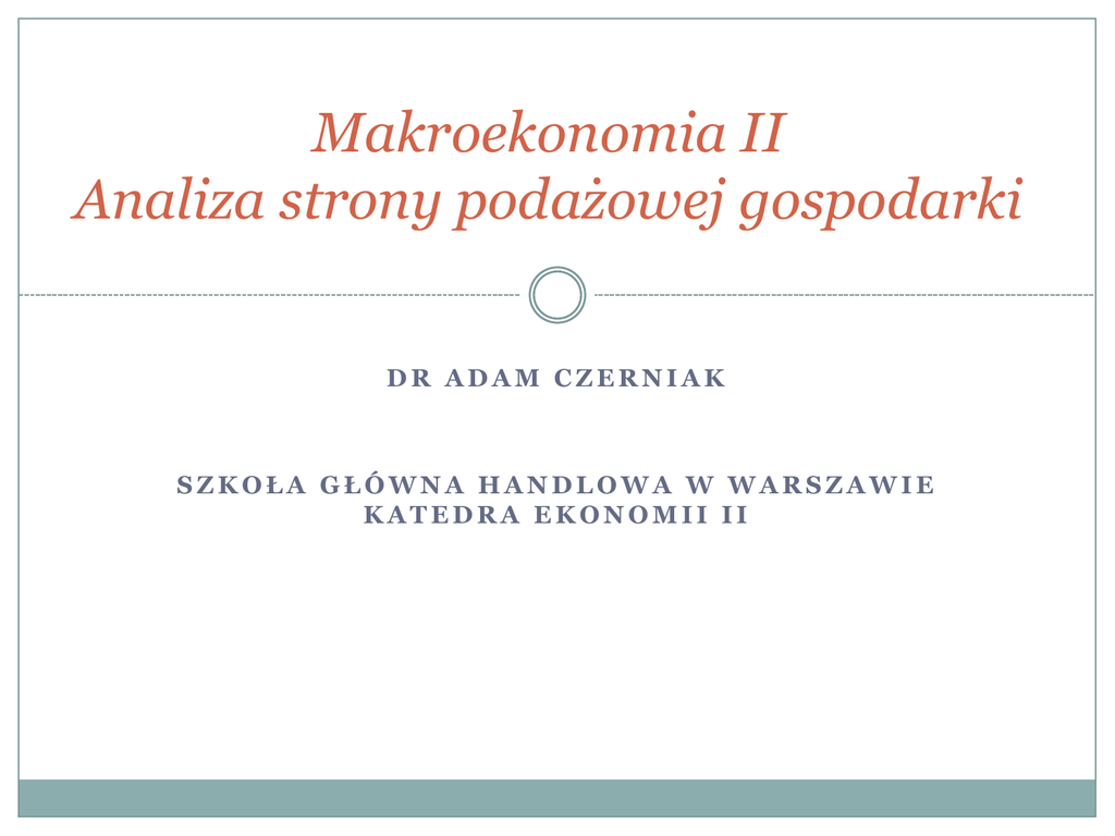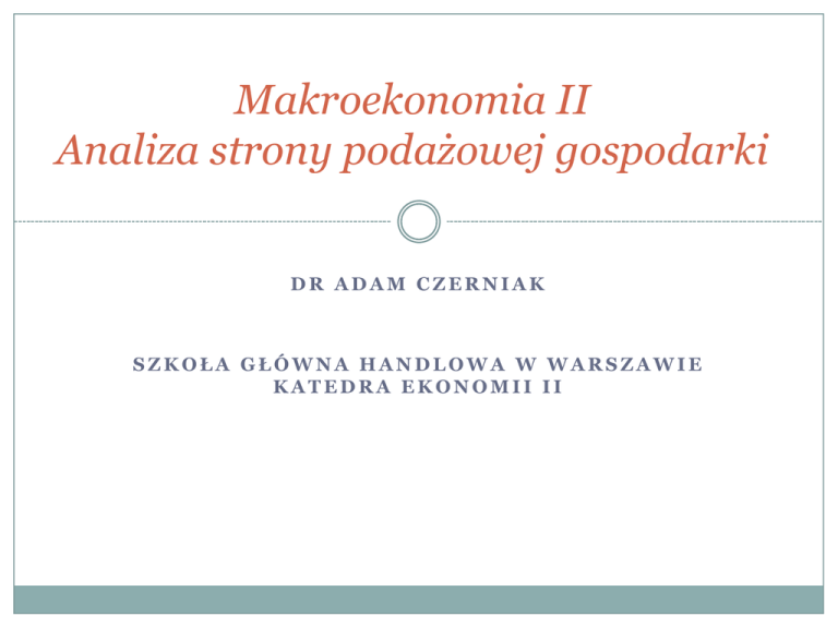 Makroekonomia II Analiza strony podażowej gospodarki DR ADAM CZERNIAK SZKOŁA GŁÓWNA HANDLOWA W WARSZAWIE KATEDRA EKONOMII II 2 GOSPODARKA W STANIE RÓWNOWAGI Adam Czerniak, SGH Strona podażowa Stan równowagi w ujęciu teoretycznym (1) 3 Równowaga – dwie równoważne definicje: Sytuacja, w której popyt jest równy podaży (rynek się oczyszcza). Sytuacja, w której żaden z uczestników rynku nie ma motywacji ekonomicznej do jej zmiany (decyzje firm i konsumentów są optymalne). Zdaniem ekonomistów klasycznych i neoklasycznych w długim okresie gospodarka znajdzie się ceteris paribus w stanie równowagi, tzw. równowagi ogólnej. Równowaga ogólna (równowaga walrasowska) oznacza, że wszystkie rynki w danej gospodarce są w stanie równowagi (tj. dóbr, pracy i pieniądza). Adam Czerniak, SGH Strona podażowa Stan równowagi w ujęciu teoretycznym (2) 4 W krótkookresowym stanie równowagi podmioty gospodarcze nie mają żadnej motywacji do tego, by zmienić w danym okresie swoje decyzje. W długookresowym stanie równowagi podmioty gospodarcze nie mają żadnej motywacji do tego, by zmieniać swoje decyzje także z okresu na okres. W długookresowym stanie równowagi produkcja jest równa produkcji potencjalnej. Długookresowy stan równowagi nigdy nie występuje w rzeczywistości – ma charakter idealno-typowy i może być przybliżony wyłącznie za pomocą modeli ekonomicznych. Adam Czerniak, SGH Strona podażowa Stan równowagi w modelowaniu ekonomicznym 5 Stan równowagi długookresowej jest modelowany jako stan ustalony: W stanie ustalonym wszystkie zmienne modelu są stałe z okresu na okres. W stanie ustalonym wszystkie podmioty gospodarcze (firmy i konsumenci) skutecznie maksymalizują swoje funkcje celu. Stan ustalony może być: stabilny (gospodarka po szoku samoczynnie wraca do równowagi), niestabilny (nawet minimalny szok potrafi na stałe wytrącić gospodarkę z równowagi). Może istnieć kilka stanów ustalonych w jednej gospodarce. Adam Czerniak, SGH Strona podażowa 6 KLASYCZNE ŹRÓDŁA WZROSTU GOSPODARCZEGO Adam Czerniak, SGH Strona podażowa Kapitał 7 Na kapitał w gospodarce składa się wartość: maszyn i urządzeń, budowli i budynków (wraz z ziemią) należących do firm, pojazdów transportowych, dóbr niematerialnych należących do firm. Kapitał powstaje w wyniku inwestycji (nakładów brutto na środki trwałe) i nawarstwia się w sposób stopniowy (perpetual investment). Kapitału ubywa w wyniku deprecjacji wartości majątku i zużycia środków trwałych (amortyzacja). Adam Czerniak, SGH Strona podażowa Praca 8 Podaż pracy (zasób siły roboczej) zależy od: liczby osób w wieku produkcyjnym, wskaźnika aktywności zawodowej, stopy bezrobocia naturalnego (równowagi). Praca nie podlega akumulacji ani amortyzacji. Może być dzielone na zasób wykwalifikowanej i niewykwalifikowanej siły roboczej. Często podaje się wielkość produkcji, czy zasób kapitału w przeliczeniu na jednostkę pracy: zmienne w przeliczeniu na jednostkę pracy oznacza się małymi literami. Adam Czerniak, SGH Strona podażowa Produktywność czynników wytwórczych 9 Najbardziej nieostra kategoria w rachunku produkcji. Produktywność czynników wytwórczych zależy od: wysokości kapitału ludzkiego w gospodarce, know-how produkcyjnego (tj. liczby patentów, stosowanych technologii wytwórczych, zdolności zarządczych), jakości instytucji i polityki gospodarczej kraju, wpływających na łatwość prowadzenia biznesu i koszty transakcyjne, alokacji kapitału między branże, regiony i typy środków trwałych. Często uwzględnia w modelowaniu razem z zasobem siły roboczej lub razem z wysokością kapitału zgromadzonego w gospodarce. Adam Czerniak, SGH Strona podażowa Funkcje produkcji (1) 10 Funkcja produkcji typu Cobba-Douglasa 𝑌 = 𝐹 𝐾, 𝐿 = 𝐴𝐾 𝛼 𝐿𝛽 A – produktywność czynników produkcji K – kapitał, L – zasób siły roboczej α – kapitałochłonność produkcji β – pracochłonność produkcji Adam Czerniak, SGH Strona podażowa Funkcje produkcji (2) 11 Grupa funkcji produkcji o stałej elastyczności substytucji (CES) 𝑌 = 𝐴 𝛼𝐾 𝑟 + 1 𝛽𝐿𝑟 𝑟 Elastyczność substytucji Elastyczność substytucji pokazuje o ile procent należy zmienić nakład jednego czynnika wytwórczego, by skompensować 1-proc. spadek nakładu drugiego czynnika przy zachowaniu tego samego poziomu produkcji. 1 𝑠= 1−𝑟 Przy r = 1 Przy r -> 0 Przy r -> ∞ mamy doskonałą substytucję czynników produkcji otrzymujemy funkcję Cobba-Douglasa otrzymujemy funkcję produkcji Leontiefa (doskonała komplementarność czynników produkcji) 𝑌 = 𝐴𝑚𝑖𝑛 𝐾, 𝐿 lub 𝑌 = 𝑚𝑖𝑛 𝐴𝐾, 𝐿 Adam Czerniak, SGH Strona podażowa Warunki Inady 12 Warunki Inady, to takie właściwości funkcji produkcji, które sprawiają, że nadaje się ona do modelowania ekonomicznego. Warunki Inady oparte są na faktach stylizowanych. 1. F(0,L) = F(K,0) = 0 2. F’(K,L) > 0 3. F’’ (K,L) < 0 4. F(∞,L) = F(K,∞) = ∞ 5. FKL(K,L) > 0 oraz FLK(K,L) > 0 Warunki Inady spełniają wszystkie funkcje typu CES. Adam Czerniak, SGH Strona podażowa Wzrost potencjalny 13 Nieobserwowalne tempo wzrostu produktu potencjalnego. Obrazuje długoterminowe tempo wzrostu gospodarczego w danym kraju. Jest przybliżane: trendem rzeczywistego wzrostu PKB, z wykorzystaniem modelu wzrostu, tempem wzrostu nakładów poszczególnych czynników wytwórczych oraz produktywności tych czynników. ∆𝑌 = ∆𝐴 + 𝛼∆𝐾 + 𝛽∆𝐿 = 𝑔 + 𝑠𝑌 − 𝛿𝐾 + 𝑛 Adam Czerniak, SGH Strona podażowa 14 MODEL SOLOWA (SOLOWA-SWANA) Adam Czerniak, SGH Strona podażowa Konstrukcja modelu (1) 15 W modelu Solowa funkcja produkcji przyjmuje formę Cobba-Douglasa o stałych korzyściach względem skali: 𝑌 = 𝐹 𝐾, 𝐿 = 𝐴𝐾 𝛼 𝐿𝛽 α+β=1 Podstawą modelu Solowa jest endogenizacja zmian kapitału. s – stopa os