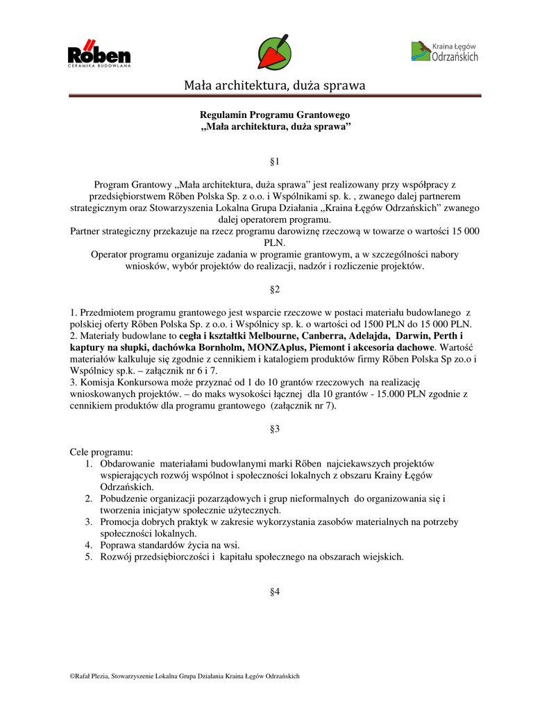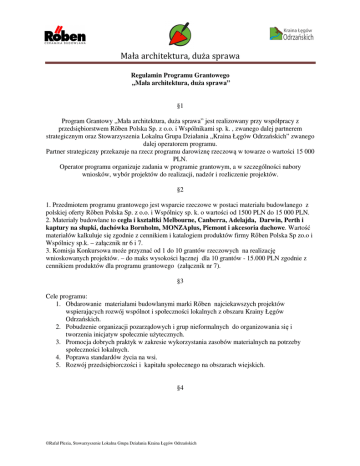 Mała architektura, duża sprawa Regulamin Programu Grantowego „Mała architektura, duża sprawa” §1 Program Grantowy „Mała architektura, duża sprawa” jest realizowany przy współpracy z przedsiębiorstwem Rőben Polska Sp. z o.o. i Wspólnikami sp. k. , zwanego dalej partnerem strategicznym oraz Stowarzyszenia Lokalna Grupa Działania „Kraina Łęgów Odrzańskich” zwanego dalej operatorem programu. Partner strategiczny przekazuje na rzecz programu darowiznę rzeczową w towarze o wartości 15 000 PLN. Operator programu organizuje zadania w programie grantowym, a w szczególności nabory wniosków, wybór projektów do realizacji, nadzór i rozliczenie projektów. §2 1. Przedmiotem programu grantowego jest wsparcie rzeczowe w postaci materiału budowlanego z polskiej oferty Rőben Polska Sp. z o.o. i Wspólnicy sp. k. o wartości od 1500 PLN do 15 000 PLN. 2. Materiały budowlane to cegła i kształtki Melbourne, Canberra, Adelajda, Darwin, Perth i kaptury na słupki, dachówka Bornholm, MONZAplus, Piemont i akcesoria dachowe. Wartość materiałów kalkuluje się zgodnie z cennikiem i katalogiem produktów firmy Rőben Polska Sp zo.o i Wspólnicy sp.k. – załącznik nr 6 i 7. 3. Komisja Konkursowa może przyznać od 1 do 10 grantów rzeczowych na realizację wnioskowanych projektów. – do maks wysokości łącznej dla 10 grantów - 15.000 PLN zgodnie z cennikiem produktów dla programu grantowego (załącznik nr 7). §3 Cele programu: 1. Obdarowanie materiałami budowlanymi marki Rőben najciekawszych projektów wspierających rozwój wspólnot i społeczności lokalnych z obszaru Krainy Łęgów Odrzańskich. 2. Pobudzenie organizacji pozarządowych i grup nieformalnych do organizowania się i tworzenia inicjatyw społecznie użytecznych. 3. Promocja dobrych praktyk w zakresie wykorzystania zasobów materialnych na potrzeby społeczności lokalnych. 4. Poprawa standardów życia na wsi. 5. Rozwój przedsiębiorczości i kapitału społecznego na obszarach wiejskich. §4 ©Rafał Plezia, Stowarzyszenie Lokalna Grupa Działania Kraina Łęgów Odrzańskich Mała architektura, duża sprawa 1. Obszar objęty programem to 12 gmin wchodzących w skład Lokalnej Grupy Działania „Kraina Łęgów Odrzańskich”- Brzeg Dolny, Miękinia, Wołów, Środa Śląska, Malczyce, Prochowice, Ścinawa, Wińsko, Jemielno, Pęcław, Rudna, Głogów (gm. wiejska). 2. Do składania wniosków uprawnione są podmioty mające siedzibę i realizujące swoje działania na terenie ww. gmin. 3. Działania uwzględnione w projekcie rozpoczną się od 1 czerwca 2012r i zakończą 30 listopada 2012r. §5 Podmioty uprawnione do składania wniosków na granty rzeczowe: 1. Organizacje pozarządowe wpisane do Krajowego Rejestru Sądowego lub kluby sportowe wpisane do rejestru starosty. 2. Grupy nieformalne i rady sołeckie, w imieniu których działa podmiot posiadający osobowość prawną (np. organizacja pozarządowa wpisana do KRS lub instytucja publiczna: przedszkole, szkoła, instytucja kultury, biblioteka publiczna, ośrodek pomocy społecznej, ośrodki sportu i rekreacji) 3. Parafie i organizacje katolickie posiadające osobowość prawną, działające w oparciu o ustawę o stosunku Państwa do Kościoła Katolickiego w Rzeczypospolitej Polskiej. Cele statutowe wnioskodawcy mieszczą się w zakresie określonym w art. 4 ustawy z dnia 24.04.2003r. , o działalności pożytku publicznego i o wolontariacie, a wniosek jest realizowany w ramach minimum jednego z tych celów. §6 W ramach programu nie będą wspierane: 1. projekty, na których realizację nie ma zgody właściciela gruntu. 2. projekty i działania już zrealizowane, 3. działania o charakterze politycznym, 4. działania na działkach osób fizycznych, z wyłączeniem tych, na które jest umowa z wnioskodawcą zapewniająca minimum 5 letnie użytkowanie gruntu na cele związane z realizacją projektu w Programie Grantowym „Mała architektura, duża sprawa”. §7 Tryb wyboru projektów do realizacji 1. Nabór wniosków ogłasza operator programu w porozumieniu z partnerem strategicznym. Oficjalne ogłoszenia o programie są umieszczane na stronach internetowych www.lgdodra.pl oraz www.roben.pl. 2. Informacji o programie grantowym udziela: Stowarzyszenie Lokalna Grupa Działania „Kraina Łęgów Odrzańskich” Plac Kopernika 6, 59-230 Prochowice, email: [email protected], tel. 76/ 858 45 45 lub 509 34 71 89 ©Rafał Plezia, Stowarzyszenie Lokalna Grupa Działania Kraina Łęgów Odrzańskich Mała architektura, duża sprawa 3. Informacji o wskazanych w §2 materiałach i technologii udziela Rőben Polska Sp. z o.o. i Wspólnicy sp. k., ul. Rakoszycka 2, 55-300 Środa Śląska, tel. 071 397 81 15, e-mail [email protected]. 4. Nabór wniosków projektowych trwa od dnia 22.03.2012 r. do dnia 15.05.2012r. do godziny 16.00. Wnioski można dostarczyć osobiście lub za pomocą poczty lub firmy kurierskiej. Liczy się data wpływu wniosku do biura operatora programu, Stowarzyszenie Lokalna Grupa Działania „Kraina Łęgów Odrzańskich”, Plac Kopernika 6, 59-230 Prochowice. UWAGA: nie liczy się data stempla pocztowego. 5. W pierwszej kolejności wnioski oceniane są pod względem formalnym. Każdy wniosek zostaje poddany ocenie zgodnie z kartą oceny formalnej, prowadzonej przez pracownika operatora programu. Ocena formalna trwa do 10 dni od dnia zakończenia naboru wniosków. Wyniki oceny formalnej zostaną opublikowane na stronie www.lgdodra.pl. 6. Wnioski, które przeszły ocenę formalną poddawane są ocenie merytorycznej przez komisję konkursową, która dokonuje ich oceny i wyboru do 30 dni od dnia zakończenia naboru wniosków. Wyniki oceny merytorycznej będą poddane do publicznej wiadomości. Komisja konkursowa wskazuje wnioski do podpisania umowy. Wyniki oceny merytorycznej zostaną opublikowane na stronie WWW.lgdodra.pl i WWW.roben.pl §8 1. Kryteria oceny formalnej określa niniejszy regulamin. Negatywną ocen
