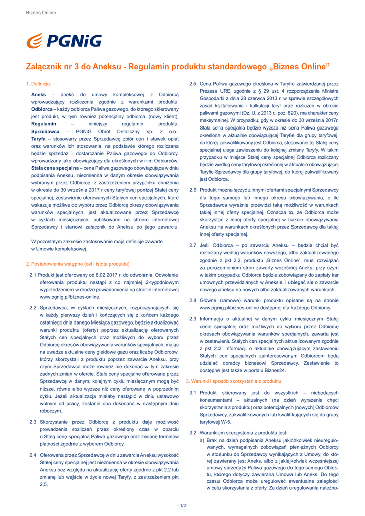 Biznes Online Załącznik nr 3 do Aneksu - Regulamin produktu standardowego „Biznes Online” 1.Definicje: 2.5 C ena Paliwa gazowego określona w Taryfie zatwierdzanej przez Prezesa URE, zgodnie z § 29 ust. 4 rozporządzenia Ministra Gospodarki z dnia 28 czerwca 2013 r. w sprawie szczegółowych zasad kształtowania i kalkulacji taryf oraz rozliczeń w obrocie paliwami gazowymi (Dz. U. z 2013 r., poz. 820), ma charakter ceny maksymalnej. W przypadku, gdy w okresie do 30 września 2017r. Stała cena specjalna będzie wyższa niż cena Paliwa gazowego określona w aktualnie obowiązującej Taryfie dla grupy taryfowej, do której zakwalifikowany jest Odbiorca, stosowanie tej Stałej ceny specjalnej ulega zawieszeniu do kolejnej zmiany Taryfy. W takim przypadku w miejsce Stałej ceny specjalnej Odbiorca rozliczany będzie według ceny taryfowej określonej w aktualnie obowiązującej Taryfie Sprzedawcy dla grupy taryfowej, do której zakwalifikowany jest Odbiorca. Aneks – aneks do umowy kompleksowej z Odbiorcą wprowadzający rozliczenia zgodnie z warunkami produktu; Odbiorca – każdy odbiorca Paliwa gazowego, do którego skierowany jest produkt, w tym również potencjalny odbiorca (nowy klient); Regulamin – niniejszy regulamin produktu; Sprzedawca – PGNiG Obrót Detaliczny sp. z o.o.; Taryfa – stosowany przez Sprzedawcę zbiór cen i stawek opłat oraz warunków ich stosowania, na podstawie którego rozliczana będzie sprzedaż i dostarczanie Paliwa gazowego do Odbiorcy, wprowadzany jako obowiązujący dla określonych w nim Odbiorców; Stała cena specjalna – cena Paliwa gazowego obowiązująca w dniu podpisania Aneksu, niezmienna w danym okresie obowiązywania wybranym przez Odbiorcę, z zastrzeżeniem przypadku obniżenia w okresie do 30 września 2017 r ceny taryfowej poniżej Stałej ceny specjalnej; zestawienie oferowanych Stałych cen specjalnych, które wskazuje możliwe do wyboru przez Odbiorcę okresy obowiązywania warunków specjalnych, jest aktualizowane przez Sprzedawcę w cyklach miesięcznych, publikowane na stronie internetowej Sprzedawcy i stanowi załącznik do Aneksu po jego zawarciu. 2.6 Produkt można łączyć z innymi ofertami specjalnymi Sprzedawcy dla tego samego lub innego okresu obowiązywania, o ile Sprzedawca wyraźnie przewidzi taką możliwość w warunkach takiej innej oferty specjalnej. Oznacza to, że Odbiorca może skorzystać z innej oferty specjalnej w trakcie obowiązywania Aneksu na warunkach określonych przez Sprzedawcę dla takiej innej oferty specjalnej. W pozostałym zakresie zastosowanie mają definicje zawarte w Umowie kompleksowej. 2.7 Jeśli Odbiorca – po zawarciu Aneksu – będzie chciał być rozliczany według warunków nowszego, albo zaktualizowanego zgodnie z pkt 2.2, produktu „Biznes Online”, musi rozwiązać za porozumieniem stron zawarty wcześniej Aneks, przy czym w takim przypadku Odbiorca będzie zobowiązany do zapłaty kar umownych przewidzianych w Aneksie, i ubiegać się o zawarcie nowego aneksu na nowych albo zaktualizowanych warunkach. 2.Postanowienia wstępne (cel i istota produktu) 2.1 Produkt jest oferowany od 8.02.2017 r. do odwołania. Odwołanie oferowania produktu nastąpi z co najmniej 2-tygodniowym wyprzedzeniem w drodze powiadomienia na stronie internetowej www.pgnig.pl/biznes-online. 2.2 Sprzedawca, w cyklach miesięcznych, rozpoczynających się w każdy pierwszy dzień i kończących się z końcem każdego ostatniego dnia danego Miesiąca gazowego, będzie aktualizować warunki produktu (oferty) poprzez aktualizację oferowanych Stałych cen specjalnych oraz możliwych do wyboru przez Odbiorcę okresów obowiązywania warunków specjalnych, mając na uwadze aktualne ceny giełdowe gazu oraz liczbę Odbiorców, którzy skorzystali z produktu poprzez zawarcie Aneksu, przy czym Sprzedawca może również nie dokonać w tym zakresie żadnych zmian w ofercie. Stałe ceny specjalne oferowane przez Sprzedawcę w danym, kolejnym cyklu miesięcznym mogą być niższe, równe albo wyższe niż ceny oferowane w poprzednim cyklu. Jeżeli aktualizacja miałaby nastąpić w dniu ustawowo wolnym od pracy, zostanie ona dokonana w następnym dniu roboczym. 2.8 Główne (ramowe) warunki produktu opisane są na stronie www.pgnig.pl/biznes-online dostępnej dla każdego Odbiorcy. 2.9 Informacja o aktualnej w danym cyklu miesięcznym Stałej cenie specjalnej oraz możliwych do wyboru przez Odbiorcę okresach obowiązywania warunków specjalnych, zawarta jest w zestawieniu Stałych cen specjalnych aktualizowanym zgodnie z pkt 2.2. Informacji o aktualnie obowiązującym zastawieniu Stałych cen specjalnych zainteresowanym Odbiorcom będą udzielać doradcy biznesowi Sprzedawcy. Zestawienie to dostępne jest także w portalu Biznes24. 3.Warunki i sposób skorzystania z produktu 2.3 S korzystanie przez Odbiorcę z produktu daje możliwość prowadzenia rozliczeń przez określony czas w oparciu o Stałą cenę specjalną Paliwa gazowego oraz zmianę terminów płatności zgodnie z wyborem Odbiorcy. 2.4 Oferowana przez Sprzedawcę w dniu zawarcia Aneksu wysokość Stałej ceny specjalnej jest niezmienna w okresie obowiązywania Aneksu bez względu na aktualizację oferty zgodnie z pkt 2.2 lub zmianę lub wejście w życie nowej Taryfy, z zastrzeżeniem pkt 2.5. - 1/2- 3.1 Produkt skierowany jest do wszystkich – niebędących konsumentami – aktualnych (na dzień wyrażenia chęci skorzystania z produktu) oraz potencjalnych (nowych) Odbiorców Sprzedawcy, zakwalifikowanych lub kwalifikujących się do grupy taryfowej W-5. 3.2 Warunkiem skorzystania z produktu jest: a) Brak na dzień podpisania Aneksu jakichkolwiek nieuregulowanych, wymagalnych zobowiązań pieniężnych Odbiorcy w stosunku do Sprzedawcy wynikających z Umowy, do której zawierany jest Aneks, albo z jakiejkolwiek wcześniejszej umowy sprzedaży Paliwa gazowego do tego samego Obiektu, którego dotyczy zawierana Umowa lub Aneks. Do tego czasu Odbior
