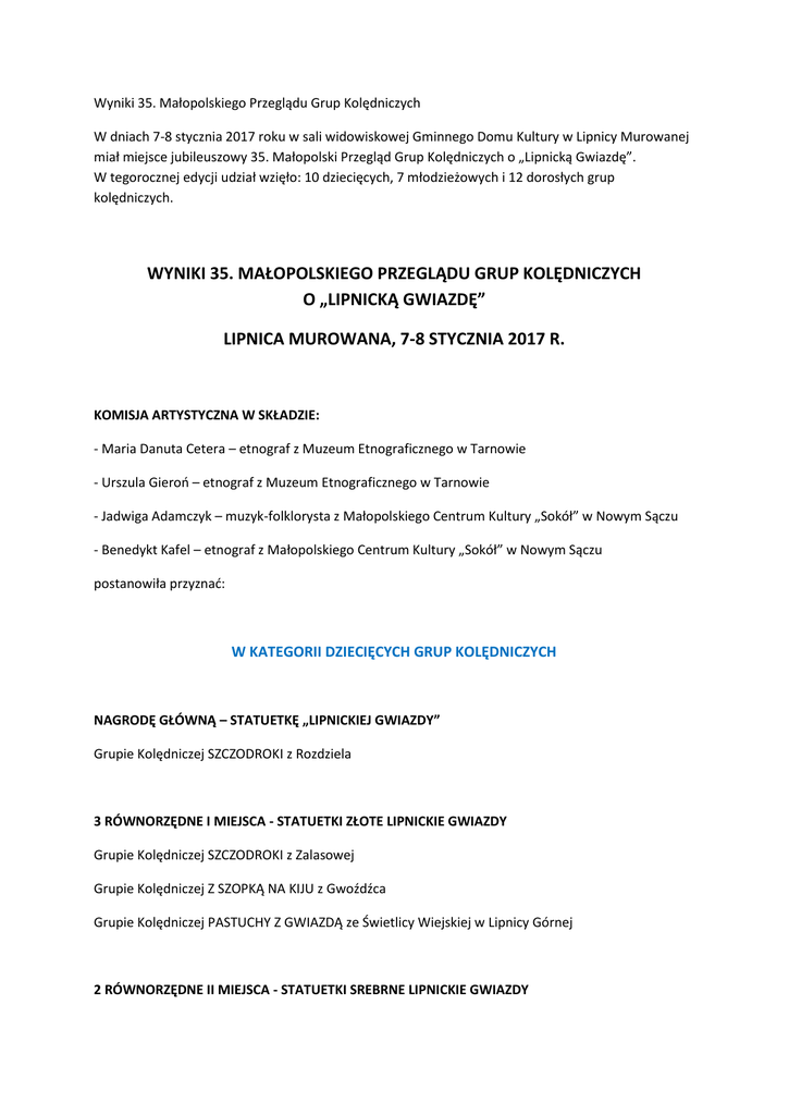 Wyniki 35. Małopolskiego Przeglądu Grup Kolędniczych W dniach 7-8 stycznia 2017 roku w sali widowiskowej Gminnego Domu Kultury w Lipnicy Murowanej miał miejsce jubileuszowy 35. Małopolski Przegląd Grup Kolędniczych o „Lipnicką Gwiazdę”. W tegorocznej edycji udział wzięło: 10 dziecięcych, 7 młodzieżowych i 12 dorosłych grup kolędniczych. WYNIKI 35. MAŁOPOLSKIEGO PRZEGLĄDU GRUP KOLĘDNICZYCH O „LIPNICKĄ GWIAZDĘ” LIPNICA MUROWANA, 7-8 STYCZNIA 2017 R. KOMISJA ARTYSTYCZNA W SKŁADZIE: - Maria Danuta Cetera – etnograf z Muzeum Etnograficznego w Tarnowie - Urszula Gieroń – etnograf z Muzeum Etnograficznego w Tarnowie - Jadwiga Adamczyk – muzyk-folklorysta z Małopolskiego Centrum Kultury „Sokół” w Nowym Sączu - Benedykt Kafel – etnograf z Małopolskiego Centrum Kultury „Sokół” w Nowym Sączu postanowiła przyznać: W KATEGORII DZIECIĘCYCH GRUP KOLĘDNICZYCH NAGRODĘ GŁÓWNĄ – STATUETKĘ „LIPNICKIEJ GWIAZDY” Grupie Kolędniczej SZCZODROKI z Rozdziela 3 RÓWNORZĘDNE I MIEJSCA - STATUETKI ZŁOTE LIPNICKIE GWIAZDY Grupie Kolędniczej SZCZODROKI z Zalasowej Grupie Kolędniczej Z SZOPKĄ NA KIJU z Gwoźdźca Grupie Kolędniczej PASTUCHY Z GWIAZDĄ ze Świetlicy Wiejskiej w Lipnicy Górnej 2 RÓWNORZĘDNE II MIEJSCA - STATUETKI SREBRNE LIPNICKIE GWIAZDY Grupie Kolędniczej HERODY z Rzepiennika Suchego Grupie Kolędniczej PASTUSZKI z Gwoźdźca 2 RÓWNORZĘDNE III MIEJSCA – STATUETKI BRĄZOWE LIPNICKIE GWIAZDY Grupie Kolędniczej SZCZODROKI z Turzy Grupie Kolędniczej SZCZODROKI ze Świetlicy Wiejskiej z Rajbrotu 2 RÓWNORZĘDNE WYRÓŻNIENIA Grupie Kolędniczej HERODY (MALI LIPNICZANIE) z Lipnicy Murowanej Grupie Kolędniczej Z GWIAZDĄ ( MALI BISKUPIANIE) z Biskupic Radłowskich W KATEGORII MŁODZIEŻOWYCH GRUP KOLĘDNICZYCH NAGRODĘ GŁÓWNĄ – STATUETKĘ „LIPNICKIEJ GWIAZDY” Grupie Kolędniczej DROBY z Rzepiennika Suchego I MIEJSCE – STATUETKĘ ZŁOŁA LIPNICKA GWIAZDA Grupie Kolędniczej DROBY z Rozdziela 2 RÓWNORZEDNE II MIEJSCA - STATUETKI SREBRNE LIPNICKIE GWIAZDY Grupie Kolędniczej HERODY z Gwoźdźca Grupie Kolędniczej Z KOZĄ z Nowego Wiśnicza 3 RÓWNORZĘDNE III MIEJSCA - STATUETKI BRĄZOWE LIPNICKIE GWIAZDY Grupie Kolędniczej HERODY z Lubczy Grupie Kolędniczej HERODY (LIPNICZANIE) z Lipnicy Murowanej Grupie Kolędniczej Z GWIAZDĄ z Muchówki Do udziału w Ogólnopolskich Spotkaniach Dziecięcych i Młodzieżowych Grup Kolędniczych 20. PASTUSZKOWE KOLĘDOWANIE w Podegrodziu Komisja zakwalifikowała: Grupę Kolędniczą SZCZODROKI z Rozdziela Grupę Kolędniczą PASTUCHY Z GWIAZDĄ z Lipnicy Górnej Grupę Kolędniczą Z SZOPKĄ NA KIJU z Gwoźdźca Grupę Kolędniczą SZCZODROKI z Zalasowej Grupę Kolędniczą DROBY z Rzepiennika Suchego Grupę Kolędniczą DROBY z Rozdziela W KATEGORII DOROSŁYCH GRUP KOLĘDNICZYCH NAGRODĘ GŁÓWNĄ – STATUETKĘ „LIPNICKIEJ GWIAZDY” Grupie Kolędniczej HERODY (ŚMIGNIANIE) ze Śmigna 4 RÓWNORZĘDNE I MIEJSCA - STATUETKI ZŁOTE LIPNICKIE GWIAZDY Grupie Kolędniczej Z TURONIEM (GNOJNICZANIE) z Gnojnika Grupie Kolędniczej Z SZOPKĄ LALKOWĄ z Gwoźdźca Grupie Kolędniczej HERODY (NIECZAJNIACY) z Nieczajnej Górnej Grupie Kolędniczej HERODY (ZALASOWIANIE) z Zalasowej 3 RÓWNORZEDNE II MIEJSCA - STATUETKI SREBRNE LIPNICKIE GWIAZDY Grupie Kolędniczej DROBY z Gwoźdźca Grupie Kolędniczej Z KOZĄ (LUBCOKI) z Lubczy Grupie Kolędniczej Z TURONIEM (PLEŚNIOKI) z Pleśnej 2 RÓWNORZEDNE III MIEJSCA - STATUETKI SREBRNE LIPNICKIE GWIAZDY Grupie Kolędniczej HERODY z Zabrnia Grupie Kolędniczej Z TURONIEM (KOLĘDNICY ZNAD USZWICY) z Uszwi 2 RÓWNORZĘDNE WYRÓŻNIENIA Grupie Kolędniczej Z TURONIEM (BISKUPIANIE) z Biskupic Radłowskich Grupie Kolędniczej Z GWIAZDĄ z Poręby Spytkowskiej NAGRODY INDYWIDUALNE za grę aktorską otrzymali: HEROD z Grupy Kolędniczej HERODY (ZALASOWIANIE) z Zalasowej HEROD z Grupy Kolędniczej HERODY (NIECZAJNIACY) z Nieczajnej Górnej ŻYD z Grupy Kolędniczej HERODY z Zabrnia Do udziału w Ogólnopolskim Przeglądzie Grup Kolędniczych 45. GÓRALSKI KARNAWAŁ w Bukowinie Tatrzańskiej Komisja zakwalifikowała: Grupę Kolędniczą HERODY (ŚMIGNIANIE) ze Śmigna Grupę Kolędniczą Z TURONIEM (GNOJNICZANIE) z Gnojnika Grupę Kolędniczą Z SZOPKĄ LALKOWĄ z Gwoźdźca Grupę Kolędniczą HERODY (NIECZAJNIACY) z Nieczajnej Górnej Grupę Kolędniczą HERODY (ZALASOWIANIE) z Zalasowej Grupę Kolędniczą DROBY z Gwoźdźca Grupę Kolędniczą Z KOZĄ (LUBCOKI) z Lubczy Grupę Kolędniczą Z TURONIEM (PLEŚNIOKI) z Pleśnej FUNDATORAMI NAGRÓD FINANSOWYCH byli: Małopolskie Centrum Kultury „Sokół” w Nowym Sączu Gminny Dom Kultury w Lipnicy Murowanej FUNDATORAMI NAGRÓD RZECZOWYCH byli: Małopolskie Centrum Kultury „Sokół” w Nowym Sączu Gminny Dom Kultury w Lipnicy Murowanej Starostwo Powiatowe w Bochni HONOROWY PATRONAT nad Przeglądem objęli: Jacek Krupa - Marszałek Województwa Małopolskiego Ludwik Węgrzyn – Starosta Powiatu Bocheńskiego Tomasz Gromala – Wójt Gminy Lipnica Murowana ORGANIZATORAMI PRZEGLĄDU byli: Małopolskie Centrum Kultury „Sokół” w Nowym Sączu – Biuro Organizacyjne w Tarnowie Gminny Dom Kultury w Lipnicy Murowanej Gmina Lipnica Murowana WSPÓŁORGANIZATOREM Przeglądu była: Parafia Rzymskokatolicka pw. św. Andrzeja Ap. w Lipnicy Murowanej PATRONAT MEDIALNY nad Przeglądem objęli: Tarnowska.tv Gazeta Krakowska www.mojabochnia.pl www.informatorbrzeski.pl