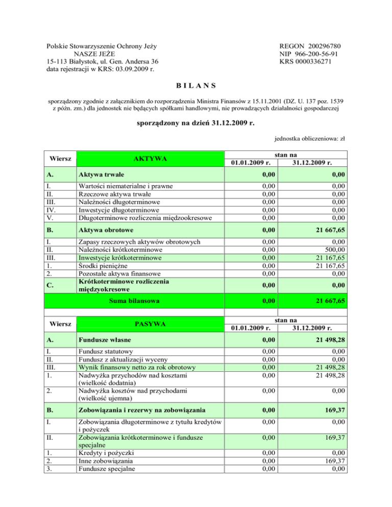 Polskie Stowarzyszenie Ochrony Jeży NASZE JEŻE 15-113 Białystok, ul. Gen. Andersa 36 data rejestracji w KRS: 03.09.2009 r. REGON 200296780 NIP 966-200-56-91 KRS 0000336271 BILANS sporządzony zgodnie z załącznikiem do rozporządzenia Ministra Finansów z 15.11.2001 (DZ. U. 137 poz. 1539 z późn. zm.) dla jednostek nie będących spółkami handlowymi, nie prowadzących działalności gospodarczej sporządzony na dzień 31.12.2009 r. jednostka obliczeniowa: zł Wiersz AKTYWA 01.01.2009 r. stan na 31.12.2009 r. A. Aktywa trwałe 0,00 0,00 I. II. III. IV. V. Wartości niematerialne i prawne Rzeczowe aktywa trwałe Należności długoterminowe Inwestycje długoterminowe Długoterminowe rozliczenia międzookresowe 0,00 0,00 0,00 0,00 0,00 0,00 0,00 0,00 0,00 0,00 B. Aktywa obrotowe 0,00 21 667,65 I. II. III. 1. 2. Zapasy rzeczowych aktywów obrotowych Należności krótkoterminowe Inwestycje krótkoterminowe Środki pieniężne Pozostałe aktywa finansowe Krótkoterminowe rozliczenia międzyokresowe 0,00 0,00 0,00 0,00 0,00 0,00 500,00 21 167,65 21 167,65 0,00 0,00 0,00 0,00 21 667,65 C. Suma bilansowa Wiersz PASYWA stan na 01.01.2009 r. 31.12.2009 r. A. Fundusze własne 0,00 21 498,28 I. II. III. 1. Fundusz statutowy Fundusz z aktualizacji wyceny Wynik finansowy netto za rok obrotowy Nadwyżka przychodów nad kosztami (wielkość dodatnia) Nadwyżka kosztów nad przychodami (wielkość ujemna) 0,00 0,00 0,00 0,00 0,00 0,00 21 498,28 21 498,28 0,00 0,00 B. Zobowiązania i rezerwy na zobowiązania 0,00 169,37 I. Zobowiązania długoterminowe z tytułu kredytów i pożyczek Zobowiązania krótkoterminowe i fundusze specjalne Kredyty i pożyczki Inne zobowiązania Fundusze specjalne 0,00 0,00 0,00 169,37 0,00 0,00 0,00 0,00 169,37 0,00 2. II. 1. 2. 3. III. IV. I. II. Rezerwy na zobowiązania Rozliczenia międzyokresowe Rozliczenia międzyokresowe przychodów Inne rozliczenia międzyokresowe Suma bilansowa 0,00 0,00 0,00 0,00 0,00 0,00 0,00 0,00 0,00 21 667,65 Data sporządzenia: 30.03.2010 r. Zarząd: Jerzy Zembrowski - Prezes Irena Zembrowska - Wiceprezes Krystyna Osiennik - Skarbnik ___________________________________________________________________________ Polskie Stowarzyszenie Ochrony Jeży NASZE JEŻE 15-113 Białystok, ul. Gen. Andersa 36 data rejestracji w KRS: 03.09.2009 r. REGON 200296780 NIP 966-200-56-91 KRS 0000336271 RACHUNEK WYNIKÓW sporządzony na dzień 31.12.2009 r. (rachunek wyników sporządzony zgodnie z załącznikiem do rozporządzenia Ministra Finansów z 15.11.2001(Dz.U. 137 poz.1539 z późniejszymi zmianami) Jednostka obliczeniowa: zł Dane za rok Wiersz Wyszczególnienie Stan na 01.01.2009 r. Stan na 31.12.2009 r. A. Przychody z działalności statutowej 26 235,88 I II 1. 2. 3. 4. B. Składki brutto określone statutem Inne przychody określone statutem Przychody z działalności statutowej - darowizny Przychody z działalności statutowej nieodpłatnej Przychody z działalności statutowej odpłatnej Pozostałe przychody określone statutem Koszty realizacji zadań statutowych 3 120,00 23 115,88 23 115,88 0,00 0,00 0,00 4 478,56 1. 3 258,56 D. Koszty realizacji zadań statutowych działalności nieodpłatnej Koszty realizacji zadań statutowych działalności odpłatnej Pozostałe koszty realizacji zadań statutowych Wynik finansowy na działalności statutowej (wielkość dodatnia lub ujemna( (A-B) Koszty administracyjne: 1. 2. Zużycie materiałów i energii Usługi obce 2. 3. C. 0,00 1 220,00 21 757,32 199,45 107,19 92,26 3. 4. G. Podatki i opłaty Wynagrodzenia oraz ubezpieczenia społeczne i inne świadczenia Amortyzacja Pozostałe Pozostałe przychody (nie wymienione w pozycji AiG Pozostałe koszty (nie wymienione w pozycji B, D i H) Przychody finansowe H. Koszty finansowe I. 21 498,28 J. Wynik finansowy brutto na całokształcie działalności (wielkość dodatnia lub ujemna) (C-D+E-F+G-H) Zyski i straty nadzwyczajne I. II. K. Zyski nadzwyczajne – wielkość dodatnia Straty nadzwyczajne – wielkość ujemna Wynik finansowy ogółem (I+J) 0,00 0,00 21 498,28 I. Różnica zwiększająca koszty roku następnego (wielkość ujemna) Różnica zwiększająca przychody roku następnego (wielkość dodatnia) 5. 6. E. F. II. 0,00 0,00 0,00 0,00 0,00 60,00 0,41 0,00 0,00 21 498,28 Data sporządzenia: 30.03.2010 r. Zarząd: Jerzy Zembrowski - Prezes Irena Zembrowska - Wiceprezes Krystyna Osiennik - Skarbnik ___________________________________________________________________________ Wprowadzenie do sprawozdania finansowego za 2009 r. Wstęp: Polskie Stowarzyszenie Ochrony Jeży „NASZE JEŻE” zostało zarejestrowane w Krajowym Rejestrze Sądowym w dniu 03.09.2009 r. pod nr 0000336271 i posiada osobowość prawną. Działa w oparciu o przepisy ustawy z dnia 7 kwietnia 1989 r. Prawo o stowarzyszeniach (Dz.U. z 2001, Nr 79, poz. 855 z późn. zm.) oraz statut. Stowarzyszenie jest organizacją pozarządową i prowadzi działalność społecznie użyteczną w sferze zadań publicznych obejmujących ochronę przyrody - stosownie do art. 3 ust.1 oraz art.4 ust.1 p.15 ustawy z dnia 24 kwietnia 2003 r. o działalności pożytku publicznego i o wolontariacie (Dz.U. z 2003 r. Nr 96, poz. 873 z późn. zm.) - także we współpracy z organami administracji publicznej. Stowarzyszenie nie jest jednostką sektora finansów publicznych, w rozumieniu przepisów o finansach publicznych i nie działa w celu osiągnięcia zysku. Stowarzyszenie nie prowadzi działalności gospodarczej w rozumieniu przepisów prawa działalności gospodarczej, a jeśli prowadzi, to w rozmiarach służących realizacji celów statutowych. Cele działalności stowarzyszenia: 1. Ochrona przyrody, a szczególnie czynna ochrona jeżowatych wszystkich gatunków (zgodnie z Rozporządzeniem Ministra Środowiska z dn. 28.09.2004 r. w sprawie gatunków dziko występujących zwierząt objętych ochroną). 2. Zapewnienie ciągłości istnienia jeżowatych wraz z ich siedliskami przez ich utrzymywanie i przywr