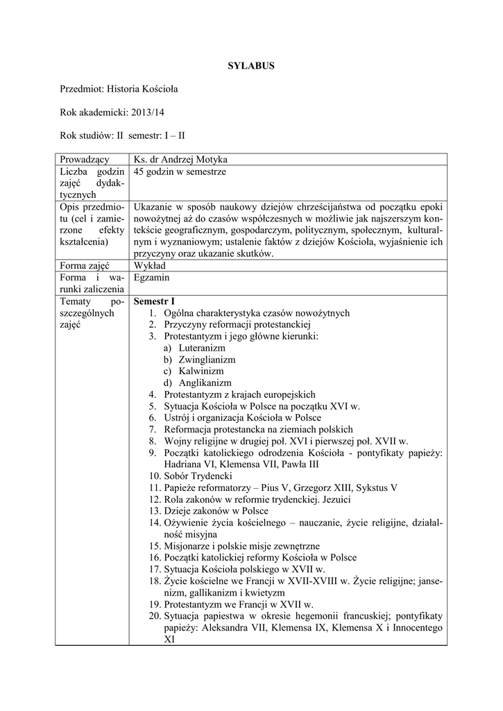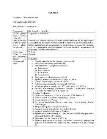 SYLABUS Przedmiot: Historia Kościoła Rok akademicki: 2013/14 Rok studiów: II semestr: I – II Prowadzący Liczba godzin zajęć dydaktycznych Opis przedmiotu (cel i zamierzone efekty kształcenia) Ks. dr Andrzej Motyka 45 godzin w semestrze Ukazanie w sposób naukowy dziejów chrześcijaństwa od początku epoki nowożytnej aż do czasów współczesnych w możliwie jak najszerszym kontekście geograficznym, gospodarczym, politycznym, społecznym, kulturalnym i wyznaniowym; ustalenie faktów z dziejów Kościoła, wyjaśnienie ich przyczyny oraz ukazanie skutków. Forma zajęć Wykład Forma i wa- Egzamin runki zaliczenia Tematy po- Semestr I szczególnych 1. Ogólna charakterystyka czasów nowożytnych zajęć 2. Przyczyny reformacji protestanckiej 3. Protestantyzm i jego główne kierunki: a) Luteranizm b) Zwinglianizm c) Kalwinizm d) Anglikanizm 4. Protestantyzm z krajach europejskich 5. Sytuacja Kościoła w Polsce na początku XVI w. 6. Ustrój i organizacja Kościoła w Polsce 7. Reformacja protestancka na ziemiach polskich 8. Wojny religijne w drugiej poł. XVI i pierwszej poł. XVII w. 9. Początki katolickiego odrodzenia Kościoła - pontyfikaty papieży: Hadriana VI, Klemensa VII, Pawła III 10. Sobór Trydencki 11. Papieże reformatorzy – Pius V, Grzegorz XIII, Sykstus V 12. Rola zakonów w reformie trydenckiej. Jezuici 13. Dzieje zakonów w Polsce 14. Ożywienie życia kościelnego – nauczanie, życie religijne, działalność misyjna 15. Misjonarze i polskie misje zewnętrzne 16. Początki katolickiej reformy Kościoła w Polsce 17. Sytuacja Kościoła polskiego w XVII w. 18. Życie kościelne we Francji w XVII-XVIII w. Życie religijne; jansenizm, gallikanizm i kwietyzm 19. Protestantyzm we Francji w XVII w. 20. Sytuacja papiestwa w okresie hegemonii francuskiej; pontyfikaty papieży: Aleksandra VII, Klemensa IX, Klemensa X i Innocentego XI 21. Papieże od Aleksandra VIII do Klemensa XI 22. Odbudowa i ustrój Kościoła w Rzeszy 23. Kościół w krajach półwyspu iberyjskiego (do 1815 r. ). Etatyzm 24. Sytuacja katolików w Wielkiej Brytanii i Irlandii w XVII i XVIII w. 25. Kościół prawosławny w Rosji 26. Protestanci i katolicy w Rosji 27. Wschodnie Kościoły autokefaliczne i unickie 28. Kościoły wschodnie w Rzeczypospolitej 29. Kościoły unickie w Polsce 30. Oświecenie. Życie religijne w okresie etatyzmu i Oświecenia, duchowość francuska i angielska 31. Papiestwo w okresie wzrastającego etatyzmu. Papieże od Innocentego XIII do Klemensa XIV 32. Kościół w Polsce w XVIII w. 33. Nauka kościelna w XVIII w. 34. Kościół katolicki w Niemczech. Episkopalizm 35. Katolicyzm austriacki. Terezjanizm i józefinizm 36. Liturgia i pobożność ludowa. Nowe zakony Semestr II 1. Francja w okresie rewolucji (1789-1800) 2. Pius VII i Napoleon Bonaparte. Konkordat francuski (1801). Sytuacja Kościoła francuskiego po upadku Napoleona 3. Dzieje papiestwa za pontyfikatów: Leona XII, Piusa VIII, Grzegorza XVI, Piusa IX 4. Kościół w krajach niemieckich (do 1918). Kulturkampf 5. Kościół w krajach półwyspu iberyjskiego (do 1918) 6. Katolicyzm na wyspach brytyjskich (do 1918) 7. Sytuacja katolików w Niderlandach i w krajach skandynawskich (do I wojny światowej) 8. Kościół katolicki w krajach kontynentu amerykańskiego (do 1918) 9. Sytuacja Kościoła katolickiego na ziemiach polskich w okresie rozbiorów: a) w zaborze rosyjskim i w Rosji; b) w Księstwie Warszawskim i Królestwie Polskim; c) w zaborze austriackim; d) w zaborze pruskim 10. Życie religijne w Polsce pod zaborami – służba Boża, szafarstwo sakramentów i nauczanie, życie zakonne. 11. Misje katolickie 12. Wewnętrzne życie Kościoła. Zakony 13. Rozwój nauki kościelnej. Błędy teologiczne. Liberalizm. Modernizm 14. Stolica Apostolska a unici. Kościoły unickie na Bliskim Wschodzie 15. Kościoły Wschodnie 16. Wspólnoty protestanckie 17. Upadek Państwa Kościelnego – tzw. sprawa włoska 18. Sobór Watykański I. Starokatolicyzm 19. Papieże: Leon XIII i Pius X 20. Pierwsza wojna światowa. Pontyfikat Benedykta XV 21. Stolica Apostolska za pontyfikatu Piusa XI 22. Dzieje Kościoła katolickiego w II Rzeczypospolitej 23. Dzieje Kościoła katolickiego w Polsce podczas okupacji 24. Sytuacja Kościoła katolickiego w faszystowskich Włoszech 25. Kościół katolicki w krajach Europy Zachodniej: Francji, Hiszpanii, Portugalii, Belgii, Holandii, Luksemburgu, Niemczech, Austrii, Szwajcarii, Wielkiej Brytanii i Irlandii (od I wojny światowej do zakończenia II wojny światowej). 26. Kościół w krajach Europy środkowowschodniej (do 1945) 27. Druga wojna światowa. Pontyfikat papieża Piusa XII 28. Pontyfikaty papieży Jana XIII, Pawła VI i Jana Pawła I 29. Kościół za „żelazną kurtyną” 30. Kościół w Polsce pod rządami komunistów 31. Kościół w krajach Europy Zachodniej (od 1945 r.) 32. Kościół w krajach obu Ameryk (od 1918) 33. Sytuacja Kościoła w krajach Afryki, Azji, Australii i Oceanii (od 1918 r.) 34. Sobór Watykański II 35. Kościół za pontyfikatu papieża Jana Pawła II 36. Dzieje Kościoła katolickiego w Polsce po 1989 r. 37. Dzieje diecezji przemyskiej (1772-1992), tarnowskiej (1786-1992) i rzeszowskiej 38. Papież Benedykt XVI Literatura pod- - Historia Kościoła, red. R. Aubert, M. D. Knowles, L. J. Rogier, t. 3-5, stawowa Warszawa 1985-1988. - Kumor B., Historia Kościoła, t. 6-8, Lublin 1985-1995. - Banaszak M., Historia Kościoła katolickiego, t. 3-4, Warszawa 19891992. - Kumor B., Obertyński Z., Historia Kościoła w Polsce, t. 1-2, PoznańWarszawa 1974–1979. Literatura uzu- - Bilhmeyer K., Tüchle H., Kirchengeschichte, t. 3, wyd. 17, Paderborn pełniająca 1961. - Chrześcijaństwo w Polsce, red. J. Kłoczowski, Lublin 1980. - Handbuch der Kirchengeschichte, hrsg. H. Jedin, t. 4-6, Freiburg 19701973. - Kłoczowski J., Dzieje chrześcijaństwa polskiego, t. 1, Paryż 1987. - Kłoczowski J., Müllerowa L., Skarbek J., Zarys dziejów Kośc