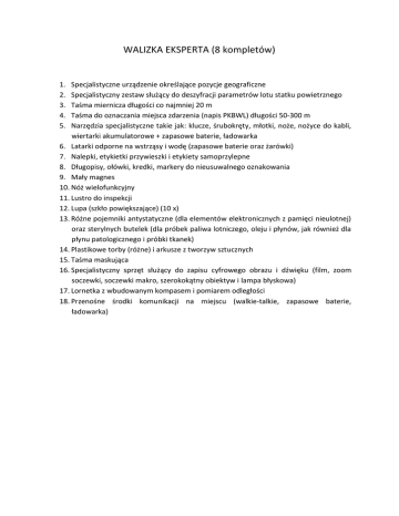 WALIZKA EKSPERTA (8 kompletów) 1. 2. 3. 4. 5. Specjalistyczne urządzenie określające pozycje geograficzne Specjalistyczny zestaw służący do deszyfracji parametrów lotu statku powietrznego Taśma miernicza długości co najmniej 20 m Taśma do oznaczania miejsca zdarzenia (napis PKBWL) długości 50-300 m Narzędzia specjalistyczne takie jak: klucze, śrubokręty, młotki, noże, nożyce do kabli, wiertarki akumulatorowe + zapasowe baterie, ładowarka 6. Latarki odporne na wstrząsy i wodę (zapasowe baterie oraz żarówki) 7. Nalepki, etykietki przywieszki i etykiety samoprzylepne 8. Długopisy, ołówki, kredki, markery do nieusuwalnego oznakowania 9. Mały magnes 10. Nóż wielofunkcyjny 11. Lustro do inspekcji 12. Lupa (szkło powiększające) (10 x) 13. Różne pojemniki antystatyczne (dla elementów elektronicznych z pamięci nieulotnej) oraz sterylnych butelek (dla próbek paliwa lotniczego, oleju i płynów, jak również dla płynu patologicznego i próbki tkanek) 14. Plastikowe torby (różne) i arkusze z tworzyw sztucznych 15. Taśma maskująca 16. Specjalistyczny sprzęt służący do zapisu cyfrowego obrazu i dźwięku (film, zoom soczewki, soczewki makro, szerokokątny obiektyw i lampa błyskowa) 17. Lornetka z wbudowanym kompasem i pomiarem odległości 18. Przenośne środki komunikacji na miejscu (walkie-talkie, zapasowe baterie, ładowarka)
