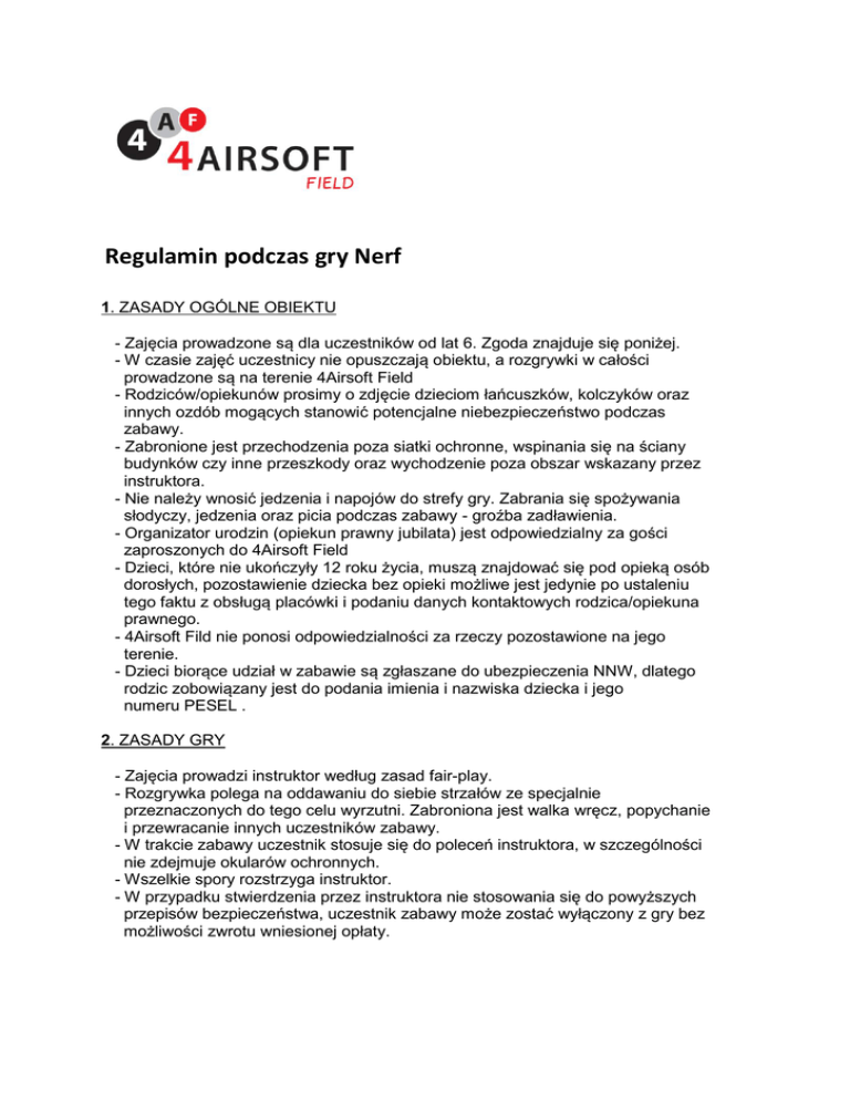 Regulamin podczas gry Nerf 1. ZASADY OGÓLNE OBIEKTU - Zajęcia prowadzone są dla uczestników od lat 6. Zgoda znajduje się poniżej. - W czasie zajęć uczestnicy nie opuszczają obiektu, a rozgrywki w całości prowadzone są na terenie 4Airsoft Field - Rodziców/opiekunów prosimy o zdjęcie dzieciom łańcuszków, kolczyków oraz innych ozdób mogących stanowić potencjalne niebezpieczeństwo podczas zabawy. - Zabronione jest przechodzenia poza siatki ochronne, wspinania się na ściany budynków czy inne przeszkody oraz wychodzenie poza obszar wskazany przez instruktora. - Nie należy wnosić jedzenia i napojów do strefy gry. Zabrania się spożywania słodyczy, jedzenia oraz picia podczas zabawy - groźba zadławienia. - Organizator urodzin (opiekun prawny jubilata) jest odpowiedzialny za gości zaproszonych do 4Airsoft Field - Dzieci, które nie ukończyły 12 roku życia, muszą znajdować się pod opieką osób dorosłych, pozostawienie dziecka bez opieki możliwe jest jedynie po ustaleniu tego faktu z obsługą placówki i podaniu danych kontaktowych rodzica/opiekuna prawnego. - 4Airsoft Fild nie ponosi odpowiedzialności za rzeczy pozostawione na jego terenie. - Dzieci biorące udział w zabawie są zgłaszane do ubezpieczenia NNW, dlatego rodzic zobowiązany jest do podania imienia i nazwiska dziecka i jego numeru PESEL . 2. ZASADY GRY - Zajęcia prowadzi instruktor według zasad fair-play. - Rozgrywka polega na oddawaniu do siebie strzałów ze specjalnie przeznaczonych do tego celu wyrzutni. Zabroniona jest walka wręcz, popychanie i przewracanie innych uczestników zabawy. - W trakcie zabawy uczestnik stosuje się do poleceń instruktora, w szczególności nie zdejmuje okularów ochronnych. - Wszelkie spory rozstrzyga instruktor. - W przypadku stwierdzenia przez instruktora nie stosowania się do powyższych przepisów bezpieczeństwa, uczestnik zabawy może zostać wyłączony z gry bez możliwości zwrotu wniesionej opłaty. FORMULARZ ZGODY DLA NIELETNICH Nerf Ja, niżej podpisany, prawny opiekun .......................................................................................... ur. ................................... wyrażam zgodę na jego/jej udział w grze organizowanej przez 4Arsoft Field. Oświadczam, że zapoznałem/zapoznałam się z regulaminem dostępnym na stronie. Rozumiem i akceptuję, iż w przypadku stwierdzenia przez sędziego nie stosowania się do powyższych przepisów bezpieczeństwa, mój podopieczny może zostać wyłączony z gry, bez możliwości zwrotu wniesionej opłaty, jednocześnie oświadczam że nie ma żadnych przeciwwskazań zdrowotnych do brania udziału mojego podopiecznego w grze. Przyjmuję do wiadomości, że gra bazuje na wyrzutniach miękkich gąbczastych pocisków celem trafiania się wzajemnie. Oświadczam, że zdaję sobie sprawę z ryzyka wynikającego z udziału mojego podopiecznego w grze, i w razie jakichkolwiek nieszczęśliwych zdarzeń nie będę wnosił roszczeń wobec organizatora bądź jakiegokolwiek innego uczestnika gry. Seria i numer dw. Osobistego ew. Pesel ..................................................................... Podpis ...............................................