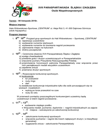 XVII PARASPARTAKIADA ŚLĄSKA I ZAGŁĘBIA Osób Niepełnosprawnych Termin : 08 listopada 2016r. Miejsce imprezy : Hala Widowiskowo-Sportowa „CENTRUM” ul. Aleja Róż 3, 41-300 Dąbrowa Górnicza (obok Aquaparku) Program imprezy : 00 – 1. 8 1000 Przyjazd grup sportowych do Hali Widowiskowo – Sportowej „CENTRUM” a) b) c) d) e) rejestracja uczestników wydawanie numerów startowych wydawanie numerów do losowania nagród pocieszenia zajmowanie miejsc na trybunach drobny poczęstunek 00 2. 10 – Ceremonia otwarcia XVII Paraspartakiady Śląska i Zagłębia a) występ cheerleaderek b) powitanie gości i drużyn uczestniczących w Paraspartakiadzie c) wręczenie pucharu Prezydenta Rzeczypospolitej Polskiej d) przemówienia honorowych patronów Paraspartakiady oraz wręczenie przez nich pamiątkowych medali wszystkim uczestnikom e) zapalenie znicza f) przemarsz drużyn sportowych 30 3. 10 – Rozpoczęcie konkurencji sportowych. a) konkurencje tor przeszkód rzuty ringo dart b) dodatkowe konkurencje indywidualne tylko dla osób poruszających się na wózkach inwalidzkich : wyścig po torze przeszkód na czas rzuty do celu W przerwach pomiędzy poszczególnymi konkurencjami uczestnicy będą uczestniczyć w loterii nagród pocieszenia . 30 4. 11 – 1330 : wydawanie ciepłego posiłku Wręczanie medali, pucharów, dyplomów i nagród indywidualnych za zajęcie I – III miejsca – sukcesywnie po zakończonej konkurencji 30 5. 13 00 - 14 zakończenie konkurencji sportowych wręczenie pucharów i nagród dla trzech najlepszych drużyn ( w klasyfikacji generalnej) wygaszenie znicza - zakończenie Paraspartakiady XVII PARASPARTAKIADA ŚLĄSKA I ZAGŁĘBIA Osób Niepełnosprawnych Termin: 00 08 listopada 2016 w godzinach 8 1400 Miejsce imprezy : Hala widowiskowo-sportowa „CENTRUM”, ul. Aleja Róż 3, 41-300 Dąbrowa Górnicza Organizator: Stowarzyszenie „NEURON” Pomocy Dzieciom i Osobom Niepełnosprawnym w Dąbrowie Górniczej Współorganizatorzy Duszpasterstwo Osób Niepełnosprawnych Diecezji Sosnowieckiej Centrum Sportu i Rekreacji w Dąbrowie Górniczej V Liceum Ogólnokształcące z Oddziałami Dwujęzycznymi im. Kanclerza Jana Zamoyskiego w Dąbrowie Górniczej Patronat: J.E. Ks. Bp. Grzegorz Kaszak - Biskup Sosnowiecki Urszula Bauer - Śląski Kurator Oświaty Zbigniew Podraza - Prezydent Miasta Dąbrowa Górnicza Patronat medialny: Dziennik Zachodni Tygodnik „Niedziela Sosnowiecka” Telewizja TOM Nasze Sprawy Adresaci: Dzieci, młodzież niepełnosprawna pochodząca ze szkół, ośrodków szkolnowychowawczych, WTZ, ZAZ, placówek zajmujących się osobami niepełnosprawnymi, organizacji pozarządowych, fundacji, itp. wraz z opiekunami z terenu województw : śląskiego, małopolskiego, opolskiego, świętokrzyskiego. Wolontariusze: V Liceum Ogólnokształcące z Oddziałami Dwujęzycznymi im. Kanclerza Jana Zamoyskiego w Dąbrowie Górniczej Gimnazjum nr 4 w Dąbrowie Górniczej Stowarzyszenie „NEURON” Pomocy Dzieciom I Osobom Niepełnosprawnym Uczestnictwo w XVII Paraspartakiadzie jest ogólnodostępne i bezpłatne. Przedmiotowa impreza jest współfinansowana ze środków PFRON w ramach projektu dotyczącego celu programowego 3: wzrost aktywności osób niepełnosprawnych w różnych dziedzinach życia – umowa nr ZZO/000082/12/D
