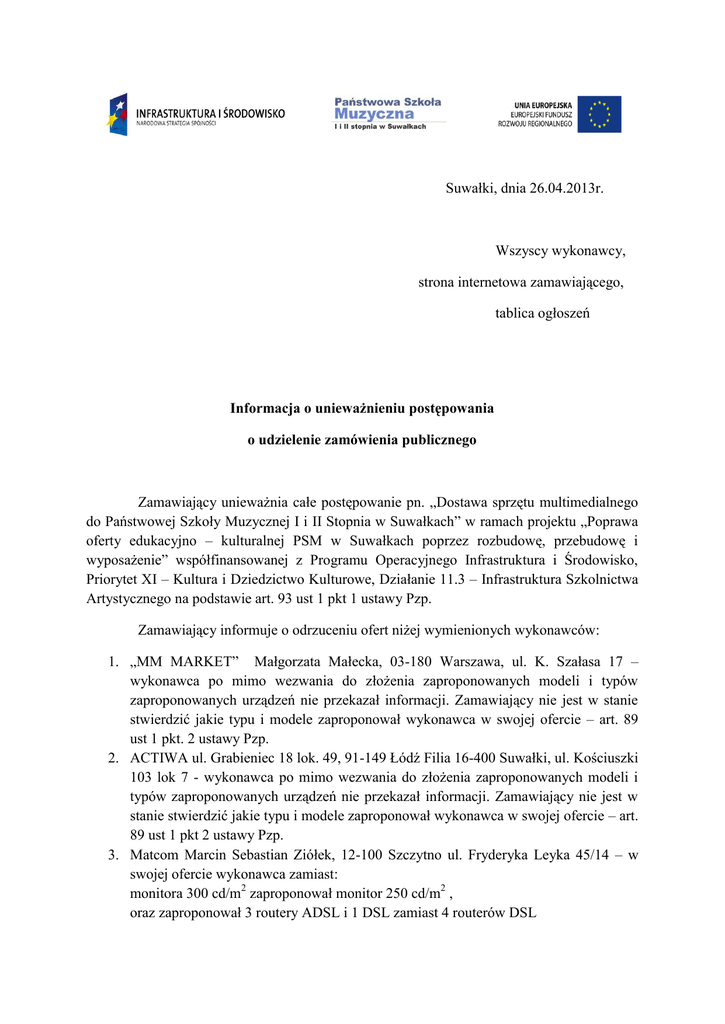 Suwałki, dnia 26.04.2013r. Wszyscy wykonawcy, strona internetowa zamawiającego, tablica ogłoszeń Informacja o unieważnieniu postępowania o udzielenie zamówienia publicznego Zamawiający unieważnia całe postępowanie pn. „Dostawa sprzętu multimedialnego do Państwowej Szkoły Muzycznej I i II Stopnia w Suwałkach” w ramach projektu „Poprawa oferty edukacyjno – kulturalnej PSM w Suwałkach poprzez rozbudowę, przebudowę i wyposażenie” współfinansowanej z Programu Operacyjnego Infrastruktura i Środowisko, Priorytet XI – Kultura i Dziedzictwo Kulturowe, Działanie 11.3 – Infrastruktura Szkolnictwa Artystycznego na podstawie art. 93 ust 1 pkt 1 ustawy Pzp. Zamawiający informuje o odrzuceniu ofert niżej wymienionych wykonawców: 1. „MM MARKET” Małgorzata Małecka, 03-180 Warszawa, ul. K. Szałasa 17 – wykonawca po mimo wezwania do złożenia zaproponowanych modeli i typów zaproponowanych urządzeń nie przekazał informacji. Zamawiający nie jest w stanie stwierdzić jakie typu i modele zaproponował wykonawca w swojej ofercie – art. 89 ust 1 pkt. 2 ustawy Pzp. 2. ACTIWA ul. Grabieniec 18 lok. 49, 91-149 Łódź Filia 16-400 Suwałki, ul. Kościuszki 103 lok 7 - wykonawca po mimo wezwania do złożenia zaproponowanych modeli i typów zaproponowanych urządzeń nie przekazał informacji. Zamawiający nie jest w stanie stwierdzić jakie typu i modele zaproponował wykonawca w swojej ofercie – art. 89 ust 1 pkt 2 ustawy Pzp. 3. Matcom Marcin Sebastian Ziółek, 12-100 Szczytno ul. Fryderyka Leyka 45/14 – w swojej ofercie wykonawca zamiast: monitora 300 cd/m2 zaproponował monitor 250 cd/m2 , oraz zaproponował 3 routery ADSL i 1 DSL zamiast 4 routerów DSL art. 89 ust 1 pkt. 2 ustawy Pzp. 4. PHPU ZUBER, Andrzej Zuber, 50-424 Wrocław, ul. Krakowska 29 C – w swojej ofercie wykonawca zamiast: - procesora z cache L3-6MB do komputerów do pracowni informatycznej zaproponował procesor z cache L3-3MB - brak informacji o UPS’ie i szynach do serwera - brak informacji o statywach do ekranów projekcyjnych art. 89 ust 1 pkt. 2 ustawy Pzp. 5. ProAUDIO – AVT Sp. z. o.o. 54-530 Wrocław, ul. Graniczna 89A – w swojej ofercie wykonawca zaproponował: - rzutniki bez gniazd: s-video, chinch - video, brak informacji o etui; - tablice interaktywne w technologii elektromagnetycznej zamiast w podczerwieni; - odtwarzacz DVD, który nie odtwarza Divx; - brak informacji o statywach do ekranów projekcyjnych; - urządzenie wielofunkcyjne laserowe zamiast urządzenia wielofunkcyjnego atramentowego; - brak specyfikacji serwera, dysku sieciowego oraz routerów art. 89 ust 1 pkt. 2 ustawy Pzp. 6. Moje Bambino Sp. z o.o. S.K.A ul. Graniczna 46 93-428 Łódź – w swojej ofercie wykonawca zaproponował: - laptopy z baterią 2950 mAh zamiast laptopów z baterią 5200 mAh, - odtwarzacze DVD, które nie odtwarzają WMV, VCD, SVCD, AAC, - kamerę cyfrową bez lampy video, - pamięć USB z prędkością zapisu 20 MB/s zamiast z prędkością 70 MB/s, - komputer PC do zarządzania siecią bez kontrolera RAID, - drukarkę bez skanera, - monitory o jasności 250 cd/m2 zamiast monitorów o jasności 300 cd/m2, - serwer obsługujący max 3GB pamięci RAM zamiast serwera obsługującego 32 GB pamięci RAM, - brak informacji o dysku sieciowym art. 89 ust 1 pkt. 2 ustawy Pzp. Proszę o potwierdzenie otrzymania niniejszej informacji.