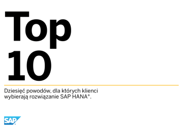 Top 10 Dziesięć powodów, dla których klienci wybierają rozwiązanie SAP HANA®. 1 Szybkość Zarządzaj dużymi wolumenami danych z niewiarygodną szybkością. 2 Elastyczność Korzystaj z informacji w czasie rzeczywistym i osiągnij dzięki temu przewagę konkurencyjną. 3 Dowolne źródło danych Uzyskuj informacje z danych strukturalnych i niestrukturalnych. 4 Wgląd Wykorzystaj nowe możliwości pozyskiwania informacji na podstawie złożonej analizy predykcyjnej. 5 Aplikacje Korzystaj z aplikacji nowej generacji. 6 Chmura Skorzystaj z jednej z najbardziej zaawansowanych platform przetwarzania danych w chmurze. 7 Innowacyjność Zastosuj optymalną platformę dla wprowadzenia innowacji w biznesie. 8 Prostota Zarządzaj mniejszą liczbą warstw i prostszą infrastrukturą, obniżając dzięki temu koszty. 9 Wartość Wprowadzaj nowe rozwiązania bez zakłóceń działalności i zwiększaj wartość wcześniejszych inwestycji. 10 Wybór Pracuj z wybranymi partnerami w danym obszarze. Top 10 1 Szybkość 2 Elastyczność 3 Dowolne źródło danych 4 Wgląd 5 Aplikacje 6 Chmura 7 Innowacyjność 8 Prostota 9 Wartość 10 Wybór Zarządzaj dużymi wolumenami danych z niewiarygodną szybkością. SAP HANA® Technologia SAP in-memory computing Platforma SAP HANA to mechanizm analizy danych w czasie rzeczywistym. Stanowi ona podstawę do wdrażania nowych aplikacji, umożliwiając klientom analizowanie w czasie rzeczywistym dużych wolumenów danych pochodzących praktycznie z dowolnego źródła. Przykład przedstawia wydajność kluczowego procesu raportowania u klienta. 3600 razy szybciej godziny Przed zastosowaniem rozwiązania SAP HANA sekundy Przy użyciu rozwiązania SAP HANA Przekonaj się o korzyściach biznesowych analizy danych w czasie rzeczywistym Przykład analizy wykonywanej przez jedno z przedsiębiorstw w branży dóbr konsumpcyjnych pokazuje, w jaki sposób rozwiązanie SAP HANA analizuje dane z punktów sprzedaży w czasie rzeczywistym, umożli wiając natychmiastową weryfikację informacji na temat segmentacji, sprzedaży, zarządzania zapasami oraz prognozowania. 70 sprzedawców detalicznych 460 miliardów rekordów 50 terabajtów danych 0,04 sekundy czas oczekiwania na wynik analizy na każdym urządzeniu, w dowolnym czasie i miejscu Zarówno teraz, jak i w przyszłości, szybkość będzie stanowić klucz umożliwiający dostosowanie do podlegającego ciągłym zmianom środowiska biznesowego. Szybkość działania rozwiązania SAP HANA zadziwia i umożliwia przekształcanie całych modeli biznesowych. Akihiko Nakamura, Starszy Wiceprezes, Nomura Research Institute Źródło: Wyniki klientów mogą być inne i zależą od konfiguracji systemu. Po lewej: Na podstawie wyników testów przeprowadzonych przez SAP z użyciem danych klienta z branży budowlanej pochodzących z transakcji w oprogramowaniu SAP Business Suite. Zapytania były przetwarzane średnio 3600 razy szybciej niż w oprogramowaniu SAP Business Suite z tradycyjnymi, dyskowymi bazami danych. Wyniki te osiągnięto przy zastosowaniu oprogramowania SAP HANA 1.0 na jednym czteroprocesorowym serwerze z 8 rdzeniami (częstotliwość taktowania 2,27 GHz), z 0,5 TB pamięci głównej, dyskiem SSD o pojemności 2 TB oraz kartą sieci Ethernet o szybkości transmisji 1 Gb/s, z systemem operacyjnym typu open source. Po prawej: Na podstawie wyników testów przeprowadzonych przez SAP z użyciem 460 miliardów wierszy danych z punktów sprzedaży, dostarczonych przez klienta będącego czołowym dostawcą artykułów konsumpcyjnych. Wyniki te osiągnięto, przetwarzając typowe zapytania biznesowe na 10-węzłowej platformie z oprogramowaniem SAP HANA 1.0. Każdy węzeł stanowił jeden czteroprocesorowy serwer z 8 rdzeniami (częstotliwość taktowania 2,27 GHz), z 0,5 TB pamięci głównej, dyskiem SSD o pojemności 2 TB oraz kartą sieci Ethernet o szybkości transmisji 10 Gb/s, z systemem operacyjnym typu open source. Top 10 1 Szybkość 2 Elastyczność 3 Dowolne źródło danych 4 Wgląd 5 Aplikacje 6 Chmura 7 Innowacyjność 8 Prostota 9 Wartość SAP HANA zapewnia elastyczność w procesach transformacji. Pobieraj dane na bieżąco z wielu źródeł. Analizuj możliwości zrówno ważenia celów finansowych, opera cyjnych i strategicznych w oparciu o aktualną sytuację rynkową. Szybko analizuj wpływ krótkoterminowych dostaw, wahań popytu i zleceń z ostatniej chwili. Dostosowuj działania w celu osiąg nięcia optymalnych wyników. Błyskawicznie analizuj upodobania konsumentów i skuteczność promo cji. Dobieraj właściwe media społecz nościowe dostosowane do danej grupy konsumentów w czasie rzeczywistym. Usprawnij analizę dużych wolumenów danych z punktów i kanałów sprzedaży w celu uzyskania wglądu do przesunięć zapasów i optymalizuj biznes uwzględ niając dzienny popyt. Rozwiązanie SAP HANA umożliwia analizę operacji biznesowych na podstawie dużych wolumenów szczegółowych danych operacyjnych w czasie rzeczywistym, bez zakłócania normalnej pracy przedsiębiorstwa. „Opracowanie techniczne IDC sponsorowane przez firmę SAP AG, Faster, Higher, Stronger: In-Memory Computing Discruption and What SAP Means for Your Organization”, listopad 2011 r. Korzystaj z możliwości działań w czasie rzeczywistym w całym łańcuchu tworzenia wartości. 10 Wybór Top 10 1 Szybkość 2 Elastyczność 3 Dowolne źródło danych 4 Wgląd 5 Aplikacje 6 7 Chmura Innowacyjność 8 Prostota 9 Wartość Uzyskaj wgląd w dane strukturalne i niestrukturalne. Sięgnij głębiej i odkryj nowe perspektywy Rozwiązanie SAP HANA integruje dane strukturalne i niestrukturalne ze źródeł wewnętrznych i zewnętrznych oraz anali zuje szczegółowe dane bez konieczności agregacji. Rozwiązanie SAP HANA można zintegrować z szerokim zakre sem środowisk IT, powierzając mu prze twarzanie danych z baz danych Oracle, Microsoft SQL Server i IBM DB2 oraz z technologii BigData, takich jak na przykład Had