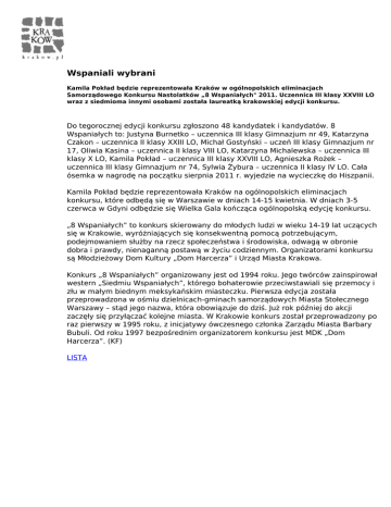 Wspaniali wybrani Kamila Pokład będzie reprezentowała Kraków w ogólnopolskich eliminacjach Samorządowego Konkursu Nastolatków „8 Wspaniałych" 2011. Uczennica III klasy XXVIII LO wraz z siedmioma innymi osobami została laureatką krakowskiej edycji konkursu. Do tegorocznej edycji konkursu zgłoszono 48 kandydatek i kandydatów. 8 Wspaniałych to: Justyna Burnetko – uczennica III klasy Gimnazjum nr 49, Katarzyna Czakon – uczennica II klasy XXIII LO, Michał Gostyński – uczeń III klasy Gimnazjum nr 17, Oliwia Kasina – uczennica II klasy VIII LO, Katarzyna Michalewska – uczennica III klasy X LO, Kamila Pokład – uczennica III klasy XXVIII LO, Agnieszka Rożek – uczennica III klasy Gimnazjum nr 74, Sylwia Żybura – uczennica II klasy IV LO. Cała ósemka w nagrodę na początku sierpnia 2011 r. wyjedzie na wycieczkę do Hiszpanii. Kamila Pokład będzie reprezentowała Kraków na ogólnopolskich eliminacjach konkursu, które odbędą się w Warszawie w dniach 14-15 kwietnia. W dniach 3-5 czerwca w Gdyni odbędzie się Wielka Gala kończąca ogólnopolską edycję konkursu. „8 Wspaniałych” to konkurs skierowany do młodych ludzi w wieku 14-19 lat uczących się w Krakowie, wyróżniających się konsekwentną pomocą potrzebującym, podejmowaniem służby na rzecz społeczeństwa i środowiska, odwagą w obronie dobra i prawdy, nienaganną postawą w życiu codziennym. Organizatorami konkursu są Młodzieżowy Dom Kultury „Dom Harcerza” i Urząd Miasta Krakowa. Konkurs „8 Wspaniałych” organizowany jest od 1994 roku. Jego twórców zainspirował western „Siedmiu Wspaniałych”, którego bohaterowie przeciwstawiali się przemocy i złu w małym biednym meksykańskim miasteczku. Pierwsza edycja została przeprowadzona w ośmiu dzielnicach-gminach samorządowych Miasta Stołecznego Warszawy – stąd jego nazwa, która obowiązuje do dziś. Już rok później do akcji zaczęły się przyłączać kolejne miasta. W Krakowie konkurs został przeprowadzony po raz pierwszy w 1995 roku, z inicjatywy ówczesnego członka Zarządu Miasta Barbary Bubuli. Od roku 1997 bezpośrednim organizatorem konkursu jest MDK „Dom Harcerza”. (KF) LISTA Powered by TCPDF (www.tcpdf.org)