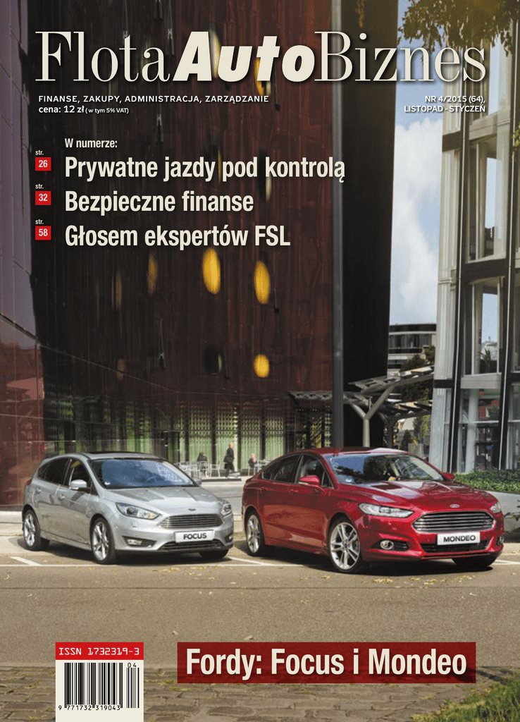 FI N A N SE , Z A K U P Y, A D M I N I S T R A C J A , Z A RZĄD ZAN I E cena: 12 zł ( w tym 5% VAT) str. 26 str. 32 str. 58 NR 4/2015 (64), LISTOPAD - STYCZEŃ W numerze: Prywatne jazdy pod kontrolą Bezpieczne finanse Głosem ekspertów FSL Fordy: Focus i Mondeo W Y D A W N I C T W O ZAMÓW PRENUMERATĘ jednego z naszych pism na 2016 rok i pobieraj wersję online przez cały rok na www.eurologistics.pl/prenumerata SPIS TREŚCI Wydawca Eurologistics s.c. Adam Błuś ul. Kubackiego 29 A 62-002 Suchy Las k/Poznania Redakcja ul. Kubackiego 29 A 62-002 Suchy Las k/Poznania Tel. (61) 892 63 60 Fax (61) 892 63 70 www.fab.com.pl Redaktor naczelny Tomasz Czarnecki Tel. (61) 892 63 79 [email protected] Zespół redakcyjny Alicja Kostecka Witold Zygmunt Stali współpracownicy EurotaxGlass’s Info-Ekspert Joanna Nowicka Bloch Jakub Nieszporek Piotr Myszor Kancelaria Ożóg Tomczykowski R. Olszewski, J. Tokarski i Wspólnicy Kancelaria Prawna RP&W Paweł Szyszka Marketing i Promocja Dyrektor Monika Szafrańska-Błuś Project manager Martyna Pielucha +48 515 160 503 [email protected] Adrianna Adamska, Agnieszka Szafrańska, Marcin Sypniewski, Ewelina Wojtkowiak Administracja i prenumerata INFORMACJE................................................................................................................................................ 6 WYDARZENIA............................................................................................................................................ 14 UBEZPIECZENIA Prawda o ubezpieczeniach................................................................................................................................. 22 PRAWO Prywatne jazdy pod kontrolą............................................................................................................................. 26 Kierownik w opałach.......................................................................................................................................... 28 PALIWA Rozwój kompleksowych usług........................................................................................................................... 30 Bezpieczne finanse.............................................................................................................................................. 32 BEZPIECZEŃSTWO Szkoda a CFM...................................................................................................................................................... 34 Wiara ustawodawcy............................................................................................................................................ 36 DEALERZY Sklepy z autami cz. 2........................................................................................................................................... 38 Volvo pod znakiem „90”..................................................................................................................................... 44 PREMIERA Japońska ofensywa.............................................................................................................................................. 45 Dostawcze bezpieczeństwo................................................................................................................................ 45 Przyjaciel nie tylko w pracy .............................................................................................................................. 46 Kompakt po polsku............................................................................................................................................. 47 Rewolucja francuska........................................................................................................................................... 48 Skok na floty......................................................................................................................................................... 49 POJAZDY Nietypowo dla floty............................................................................................................................................. 50 Rodzinne dla menedżerów................................................................................................................................. 51 Sylwia Kwietniewska Tel. (61) 892 63 75 Fax (61) 892 63 70 [email protected] „Czołgiem” w firmie?!......................................................................................................................................... 52 Skład i łamanie FINANSE Internet Głosem ekspertów FSL....................................................................................................................................... 58 Studio Eurologistics www.fab.com.pl Druk Drukarnia Poli Druk Poznań Mrowino, ul. Towarowa 4 Pojedynek gigantów............................................................................................................................................ 53 Nowe oblicze Skandynawii................................................................................................................................. 57 Dekada z PZWLP................................................................................................................................................ 63 Trudy wyboru usługodawcy.............................................................................................................................. 64 ADMINISTRACJA ISSN 1732-3193; INDEKS 384445 Powalczyć o odszkodowanie.............................................................................................................................. 66 Za treść nadesłanych reklam i ogłoszeń redakcja nie odpowiada. Zastrzegamy sobie prawo redagowania nadesłanych materiałów. Prenumerata realizowana przez RUCH S.A: Zamówienia na prenumeratę w wersji papierowej i na e-wydania można składać bezpośrednio na stronie www.prenumerata.ruch.com.pl Ew