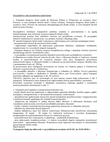 Załącznik Nr 1 do SIWZ Szczegółowy opis przedmiotu zamówienia 1. Transport drogowy dzieł sztuki do Muzeum Pałacu w Wilanowie na wystawę Amor Polonus, w tym transport dwóch dzieł z terenu Ukrainy. Transport drogowy dzieł sztuki z wystawy Amor Polonus do instytucji udostępniających dzieła sztuki, w tym transport dwóch dzieł na teren Ukrainy. Szczegółowy terminarz transportów ustalony zostanie w porozumieniu i za zgodą Zamawiającego oraz instytucji wypoŜyczających dzieła sztuki. Zamieszczona poniŜej lista zabytków zawiera ich przybliŜone wymiary. W przypadku obrazów kaŜdorazowo zaznaczono, czy podane wymiary obejmują ramę. W ramach transportu dzieł sztuki wykonawca zobowiązany jest wykonać następujące prace: - przygotowanie skrzyń do przewozu dzieł sztuki. - zapewnienie materiałów do pakowania, pakowanie obiektów, załadunek, rozładunek, rozpakowanie we wszystkich etapach transportu. - transport drogowy na Ukrainę oznacza kompleksową usługę i obejmuje równieŜ przewóz ukraińskiego kuriera i formalności celne. - w przypadku wymienionych poniŜej zabytków przewidywane są dodatkowe czynności: a) Marmurowa rzeźba Henryk Lubomirski jako Amor z Muzeum-Zamku w Łańcucie: montaŜ rzeźby w przewidzianym na wystawie miejscu oraz przy transporcie powrotnym umieszczenie figury w Muzeum-Zamku w Łańcucie na jej pierwotnym miejscu. Rzeźba wraz z postumentem waŜy ok. 700 kg. b) powieszenie przy transporcie powrotnym na ścianie we wnętrzu pałacu w Nieborowie obrazów wypoŜyczanych z Nieborowa. - w przypadku obrazów z Muzeum Narodowego w Gdańsku (A. Möller, Portret gdańskiej patrycjuszki) i Zamku w Malborku (J. Matejko, Bitwa pod Grunwaldem, szkic) transport powrotny odbędzie się najpóźniej w dn. 29 czerwca. UWAGA: MoŜliwe jest, Ŝe równolegle (w tym samym czasie) będą realizowane 2 lub 3 transporty. Wykonawca musi dysponować odpowiednią ilością samochodów i personelu. Wszystkie czynności związane z obiektami wykonawca realizuje zgodnie z warunkami konserwatorskimi określonymi w pkt. 2. 2. Transport musi spełniać wymogi konserwatorskie tzn.: - kaŜdy obiekt musi być pakowany w odpowiednie materiały (bibułka, fizelina, papier, gąbki, styropian) i transportowany w skrzyniach drewnianych, izolowanych - specjalistyczne opakowania muszą być przed transportem przechowywane i magazynowane w pomieszczeniach spełniających warunki konserwatorskie - dopuszcza się transport w jednej skrzyni kilku obrazów o zbliŜonym formacie, pod warunkiem umieszczenia sztywnych przekładek pomiędzy obrazami - rzeźby i obiekty rzemiosła artystycznego pakowane muszą być w oddzielne skrzynie - zabrania się ustawiania skrzyń piętrowo - kabina ładunkowa musi być dobrze resorowana, klimatyzowana (moŜliwość utrzymania temperatury 18 stopni – 20 stopni C), właściwie izolowana i szczelna, dysponująca urządzeniami do unieruchamiania skrzyń we właściwej pozycji, - samochód musi być wyposaŜony w platformę – podnośnik hydrauliczny, - przy pakowaniu, rozpakowywaniu i w trakcie wszystkich etapów transportu uczestniczyć musi kurier – reprezentant Muzeum. Wykonawca musi zapewnić mu miejsce w samochodzie przewoŜącym dzieła sztuki. PRZYWOZY Transporty będą się odbywały w przybliŜonym terminie od 01.03. do 22.03.2010 r. 1 Miejsce przechowywania Wymiary (w cm) Numer inw. Materiał Szabla hetmana wielkiego koronnego Stanisława śółkiewskiego (bez klingi). dł. 103, 2 drewno, srebro kute, trybowane, ryte i cyzelowane, złoto kute, Bez numeru kamienie jubilerskie Portret gdańskiej patrycjuszki 103 x 80 (wymiary bez ram) MNG/SD/28 tempera i olej na desce 7/M 67x52 (wymiary bez ram) Gl/Sz/3828 Chłopiec ze szczygłem Henryk Lubomirski jako geniusz sławy 109x86,5 (wymiary bez ram) MPK/MR/48 12,2 x 17 x 12,4 brąz, turkusy; odlewanie, złocenie, rytowanie, Bez numeru puncowanie Obiekt CZĘSTOCHOWA Częstochowa, Klasztor paulinów na Jasnej Górze GDAŃSK Gdańsk, Muzeum Narodowe GLIWICE Gliwice, Muzeum w Gliwicach KOZŁÓWKA Kozłówka, Muzeum Zamoyskich KRAKÓW Kraków, Katedra na Wawelu Strzemię wielkiego wezyra Kara Mustafy – kopia Kraków, Muzeum Czartoryskich Kraków, Muzeum Czartoryskich Kraków, Muzeum Czartoryskich Kraków, Muzeum Czartoryskich Kraków, Muzeum Czartoryskich Izabela Czartoryska z ksiąŜkami przy klawikordzie Portret Delfiny z Komarów Potockiej Kraków, Muzeum Czartoryskich Kraków, Muzeum Czartoryskich Kraków, Muzeum Czartoryskich Kraków, Muzeum Czartoryskich KsiąŜąt KsiąŜąt 46,2x37,7 54,2x41,4 KsiąŜąt KsiąŜąt KsiąŜąt KsiąŜąt Świątynia Sybilli w Puławach Jan III Sobieski pod Wiedniem Portret Agnieszki spoczynek Tęczyńskich Firlejowej Portret Izabeli (ElŜbiety) spoczynek Flemingów księŜnej Czartoryskiej KsiąŜąt Wierność lub spoczynek KsiąŜąt KsiąŜąt Kraków, Muzeum KsiąŜąt Czartoryskich Portret Fryderyka Chopina Studium nagiej kobiety tzw. Fryne 21,2x30,8 130x195 (wymiary bez ram) 201x131 (wymiary bez ram) olej na desce Olej na płótnie MNK-XV R.3581 MNK-XV R.1239 MNK-XVRr.9 papier Ŝeberkowy z filigranem, grafika papier, grafika papier, grafika Olej na płótnie XII-281 Olej na płótnie XII-371 Olej na płótnie 64x53 (wymiary bez ram) 59x44 (wymiary bez ram) 60x49 (wymiary bez ram) 97x62 (wymiary bez ram) XII-427 Olej na blasze XII-446 Olej na desce XII-413 XII-454 Kraków, Muzeum KsiąŜąt Czartoryskich śupan (wg tradycji Stanisława śółkiewskiego). Burka paradna (wg tradycji własność Stefana Czarnieckiego). Kraków, Muzeum KsiąŜąt Czartoryskich Kraków, Muzeum KsiąŜąt Czartoryskich Buzdygan Stefana Czarnieckiego. Tarcza tzw. wróŜebna króla Jana III Sobieskiego Kraków, Muzeum KsiąŜąt Czartoryskich Szabla ofiarowana Janowi III Sobieskiemu przez papieŜa. dł. całkowita 98 XIV-25 Kraków, Muzeum KsiąŜąt Czartoryskich Buńczuk XIV-736 dł. ok. 140 XIII-1424 dł. tyłu 114,5 XIII-1423 dł. całości 55,5 XIV-422 średnica ok. 