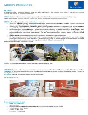 WEEKEND W BARCELONIE 4 DNI PROGRAM: To przepiękne miejsce z prawdziwie katalońską duszą, gdzie ludzie są pełni pasji, a piłka nożna jest niemal religią. To właśnie ukochane miasto Gaudiego stało się sceną dla jego niezwykłych budowli. DZIEŃ 1: Zbiórka na wybranym lotnisku, odprawa i przelot do Barcelony. Transfer do hotelu, zakwaterowanie, obiadokolacja i nocleg. Uwaga! Jeśli pozwolą na to godziny przelotów, w pierwszym i ostatnim dniu będzie realizowany program zwiedzania . DZIEŃ 2-3: Po śniadaniu przejazd na zwiedzanie Barcelony - w programie Słynna ulica La Rambla, uważana za najpiękniejszą aleję świata, mająca swój początek na Placa Catalunya i wiodąca aż do Pomnika Kolumba oraz zabytkowy Port Vell z malowniczą przystanią jachtową Spacer wąskimi uliczkami Barri Gotic do Katedry św. Eulalii - jednej z najpiękniejszych gotyckich budowli w Hiszpanii, urokliwy Placa Reial oraz pobliski Placa de Sant Jaume z Ratuszem oraz Palau de la Generalitat, w którym mieści się siedziba rządu katalońskiego Barcelona Gaudiego - baśniowy Parc Guell, z którego roztacza się wspaniały widok na całą Barcelonę, kościół Sagrada Familia - jeden z najważniejszych symboli miasta, Rambla de Catalunya przecinająca Dzielnicę Eixample oraz spacer wzdłuż Passeig de Gracia, przy której znajdują się dwa najważniejsze domy Gaudiego - Casa Mila ze słynnym dachem oraz kolorowa, wpisana na listę UNESCO Casa Batllo Wzgórze Montjuic ze stadionem olimpijskim oraz Plac Hiszpański z fontanną Jujola i Wieżami Weneckimi Dla chętnych wyjazd na wycieczkę „Barcelona by night” – w programie „magiczne fontanny” – bajkowy spektakl typu światło i dźwięk, wieczorny spacer po tętniącym życiem centrum (35 €, jeśli fontanny będą czynne / w sezonie zimowym nie będzie możliwości wyjazdu na fontanny) oraz wizyta na stadionie Camp Nou - legendarnym stadionie FC Barcelona (wstęp ok. 23 €) Wieczorami powrót do hotelu, obiadokolacja i nocleg. DZIEŃ 4: Po śniadaniu wykwaterowanie. Transfer na lotnisko, odprawa i przelot do kraju. HOTELE 3*/4* położone nad morzem, w znanych miejscowościach wypoczynkowych np. Calella lub Santa Susanna (do 400 m od plaży, ok. 40 km od Barcelony, ok. 50 minut jazdy kolejką do centrum). Wszystkie hotele oferują zakwaterowanie w pokojach 2-osobowych (możliwość 1 dostawki) z łazienką, TV i telefonem. Wyżywienie: Śniadania i obiadokolacje (obydwa posiłki w formie bufetu) PRZYKŁADOWY HOTEL: ŚWIADCZENIA ZAWARTE W CENIE: Przelot na wybranej trasie Opłaty lotniskowe Bagaż podręczny (cena NIE zawiera bagażu głównego, istnieje możliwość dopłaty do dużej walizki) Transfer lotnisko – hotel – lotnisko 3 noclegi w hotelu 3*/4* 3 śniadania + 3 obiadokolacje Pokoje 2-osobowe z łazienkami Opieka pilota Ubezpieczenie podstawowe Signal Iduna (KL, NNW, CHP i bagaż) KOSZTY DODATKOWE: Orientacyjny koszt realizacji programu zwiedzania to ok. 85-95 € (w zależności od wielkości grupy) - kwota ta obejmuje przejazdy komunikacją miejską oraz podmiejską podczas realizacji programu oraz bilety wstępu do zwiedzanych obiektów wraz z kosztami ich rezerwacji (Sagrada Familia, Casa Mila lub Casa Batllo, Park Guell). Cena nie zawiera podatku miejskiego w wysokości 1-2 €/os/noc Cena nie zawiera napojów do obiadokolacji. Opcje dla chętnych (Camp Nou, wycieczka Barcelona by night) są dodatkowo płatne. Wycieczka na fontanny jest realizowana przy min. 10 zgłoszonych osobach. INFORMACJE DODATKOWE: Promocja „S” - promocja dla osób podróżujących w pojedynkę, dokwaterowanie do pokoju 2- lub 3-osobowego Dopłata za pokój 1-osobowy +300-400 zł (w zależności od terminu) Zniżka dla trzeciej osoby w pokoju -100 zł Gwarancja niezmienności ceny +30 zł WYBIERZ SWÓJ BAGAŻ: Cena wycieczki zawiera jedynie bagaż podręczny: Ryanair (wylot z Krakowa, Modlina i Poznania): bagaż podręczny o wadze 10 kg i wymiarach 55x40x20 cm oraz dodatkowy mały bagaż podręczny o wymiarach 35x20x20 cm Wizzair (wylot z Katowic i Warszawy): bagaż podręczny o wymiarach 42x32x25 cm (bagaż mieszczący się pod siedzeniem fotela lotniczego). Za dopłatą można powiększyć bagaż podręczny do wymiarów 56x45x25 cm (bagaż mieszczący się w schowku nad siedzeniami). Istnieje możliwość wykupienia bagażu głównego – ceny bagażu zależą od przewoźnika, trasy i terminu wycieczki, a dodatkowy bagaż przypisany jest do konkretnej osoby. Szczegółowy cennik bagażu znajdziecie na stronie www.matimpex.pl w zakładce Katalogi i ceny. Prosimy o wybór bagażu w momencie dokonywania rezerwacji, gdyż w przypadku wykupienia bagażu w późniejszym terminie, jego cena będzie wyższa ok. 20-50 zł (w zależności od taryfy przewoźnika). Ze względów organizacyjnych prosimy o ostateczny wybór opcji bagażu najpóźniej na 4 dni robocze przed planowanym terminem wycieczki – po tym terminie dodanie bagażu może nie być możliwe. Przypominamy, że w bagażu podręcznym nie mogą znajdować się płyny ani żele czy fluidy w opakowaniach większych niż 100 ml oraz ostre narzędzia (noże, metalowe pilniczki do paznokci, nożyczki, itp.). Szczegóły na www.matimpex.pl w zakładce Linie lotnicze. POZOSTAŁE UWAGI: Kolejność zwiedzania może ulec zmianie, jednak wszystkie punkty programu zostaną zrealizowane. Pilot nie oprowadza grupy po wnętrzach muzeów. Spotkanie z pilotem nastąpi na lotnisku w kraju lub w Barcelonie po przylocie. W pojedynczych przypadkach transfer lotniskowy może być realizowany pod opieką lokalnego kierowcy. Transfery lotniskowe realizowane są busem/autokarem, przejazdy do Barcelony kolejką podmiejską lub autokarem (w zależności od wielkości grupy), przejazdy po mieście komunikacją miejską W przypadku przylotu w późnych godzinach wieczornych zamiast obiadokolacji może zostać podana kolacja na zimno. W przypadku wylotu we wczesnych godzinach porannych zamiast śniadania mog