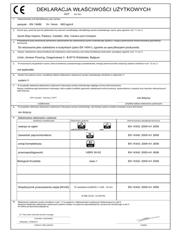 DEKLARACJA WŁAŚCIWOŚCI UŻYTKOWYCH DOP 1. Niepowtarzalny kod identyfikacyjny typu wyrobu: parquet - EN 13489 2. QW 0501 10- 14mm 600 kg/m3 Numer typu, partii lub serii lub jakikolwiek inny element umożliwiający identyfikację wyrobu budowlanego, wyma- gany zgodnie z art. 11 ust. 4: Quick-Step Imperio, Palazzo, Castello, Villa, Variano and Compact 3. Przewidziane przez producenta zamierzone zastosowanie lub zastosowania wyrobu budowlanego zgodnie z mającą zastosowanie zharmonizowaną specyfikacją techniczną: Do stosowania jako wykładzina w budynkach (patrz EN 14041), zgodnie ze specyfikacjami producenta. 4. Nazwa, zastrzeżona nazwa handlowa lub zastrzeżony znak towarowy oraz adres kontaktowy producenta, wymagany zgodnie z art. 11 ust. 5: Unilin, division Flooring, Ooigemstraat 3 - B-8710 Wielsbeke, Belgium 5. W stosownych przypadkach nazwa i adres kontaktowy upoważnionego przedstawiciela, którego pełnomocnictwo obejmuje zadania określone w art. 12 ust. 2: not applicable 6. System lub systemy oceny i weryfikacji stałości właściwości użytkowych wyrobu budowlanego określone w załączniku V: system 3 7. W przypadku deklaracji właściwości użytkowych dotyczącej wyrobu budowlanego objętego normą zharmonizowaną: Nazwa notyfikowanego laboratorium testowego, które wydało certyfikat zgodności zakładowej kontroli produkcji, sprawozdania z inspekcji oraz raportów obliczeniowych (jeśli dotyczy). 8. EPH -Dresden - Germany, CWFT nie dotyczy notyfikowana certyfikat stałości właściwości użytkowych W przypadku deklaracji właściwości użytkowych dotyczącej wyrobu budowlanego, dla którego wydana została europejska ocena techniczna: nie dotyczy 9. Deklarowane właściwości użytkowe Zasadnicze charakterystyki Właściwości użytkowe Zharmonizowana specyfikacja techniczna reakcja na ogień EN 14342: 2005+A1 2008 oak/Eiche/Chêne rest Zawartość pięciochlorofenol EN 14342: 2005+A1 2008 emisji formaldehydu EN 14342: 2005+A1 2008 przeciwpoślizgowość Biological Durability Współczynnik przewodzenia ciepła [W/mK] USRV 50-52 EN 14342: 2005+A1 2008 class 1 EN 14342: 2005+A1 2008 Th resistance (m2K/W) = 0,08 - 10 mm EN 14342: 2005+A1 2008 0,106 (12,5) - 0,127(14) 10. Właściwości użytkowe wyrobu określone w pkt 1 i 2 są zgodne z właściwościami użytkowymi deklarowanymi w pkt 9. Niniejsza deklaracja właściwości użytkowych wydana zostaje na wyłączną odpowiedzialność producenta określonego w pkt 4. W imieniu producenta podpisał(-a): Dr. Theo Smet, technical services manager (nazwisko i stanowisko) Wielsbeke, 10/06/2013 (miejsce i data wydania) (podpis)