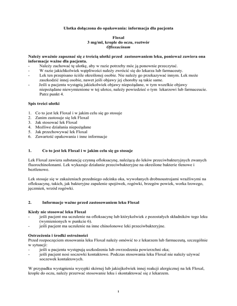 Ulotka dołączona do opakowania: informacja dla pacjenta Floxal 3 mg/ml, krople do oczu, roztwór Ofloxacinum Należy uważnie zapoznać się z treścią ulotki przed zastosowaniem leku, ponieważ zawiera ona informacje ważne dla pacjenta. Należy zachować tę ulotkę, aby w razie potrzeby móc ją ponownie przeczytać. W razie jakichkolwiek wątpliwości należy zwrócić się do lekarza lub farmaceuty. Lek ten przepisano ściśle określonej osobie. Nie należy go przekazywać innym. Lek może zaszkodzić innej osobie, nawet jeśli objawy jej choroby są takie same. Jeśli u pacjenta wystąpią jakiekolwiek objawy niepożądane, w tym wszelkie objawy niepożądane niewymienione w tej ulotce, należy powiedzieć o tym lekarzowi lub farmaceucie. Patrz punkt 4. Spis treści ulotki 1. 2. 3. 4. 5. 6. 1. Co to jest lek Floxal i w jakim celu się go stosuje Zanim zastosuje się lek Floxal Jak stosować lek Floxal Możliwe działania niepożądane Jak przechowywać lek Floxal Zawartość opakowania i inne informacje Co to jest lek Floxal i w jakim celu się go stosuje Lek Floxal zawiera substancję czynną ofloksacynę, należącą do leków przeciwbakteryjnych zwanych fluorochinolonami. Lek wykazuje działanie przeciwbakteryjne na określone bakterie tlenowe i beztlenowe. Lek stosuje się w zakażeniach przedniego odcinka oka, wywołanych drobnoustrojami wrażliwymi na ofloksacynę, takich, jak bakteryjne zapalenie spojówek, rogówki, brzegów powiek, worka łzowego, jęczmień, wrzód rogówki. 2. Informacje ważne przed zastosowaniem leku Floxal Kiedy nie stosować leku Floxal jeśli pacjent ma uczulenie na ofloksacynę lub którykolwiek z pozostałych składników tego leku (wymienionych w punkcie 6). jeśli pacjent ma uczulenie na inne chinolonowe leki przeciwbakteryjne. Ostrzeżenia i środki ostrożności Przed rozpoczęciem stosowania leku Floxal należy omówić to z lekarzem lub farmaceutą, szczególnie w sytuacji: jeśli u pacjenta występują uszkodzenia lub owrzodzenia powierzchni oka; jeśli pacjent nosi soczewki kontaktowe. Podczas stosowania leku Floxal nie należy używać soczewek kontaktowych. W przypadku wystąpienia wysypki skórnej lub jakiejkolwiek innej reakcji alergicznej na lek Floxal, krople do oczu, należy przerwać stosowanie leku i skontaktować się z lekarzem. 1 W razie konieczności lekarz prowadzący zastosuje odpowiednie leczenie. Podczas stosowania kropli do oczu Floxal należy unikać nadmiernej ekspozycji na światło słoneczne lub promieniowanie ultrafioletowe (np. lampy kwarcowe, solarium, itd.) w związku z możliwością wystąpienia reakcji nadwrażliwości na światło. Długotrwałe stosowanie leku Floxal może prowadzić do namnożenia się drobnoustrojów chorobotwórczych, które będą niewrażliwe na ten lek. W przypadku wystąpienia takiej sytuacji lekarz zastosuje odpowiednie leczenie. Dzieci i młodzież Nie zaleca się stosowania leku u dzieci poniżej 1. roku życia, ponieważ nie ustalono jego bezpieczeństwa i skuteczności stosowania w tej grupie wiekowej. Ze względu na brak wystarczających danych, stosowanie leku Floxal, krople do oczu u noworodków z zapaleniem spojówek nie jest zalecane. Lek Floxal a inne leki Należy powiedzieć lekarzowi lub farmaceucie o wszystkich lekach stosowanych przez pacjenta obecnie lub ostatnio, a także o lekach, które pacjent planuje stosować. Jeśli lek Floxal, krople do oczu, jest stosowany jednocześnie z innymi kroplami lub maściami do oczu, należy zachować 15 minutowy odstęp pomiędzy podaniem stosowanych leków. Maść do oczu należy zawsze stosować jako ostatni lek. Ciąża, karmienie piersią i wpływ na płodność Jeśli pacjentka jest w ciąży lub karmi piersią, przypuszcza że może być w ciąży lub gdy planuje mieć dziecko, powinna poradzić się lekarza lub farmaceuty przed zastosowaniem tego leku. Lekarz podejmie decyzję, czy pacjentka może zastosować lek Floxal, krople do oczu. Ofloksacyna nie miała wpływu na płodność u zwierząt. Prowadzenie pojazdów i obsługiwanie maszyn Bezpośrednio po podaniu kropli do worka spojówkowego może wystąpić krótkotrwałe, przemijające pogorszenie ostrości widzenia. Do momentu całkowitego ustąpienia tych objawów nie należy prowadzić pojazdów ani obsługiwać maszyn. Lek Floxal, krople do oczu zawiera benzalkoniowy chlorek Lek może powodować podrażnienie oczu. Należy unikać kontaktu leku z miękkimi soczewkami kontaktowymi. Należy usunąć soczewki kontaktowe przed zastosowaniem leku i odczekać co najmniej 15 minut przed ponownym założeniem soczewek. Benzalkoniowy chlorek zmienia zabarwienie soczewek kontaktowych. 3. Jak stosować lek Floxal Ten lek należy zawsze stosować zgodnie z zaleceniami lekarza lub farmaceuty. W razie wątpliwości należy zwrócić się do lekarza lub farmaceuty. Zalecana dawka Przeciętnie 1 kropla 4 razy na dobę. Wkraplać do worka spojówkowego zakażonego oka. 2 Instrukcja podawania leku: 1. Dokładnie umyć ręce. 2. Odkręcić zakrętkę zabezpieczającą. 3. Butelkę skierować końcówką zakraplacza w dół, trzymając kciukiem i palcem wskazującym. 4. Odchylić głowę do tyłu. 5. Palcem wskazującym delikatnie odciągnąć w dół dolną powiekę, tak aby między gałką oczną a powieką utworzyła się „kieszonka”, do której będą wprowadzane krople. 6. Przybliżyć końcówkę zakraplacza do oka, nie dotykając nią oka, powieki, okolic oka ani innych powierzchni. 7. Delikatnie nacisnąć na butelkę w celu uwolnienia kropli. 8. Patrząc w górę, podać 1 kroplę leku do oka. W przypadku niepowodzenia czynność powtórzyć. 9. Kilka razy delikatnie otworzyć i zamknąć oko, aby kropla pokryła całą jego powierzchnię. 10. Zamknąć powiekę i ucisnąć palcem wewnętrzny kącik oka u nasady nosa. Pozwoli to zminimalizować ryzyko przedostania się leku do całego organizmu. 11. Jeśli krople mają być podawane do obu oczu, opisane powyżej czynnośc