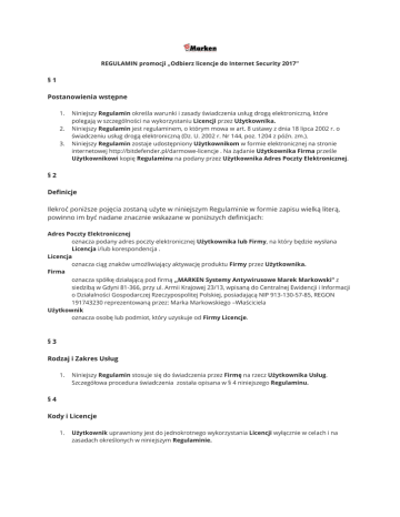 REGULAMIN promocji „Odbierz licencje do Internet Security 2017” §1 Postanowienia wstępne 1. 2. 3. Niniejszy Regulamin określa warunki i zasady świadczenia usług drogą elektroniczną, które polegają w szczególności na wykorzystaniu Licencji przez Użytkownika. Niniejszy Regulamin jest regulaminem, o którym mowa w art. 8 ustawy z dnia 18 lipca 2002 r. o świadczeniu usług drogą elektroniczną (Dz. U. 2002 r. Nr 144, poz. 1204 z późn. zm.). Niniejszy Regulamin zostaje udostępniony Użytkownikom w formie elektronicznej na stronie internetowej http://bitdefender.pl/darmowe-licencje . Na żądanie Użytkownika Firma prześle Użytkownikowi kopię Regulaminu na podany przez Użytkownika Adres Poczty Elektronicznej. §2 Definicje Ilekroć poniższe pojęcia zostaną użyte w niniejszym Regulaminie w formie zapisu wielką literą, powinno im być nadane znacznie wskazane w poniższych definicjach: Adres Poczty Elektronicznej oznacza podany adres poczty elektronicznej Użytkownika lub Firmy, na który będzie wysłana Licencja i/lub korespondencja . Licencja oznacza ciąg znaków umożliwiający aktywację produktu Firmy przez Użytkownika. Firma oznacza spółkę działającą pod firmą „MARKEN Systemy Antywirusowe Marek Markowski” z siedzibą w Gdyni 81-366, przy ul. Armii Krajowej 23/13, wpisaną do Centralnej Ewidencji i Informacji o Działalności Gospodarczej Rzeczypospolitej Polskiej, posiadającą NIP 913-130-57-85, REGON 191743230 reprezentowaną przez: Marka Markowskiego –Właściciela Użytkownik oznacza osobę lub podmiot, który uzyskuje od Firmy Licencje. §3 Rodzaj i Zakres Usług 1. Niniejszy Regulamin stosuje się do świadczenia przez Firmę na rzecz Użytkownika Usług. Szczegółowa procedura świadczenia została opisana w § 4 niniejszego Regulaminu. §4 Kody i Licencje 1. Użytkownik uprawniony jest do jednokrotnego wykorzystania Licencji wyłącznie w celach i na zasadach określonych w niniejszym Regulaminie. 2. 3. Procedura wykorzystania Licencji przez Użytkownika przebiegać będzie następująco: a. w celu otrzymania Licencji Użytkownik podaje Adres Poczty Elektronicznej na stronie internetowej: http://bitdefender.pl/darmowe-licencje b. następnie Użytkownik podaje dane określone w formularzu elektronicznym, w szczególności Adres Poczty Elektronicznej, oraz zatwierdza niniejszy Regulamin, c. po zatwierdzeniu formularza i wymaganych zgód na Adres Poczty Elektronicznej zostaje wygenerowany i przesłany unikatowa Licencja do produktu. d. Na aktywacje Licencji Użytkownik ma czas 3 miesięcy od momentu otrzymania jej na Adres Poczty Elektronicznej. Użytkownik dokonuje powyżej wymienionych czynności wyłącznie we własnym imieniu. §5 Prawa i obowiązki Firmy 1. 2. Firma zobowiązana jest do: a. świadczenia Usług na zasadach i warunkach określonych w Regulaminie, b. przesyłania Licencji po wypełnieniu formularza na stronie http://bitdefender.pl/darmowelicencje przez Użytkownika zgodnie z postanowieniami niniejszego Regulaminu, Firma zastrzega sobie prawo do zablokowania Licencji Użytkownikowi, który naruszył postanowienia niniejszego Regulaminu lub przepisy prawa. §6 Prawa i obowiązki Użytkownika 1. Użytkownik jest zobowiązany do: a. przestrzegania postanowień Regulaminu, b. wykorzystania Licencji zgodnie z postanowieniami oraz na zasadach i w granicach określonych niniejszym Regulaminem, c. utrzymywania Licencji w poufności, w sposób uniemożliwiający wykorzystanie Licencji przez nieupoważnione podmioty lub osoby, d. prawidłowego określenia i aktualizowania danych Użytkownika, w tym w szczególności Adresu Poczty Elektronicznej, §7 Odpowiedzialność 1. 2. 3. Żadna ze Stron nie ponosi odpowiedzialności za szkody spowodowane siłą wyższą. Z zastrzeżeniem szkody wyrządzonej umyślnie, Użytkownik ponosi wyłączną i pełną odpowiedzialność za wszelkie skutki oraz szkody powstałe po stronie Firmy, Użytkownika lub innej osoby, związane lub wynikające z następujących zdarzeń: a. naruszenia przez Użytkownika jakiegokolwiek postanowienia Regulaminu, b. udostępnienia Licencji podmiotom do tego nieuprawnionym, c. nieznajomością przez Użytkownika przepisów prawa lub wykorzystania przez Użytkownika Usług do działalności sprzecznej z prawem lub dobrymi obyczajami. Z zastrzeżeniem szkody wyrządzonej umyślnie, Firma nie kontroluje, nie weryfikuje ani nie ponosi odpowiedzialności z tytułu szkód wyrządzonych Użytkownikowi lub osobie trzeciej, w szczególności Firma nie odpowiada za szkody powstałe lub związane z: a. zniszczeniem, uszkodzeniem jakiegokolwiek oprogramowania wykorzystywanego przez Użytkownika, b. wprowadzeniem do systemu i na urządzenia Użytkownika jakiegokolwiek szkodliwego oprogramowania (np. wirusów) lub danych, w związku z otrzymaniem, skopiowaniem, c. odczytaniem lub jakimkolwiek wykorzystaniem informacji, zniszczeniem lub uszkodzeniem urządzenia lub oprogramowania posiadanego przez Użytkownika, spadkiem wydajności strony http://bitdefender.pl/darmowe-licencje, utrudnieniami lub uniemożliwieniem korzystania przez Użytkownika z Usług, w związku z masowym wprowadzaniem Kodów przez Użytkowników lub nieautoryzowanymi działaniami osób trzecich (np. ataki typu DDoS). . 4. 5. Firma nie będzie ponosić odpowiedzialności z tytułu szkód wyrządzonych Użytkownikowi w związku z wadami (usterkami) strony internetowej http://bitdefender.pl/darmowe-licencje , brakiem działania lub niewłaściwym jej działaniem, awariami, w tym brakiem możliwości korzystania lub błędnym działaniem Usług spowodowanym brakiem działania lub nieprawidłowym działaniem (np. wadą, awarią) strony internetowej http://bitdefender.pl/darmowe-licencje lub jakiegokolwiek jej elementu. Powyższe wyłączenie odpowiedzialności nie dotyczy szkód wyrządzonych Użytkownikowi z winy umyślnej Firmy. Wyłączenia i ograniczenia odpowiedzialności Firmy dotyczą wszystkich podstaw doch