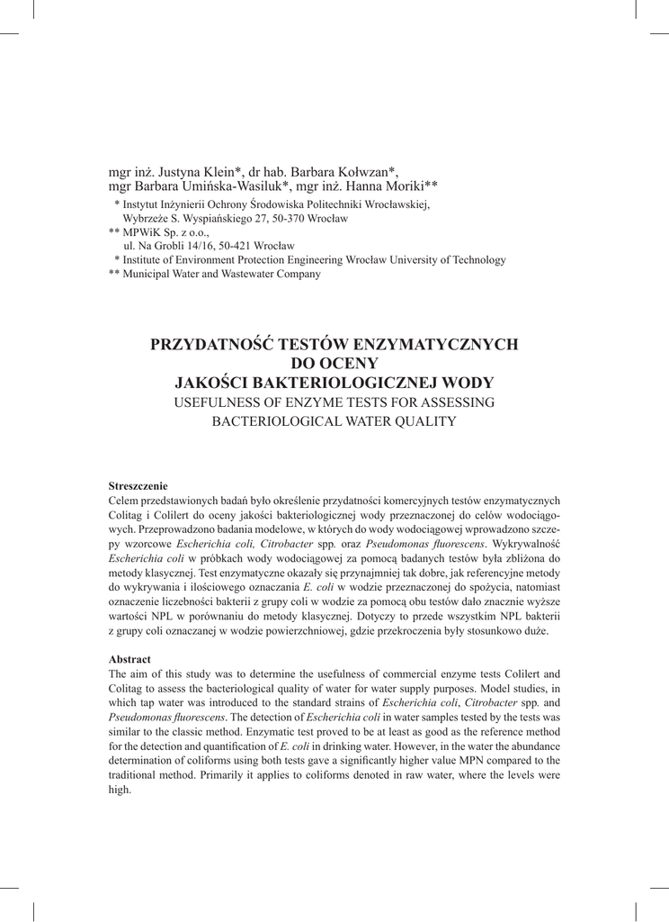 mgr inż. Justyna Klein*, dr hab. Barbara Kołwzan*, mgr Barbara Umińska-Wasiluk*, mgr inż. Hanna Moriki** * Instytut Inżynierii Ochrony Środowiska Politechniki Wrocławskiej, Wybrzeże S. Wyspiańskiego 27, 50-370 Wrocław ** MPWiK Sp. z o.o., ul. Na Grobli 14/16, 50-421 Wrocław * Institute of Environment Protection Engineering Wrocław University of Technology ** Municipal Water and Wastewater Company PRZYDATNOŚĆ TESTÓW ENZYMATYCZNYCH DO OCENY JAKOŚCI BAKTERIOLOGICZNEJ WODY USEFULNESS OF ENZYME TESTS FOR ASSESSING BACTERIOLOGICAL WATER QUALITY Streszczenie Celem przedstawionych badań było określenie przydatności komercyjnych testów enzymatycznych Colitag i Colilert do oceny jakości bakteriologicznej wody przeznaczonej do celów wodociągowych. Przeprowadzono badania modelowe, w których do wody wodociągowej wprowadzono szczepy wzorcowe Escherichia coli, Citrobacter spp. oraz Pseudomonas fluorescens. Wykrywalność Escherichia coli w próbkach wody wodociągowej za pomocą badanych testów była zbliżona do metody klasycznej. Test enzymatyczne okazały się przynajmniej tak dobre, jak referencyjne metody do wykrywania i ilościowego oznaczania E. coli w wodzie przeznaczonej do spożycia, natomiast oznaczenie liczebności bakterii z grupy coli w wodzie za pomocą obu testów dało znacznie wyższe wartości NPL w porównaniu do metody klasycznej. Dotyczy to przede wszystkim NPL bakterii z grupy coli oznaczanej w wodzie powierzchniowej, gdzie przekroczenia były stosunkowo duże. Abstract The aim of this study was to determine the usefulness of commercial enzyme tests Colilert and Colitag to assess the bacteriological quality of water for water supply purposes. Model studies, in which tap water was introduced to the standard strains of Escherichia coli, Citrobacter spp. and Pseudomonas fluorescens. The detection of Escherichia coli in water samples tested by the tests was similar to the classic method. Enzymatic test proved to be at least as good as the reference method for the detection and quantification of E. coli in drinking water. However, in the water the abundance determination of coliforms using both tests gave a significantly higher value MPN compared to the traditional method. Primarily it applies to coliforms denoted in raw water, where the levels were high. 114 1. WSTĘP Bakterie, wirusy i inne mikroorganizmy są szeroko rozpowszechnione w środowisku wodnym, ale tylko niektóre z nich stanowią problem zdrowotny. Źródłem drobnoustrojów chorobotwórczych przenoszonych drogą wodną są najczęściej ścieki oraz spływy powierzchniowe. Możliwość zakażenia ludzi zmusza do stałej kontroli sanitarno-higienicznej zarówno wody przeznaczonej do spożycia, jak również wody w basenach kąpielowych, a także w zbiornikach wodnych mających znaczenie rekreacyjne [12]. Mikroorganizmy chorobotwórcze występują w ściekach i w wodach powierzchniowych w znacznie mniejszych ilościach niż pozostałe drobnoustroje. Dlatego też badania rutynowe koncentrują się przede wszystkim na wykrywaniu bakterii wskazujących na kałowe zanieczyszczenie wody. W sposób klasyczny organizmy wskaźnikowe, takie jak bakterie z grupy coli i Escherichia coli mogą być wykrywane przy wykorzystaniu metody fermentacyjno-probówkowej oraz metodą filtracji membranowej [11, 12]. Wadą tych oznaczeń jest głównie ich czasochłonność. Alternatywnymi w stosunku do metod konwencjonalnych są testy enzymatyczne bazujące na wykrywaniu obecności dwóch konstytutywnych enzymów wytwarzanych przez te bakterie wskaźnikowe: galaktozydazy i glukuronidazy [1, 13]. Efekty działania tych enzymów wykrywane są dzięki zastosowaniu oznaczonych chromogenie lub fluorogennie substratów. Komercyjnie używanych jest kilka tego typu testów takich jak ColitagTM i Colilert (AC). Podstawową zaletą omawianych testów jest wyraźnie skrócenie czasu wykonania analiz do 18÷24 godzin ze względu na brak konieczności wykonywania potwierdzeń [8–10]. Testy okazały się wielkim sukcesem, ale mają także kilka mankamentów [3-5]. Jednym z nich jest fakt, że nie wszystkie szczepy E. coli pochodzące z ludzkich odchodów są fluorogenne. Ponadto mikroalgi i makrofity mogą produkować β-glukuronidazę i β-galaktozydazę, które w dużych stężeniach mogą być przyczyną uzyskiwania wyników fałszywie dodatnich [2]. Testy tego rodzaju mogą być używane zarówno, jako testy jakościowe (obecne/nieobecne), jak i testy ilościowe. Przy czułości 1 mikroorganizm w 100 cm3 badanej próbki testy nie wymagają przygotowywania pożywek, filtrowania próbek ani potwierdzania wyników [6–7]. Celem przedstawionych badań było określenie przydatności testów Colitag i Colilert do oceny jakości bakteriologicznej wody przeznaczonej na cele wodociągowe. 2. MATERIAŁY METODY Materiał do badań mikrobiologicznych stanowiły próbki wody powierzchniowej i wody z sieci wodociągowej. Analizę bakteriologiczną próbek wody wykonano za pomocą testów enzymatycznych oraz metod klasycznych. Zastosowane testy enzymatyczne ColitagTM 115 i Colilert (AC) bazują na wykrywaniu obecności dwóch konstytutywnych enzymów wytwarzanych przez te bakterie wskaźnikowe: galaktozydazy i glukuronidazy. Testy wykonano zgodnie z procedurą podaną przez producentów. W celach porównawczych analizy wykonano metodami referencyjnymi, zgodnie z procedurą ujętą w Polskich Normach: PN-EN ISO 9308-1:2004, PN-75C-04615 ark. 05, PN-77C-04615 ark. 07. 3. WYNIKI BADAŃ Na wstępie wykonano badania modelowe, w których do wody wodociągowej wprowadzono szczepy wzorcowe Escherichia coli, Pseudomonas fluorescens oraz Citrobacter spp. Celem badań było określenie wykrywalności w wodzie bakterii wzorcowych za pomocą testów enzymatycznych. Próbki badane były równolegle metodą tradycyjną i przy zastosowaniu testów enzymatycznych. Wyniki analizy bakteriologicznej wody wodociągowej przeprowadzonej testem Colitag i Colilert