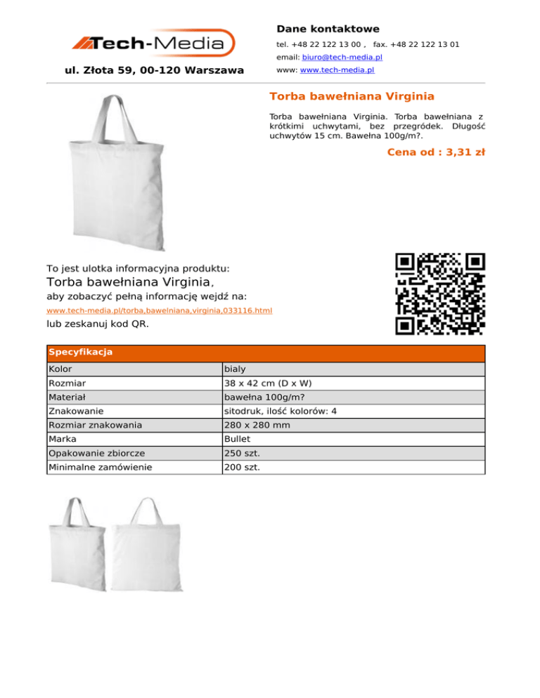 Dane kontaktowe tel. +48 22 122 13 00 , fax. +48 22 122 13 01 email: [email protected] ul. Złota 59, 00-120 Warszawa www: www.tech-media.pl Torba bawełniana Virginia Torba bawełniana Virginia. Torba bawełniana z krótkimi uchwytami, bez przegródek. Długość uchwytów 15 cm. Bawełna 100g/m?. Cena od : 3,31 zł To jest ulotka informacyjna produktu: Torba bawełniana Virginia , aby zobaczyć pełną informację wejdź na: www.tech-media.pl/torba,bawelniana,virginia,033116.html lub zeskanuj kod QR. Specyfikacja Kolor bialy Rozmiar 38 x 42 cm (D x W) Materiał bawełna 100g/m? Znakowanie sitodruk, ilość kolorów: 4 Rozmiar znakowania 280 x 280 mm Marka Bullet Opakowanie zbiorcze 250 szt. Minimalne zamówienie 200 szt.