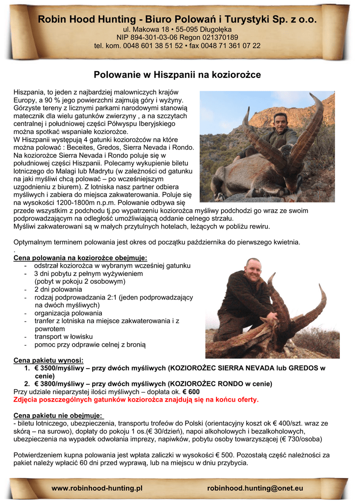 Robin Hood Hunting - Biuro Polowań i Turystyki Sp. z o.o. ul. Makowa 18 • 55-095 Długołęka NIP 894-301-03-06 Regon 021370189 tel. kom. 0048 601 38 51 52 • fax 0048 71 361 07 22 Polowanie w Hiszpanii na koziorożce Hiszpania, to jeden z najbardziej malowniczych krajów Europy, a 90 % jego powierzchni zajmują góry i wyżyny. Górzyste tereny z licznymi parkami narodowymi stanowią matecznik dla wielu gatunków zwierzyny , a na szczytach centralnej i południowej części Półwyspu Iberyjskiego można spotkać wspaniałe koziorożce. W Hiszpanii występują 4 gatunki koziorożców na które można polować : Beceites, Gredos, Sierra Nevada i Rondo. Na koziorożce Sierra Nevada i Rondo poluje się w południowej części Hiszpanii. Polecamy wykupienie biletu lotniczego do Malagi lub Madrytu (w zależności od gatunku na jaki myśliwi chcą polować – po wcześniejszym uzgodnieniu z biurem). Z lotniska nasz partner odbiera myśliwych i zabiera do miejsca zakwaterowania. Poluje się na wysokości 1200-1800m n.p.m. Polowanie odbywa się przede wszystkim z podchodu tj.po wypatrzeniu koziorożca myśliwy podchodzi go wraz ze swoim podprowadzającym na odległość umożliwiającą oddanie celnego strzału. Myśliwi zakwaterowani są w małych przytulnych hotelach, leżących w pobliżu rewiru. Optymalnym terminem polowania jest okres od początku października do pierwszego kwietnia. . Cena polowania na koziorożce obejmuje: - odstrzał koziorożca w wybranym wcześniej gatunku - 3 dni pobytu z pełnym wyżywieniem (pobyt w pokoju 2 osobowym) - 2 dni polowania - rodzaj podprowadzania 2:1 (jeden podprowadzający na dwóch myśliwych) - organizacja polowania - tranfer z lotniska na miejsce zakwaterowania i z powrotem - transport w łowisku - pomoc przy odprawie celnej z bronią Cena pakietu wynosi: 1. € 3500/myśliwy – przy dwóch myśliwych (KOZIOROŻEC SIERRA NEVADA lub GREDOS w cenie) 2. € 3800/myśliwy – przy dwóch myśliwych (KOZIOROŻEC RONDO w cenie) Przy udziale nieparzystej ilości myśliwych – dopłata ok. € 600 Zdjęcia poszczególnych gatunków koziorożca znajdują się na końcu oferty. Cena pakietu nie obejmuje: - biletu lotniczego, ubezpieczenia, transportu trofeów do Polski (orientacyjny koszt ok € 400/szt. wraz ze skórą – na surowo), dopłaty do pokoju 1 os.(€ 30/dzień), napoi alkoholowych i bezalkoholowych, ubezpieczenia na wypadek odwołania imprezy, napiwków, pobytu osoby towarzyszącej (€ 730/osoba) Potwierdzeniem kupna polowania jest wpłata zaliczki w wysokości € 500. Pozostałą część należności za pakiet należy wpłacić 60 dni przed wyprawą, lub na miejscu w dniu przybycia. www.robinhood-hunting.pl [email protected] Robin Hood Hunting - Biuro Polowań i Turystyki Sp. z o.o. ul. Makowa 18 • 55-095 Długołęka NIP 894-301-03-06 Regon 021370189 tel. kom. 0048 601 38 51 52 • fax 0048 71 361 07 22 Dla szczególnie wymagających myśliwych, proponujemy polowanie na koziorożca Beceites Ibex w prywatnym rewirze, położonym ok. 100km od Valencji. W łowisku populacja koziorożców tego gatunku jest bardzo duża i często można trafić na trofea medalowe. Poszukuje się osobników w wieku powyżej 10 lat. W rewirze tym można pozyskać również samice, których trofea są nieco mniejsze od samców. Polowanie odbywa się w stosunku 1:1 (1 podprowadzający:1 myśliwy). Zdjęcia z miejsca zakwaterowania znajdują się poniżej – jest to najwyższej klasy domek myśliwski. Oferta zawiera odstrzał koziorożca Beceite Ibex (max srebrny medal) oraz odstrzał samicy. Cena pakietu z odstrzałem koziorożca Beceite Ibex - € 4200/myśliwy Pozostałe warunki – jak w ofercie dotyczącej koziorożców Sierra Nevada, Gredos i Rondo) www.robinhood-hunting.pl [email protected] Robin Hood Hunting - Biuro Polowań i Turystyki Sp. z o.o. ul. Makowa 18 • 55-095 Długołęka NIP 894-301-03-06 Regon 021370189 tel. kom. 0048 601 38 51 52 • fax 0048 71 361 07 22 Poszczególne rodzaje koziorożców oraz mapka z terenami ich występowania: www.robinhood-hunting.pl Ronda Sierra Nevada Gredos Beceite [email protected]