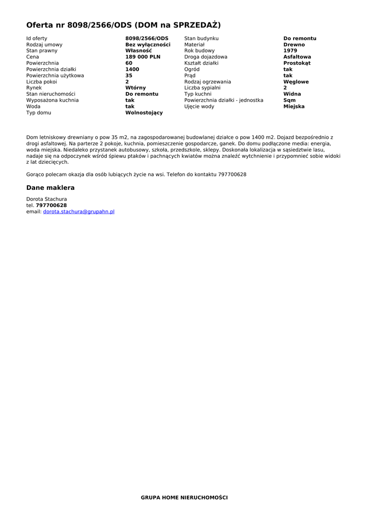 Oferta nr 8098/2566/ODS (DOM na SPRZEDAŻ) Id oferty Rodzaj umowy Stan prawny Cena Powierzchnia Powierzchnia działki Powierzchnia użytkowa Liczba pokoi Rynek Stan nieruchomości Wyposażona kuchnia Woda Typ domu 8098/2566/ODS Bez wyłączności Własność 189 000 PLN 60 1400 35 2 Wtórny Do remontu tak tak Wolnostojący Stan budynku Materiał Rok budowy Droga dojazdowa Kształt działki Ogród Prąd Rodzaj ogrzewania Liczba sypialni Typ kuchni Powierzchnia działki - jednostka Ujęcie wody Do remontu Drewno 1979 Asfaltowa Prostokąt tak tak Węglowe 2 Widna Sqm Miejska Dom letniskowy drewniany o pow 35 m2, na zagospodarowanej budowlanej działce o pow 1400 m2. Dojazd bezpośrednio z drogi asfaltowej. Na parterze 2 pokoje, kuchnia, pomieszczenie gospodarcze, ganek. Do domu podłączone media: energia, woda miejska. Niedaleko przystanek autobusowy, szkoła, przedszkole, sklepy. Doskonała lokalizacja w sąsiedztwie lasu, nadaje się na odpoczynek wśród śpiewu ptaków i pachnących kwiatów można znaleźć wytchnienie i przypomnieć sobie widoki z lat dziecięcych. Gorąco polecam okazja dla osób lubiących życie na wsi. Telefon do kontaktu 797700628 Dane maklera Dorota Stachura tel. 797700628 email: [email protected] GRUPA HOME NIERUCHOMOŚCI Powered by TCPDF (www.tcpdf.org)