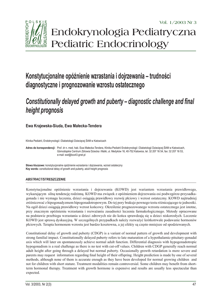 Vol. 1/2003 Nr 3 Endokrynologia Pediatryczna Pediatric Endocrinology Konstytucjonalne opóźnienie wzrastania i dojrzewania – trudności diagnostyczne i prognozowanie wzrostu ostatecznego Constitutionally delayed growth and puberty – diagnostic challenge and final height prognosis Ewa Krajewska-Siuda, Ewa Małecka-Tendera Klinika Pediatrii, Endokrynologii i Diabetologii Dziecięcej ŚAM w Katowicach Adres do korespondencji: Prof. dr n. med. hab. Ewa Małecka-Tendera, Klinika Pediatrii Endokrynologii i Diabetologii Dziecięcej ŚAM w Katowicach, Górnośląskie Centrum Zdrowia Dziecka i Matki, ul. Medyków 16, 40-752 Katowice, tel. 32 207 16 54, fax: 32 207 16 53, e-mail: [email protected] Słowa kluczowe: konstytucjonalne opóźnienie wzrastania i dojrzewania, wzrost ostateczny Key words: constitutional delay of growth and puberty, adult height prognosis ABSTRACT/ ABSTRACT/STRESZCZENIE Konstytucjonalne opóźnienie wzrastania i dojrzewania (KOWD) jest wariantem wzrastania prawidłowego, wykazującym silną tendencję rodzinną. KOWD ma związek z opóźnieniem dojrzewania osi podwzgórze-przysadkagonada i nie wymaga leczenia, dzieci osiągają prawidłowy rozwój płciowy i wzrost ostateczny. KOWD najtrudniej zróżnicować z hipogonadyzmem hipogonadotropowym. Do tej pory brakuje pewnego testu różnicującego te jednostki. Na ogół dzieci osiągają prawidłowy wzrost końcowy. Określenie prognozowanego wzrostu ostatecznego jest istotne, przy znacznym opóźnieniu wzrastania i rozważaniu zasadności leczenia farmakologicznego. Metody opracowane na podstawie przebiegu wzrastania u dzieci zdrowych nie do końca sprawdzają się u dzieci niskorosłych. Leczenie KOWD jest sprawą dyskusyjną. W szczególnych przypadkach należy rozważyć krótkotrwałe podawanie hormonów płciowych. Terapia hormonem wzrostu jest bardzo kosztowna, a jej efekty są często mniejsze od spodziewanych. Constitutional delay of growth and puberty (CDGP) is a variant of normal pattern of growth and development with strong familial impact. Constitutionally delayed puberty refers to late maturation of a hypothalamic-pituitary-gonadal axis which will later on spontaneously achieve normal adult function. Differential diagnosis with hypogonadotropic hypogonadism is a real challenge as there is no test with cut-off values. Children with CDGP generally reach normal adult height after going through a delayed but normal puberty. Occasionally growth retardation is more severe and parents may request information regarding final height of their offspring. Height prediction is made by one of several methods, although none of them is accurate enough as they have been developed for normal growing children and not for children with short stature. Treatment modalities remain controversial. Some children may benefit from shortterm hormonal therapy. Treatment with growth hormone is expensive and results are usually less spectacular than expected. Vol. 3/2003, Nr 2(3) 47 Praca przeglądowa Wstęp Szacuje się, że corocznie w Polsce ponad 200 tys. dzieci zgłasza się do lekarza z powodu zaburzeń wzrastania. Większość z nich stanowią dzieci zdrowe, niewymagające leczenia, które osiągną wzrost końcowy średni lub niski, ale mieszczący się pomiędzy 3 a 50 percentylem [1]. Część z nich to dzieci niskorosłe, których wzrost mieści się poniżej 3 percentyla na siatkach obowiązujących dla danej populacji [2]. Tylko u niewielu z nich niedobór wzrostu jest uwarunkowany hormonalnie lub wynika z anomalii chromosomalnych. U pozostałych jest on spowodowany wystąpieniem wariantów prawidłowego wzrastania – konstytucjonalnie wolnego przebiegu wzrostu i dojrzewania (KOWD) oraz rodzinnie lub genetycznie uwarunkowanego niskiego wzrostu. Dzieci rosnące według tych dwóch odmian normy stanowią 82% wszystkich pacjentów zgłaszających się z powodu niskorosłości [2]. Konstytucjonalnie opóźniony przebieg wzrostu i dojrzewania (KOWD) można uznać za przejściową formę niedoboru wzrostu, będącą wariantem wzrastania prawidłowego [3-6]. Problem ten dotyczy 0,6-2% populacji dziecięcej, głównie chłopców [7]. Objawy kliniczne Dzieci z KOWD charakteryzuje [8-11]: 1) zwolnienie wzrostu liniowego w pierwszych 3 latach życia, z typową zmianą przedziału centylowego na niższy zarówno dla wzrostu, jak i dla masy ciała; 2) prawidłowe lub zbliżone do prawidłowego tempo wzrostu liniowego poniżej lub równolegle do 3 percentyla w okresie przedpokwitaniowym; 3) opóźniony wiek kostny i pokwitanie; 4) wzrost ostateczny w dolnych granicach normy, chociaż często niższy od przewidywanego na podstawie wzrostu rodziców; 5) wywiad rodzinny świadczący, że ojciec lub matka pacjenta w dzieciństwie byli niscy, późno wystąpił u nich pokwitaniowy skok wzrostowy, a u matki pierwsza miesiączka pojawiła się po 15 roku życia (r.ż.) [4, 6, 8]. Szybkość wzrastania w trakcie skoku pokwitaniowego jest mniejsza, ale okres pokwitania jest wydłużony. Ponieważ wzrastanie odbywa się do czasu zamknięcia nasad, wobec tego u dzieci z KOWD może ono trwać do 20 r.ż., a nawet dłużej [12-15]. Opóźnionemu wzrastaniu towarzyszy brak soma48 Endokrynol. Ped., 3/2003;2(3):47-53 tycznych i hormonalnych cech dojrzewania płciowego u chłopców powyżej 14 r.ż., a u dziewcząt powyżej 15 r.ż. Jest to objaw opóźnionego dojrzewania płciowego, na ogół uwarunkowanego rodzinnie [4, 6, 16-18]. Diagnostyka Rozpoznanie KOWD stawia się po wykluczeniu niehormonalnych przyczyn niskorosłości, somatotropinowej niedoczynności przysadki, skąpoobjawowej postaci niedoczynności tarczycy oraz hipogonadyzmu hiper i hipogonadotropowego. Schemat postępowania diagnostycznego w opóźnionym dojrzewaniu przedstawiono na ryc. 1. Szczególnych trudności dostarcza różnicowanie KOWD z hipogonadyzmem hipogonadotropowym. Do tej pory nie ma testu dającego jednoznaczną odpowiedź, czy brak cech dojrzewania u chłopca po 14 r.ż. 