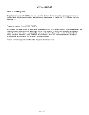 www.lebork.pl Musical we Fregacie Grupa Teatralna „Inferno", GCK Cewice oraz Lęborskie Centrum Kultury „Fregata" zapraszają na musical pod tytułem „Music, drugs and Rock'N'Roll". Przedstawienie odbędzie się 25 maja w Sali LCK „Fregata" przy ulicy Gdańskiej 12. Początek o godzinie 17.00. WSTĘP WOLNY. Music, drugs and Rock 'N' Roll" to wybuchowa mieszanka muzyki, tańca, wielkich emocji i pasji, która sprawia, że marzenia są na wyciągnięcie ręki. W musicalu uliczne życie toczy się swoim rytmem: bossowie wzbudzający szacunek, narkomanii walczą o każdą działkę, czarny rynek kwitnie. Czasami tu i ówdzie słychać nieśmiały dźwięk skrzypiec, fortepianu i gitary. Pewnego dnia na jednej z takich ulic pojawia się Matylda - energiczna reporterka. Od tego momentu nic nie jest już takie jak przedtem. Autorem scenariusza jest Joanna Nowicka. Reżyseria: Dorota Łunecka. strona 1/1 Powered by TCPDF (www.tcpdf.org)